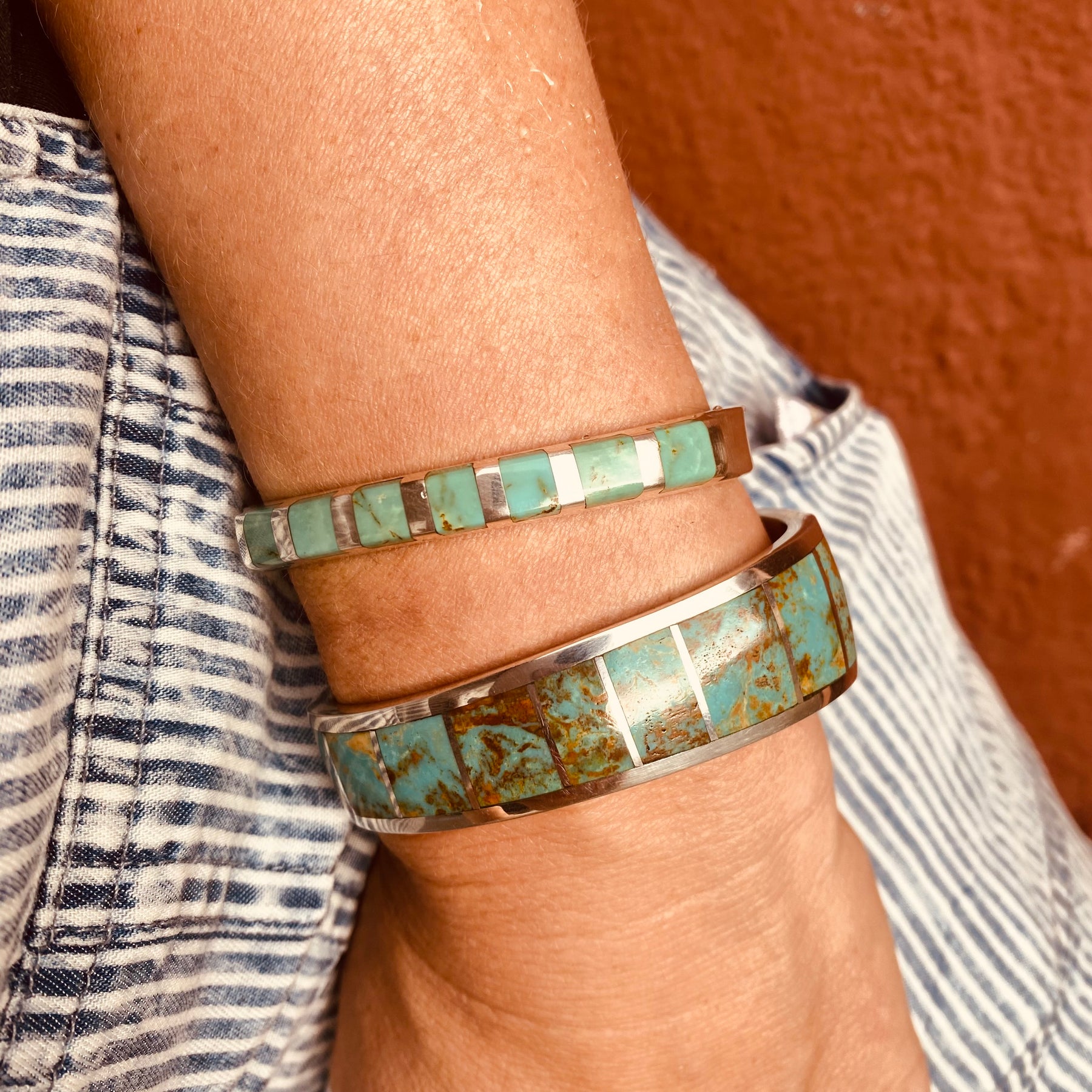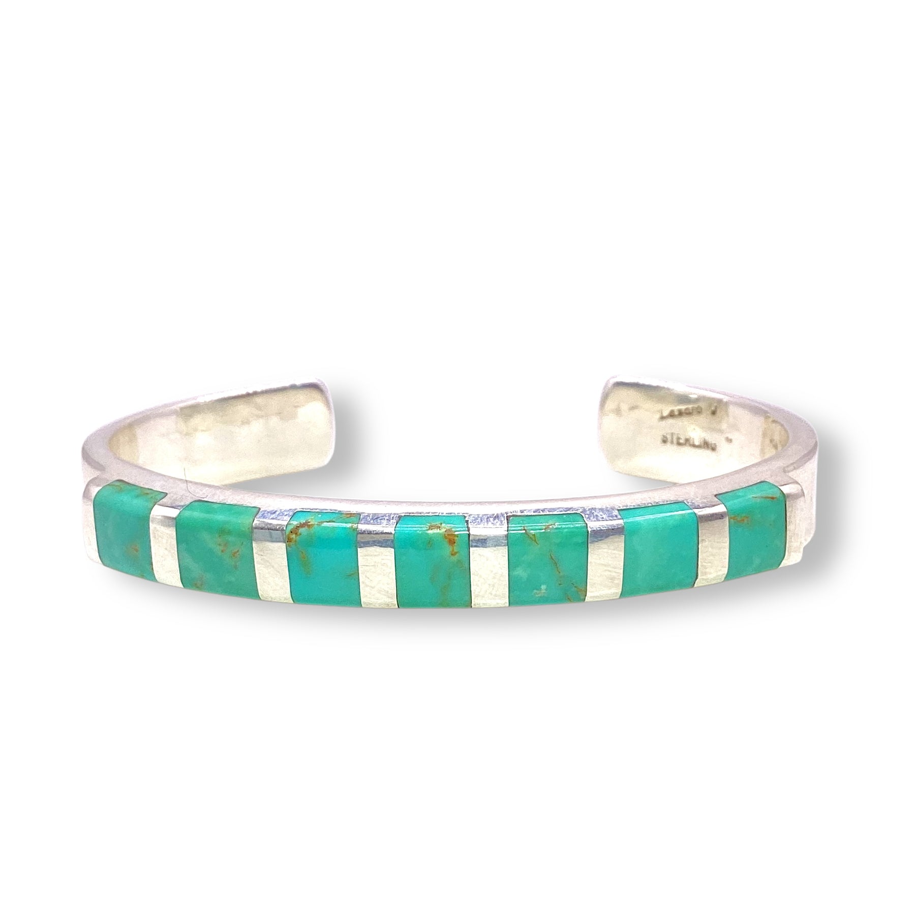 Handcrafted by silversmith Lazaro Gutierrez, this sterling silver cuff shows off perfectly inlaid turquoise tiles in a clean, modern design. It’s a fresh take on tradition with a bold, artisan feel.