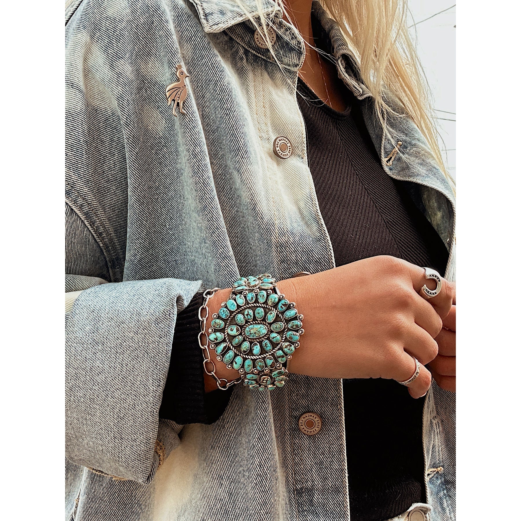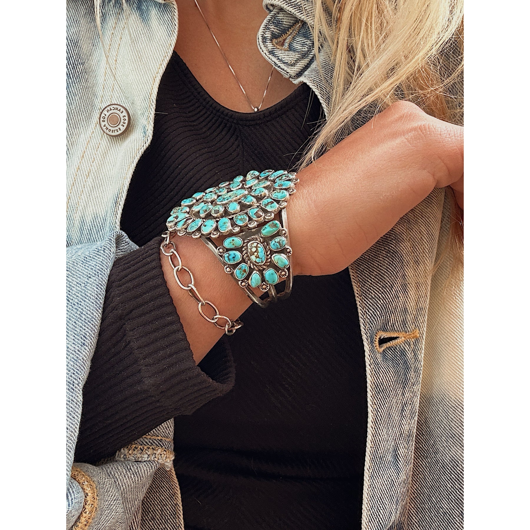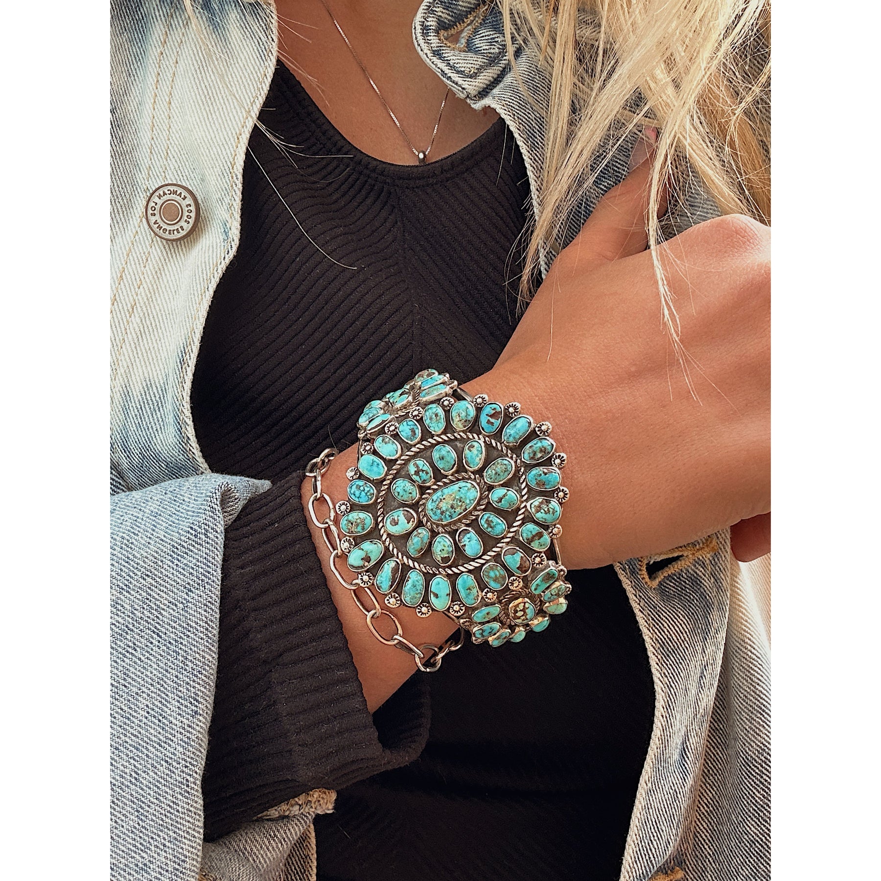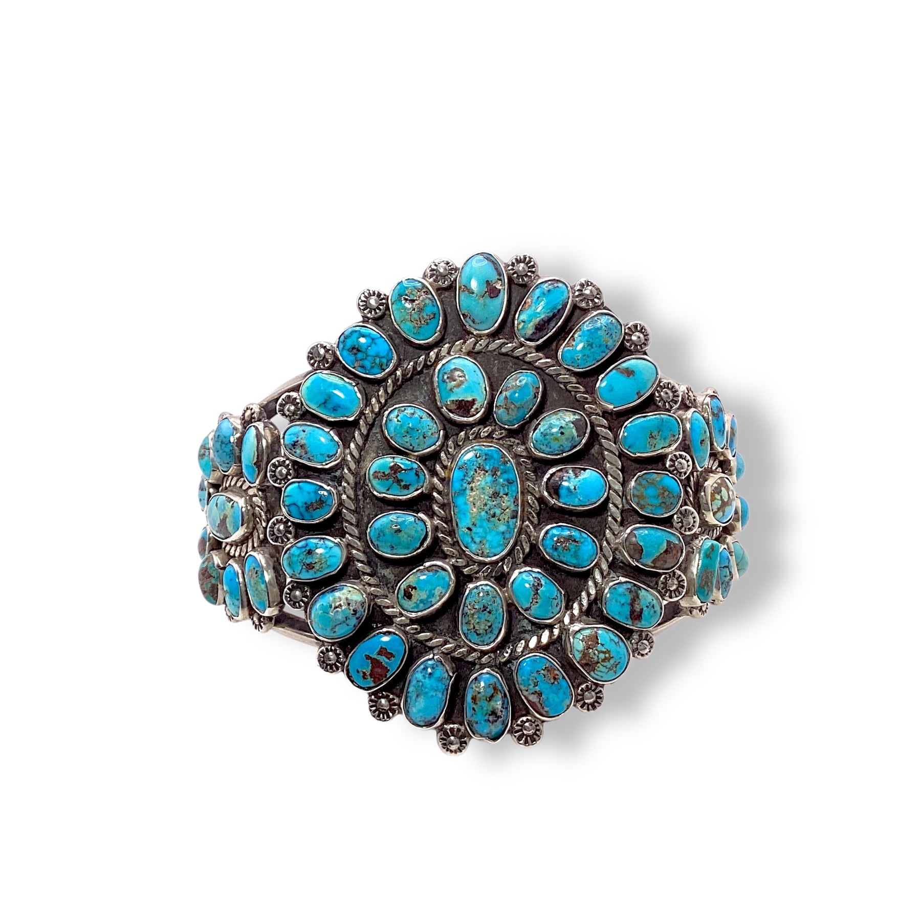 This one stops you in your tracks. Layers of vivid Kingman turquoise set in vintage sterling give it incredible depth and character, with no two stones exactly alike. It has that strong, collected feel — bold, timeless, and unmistakably Southwestern.