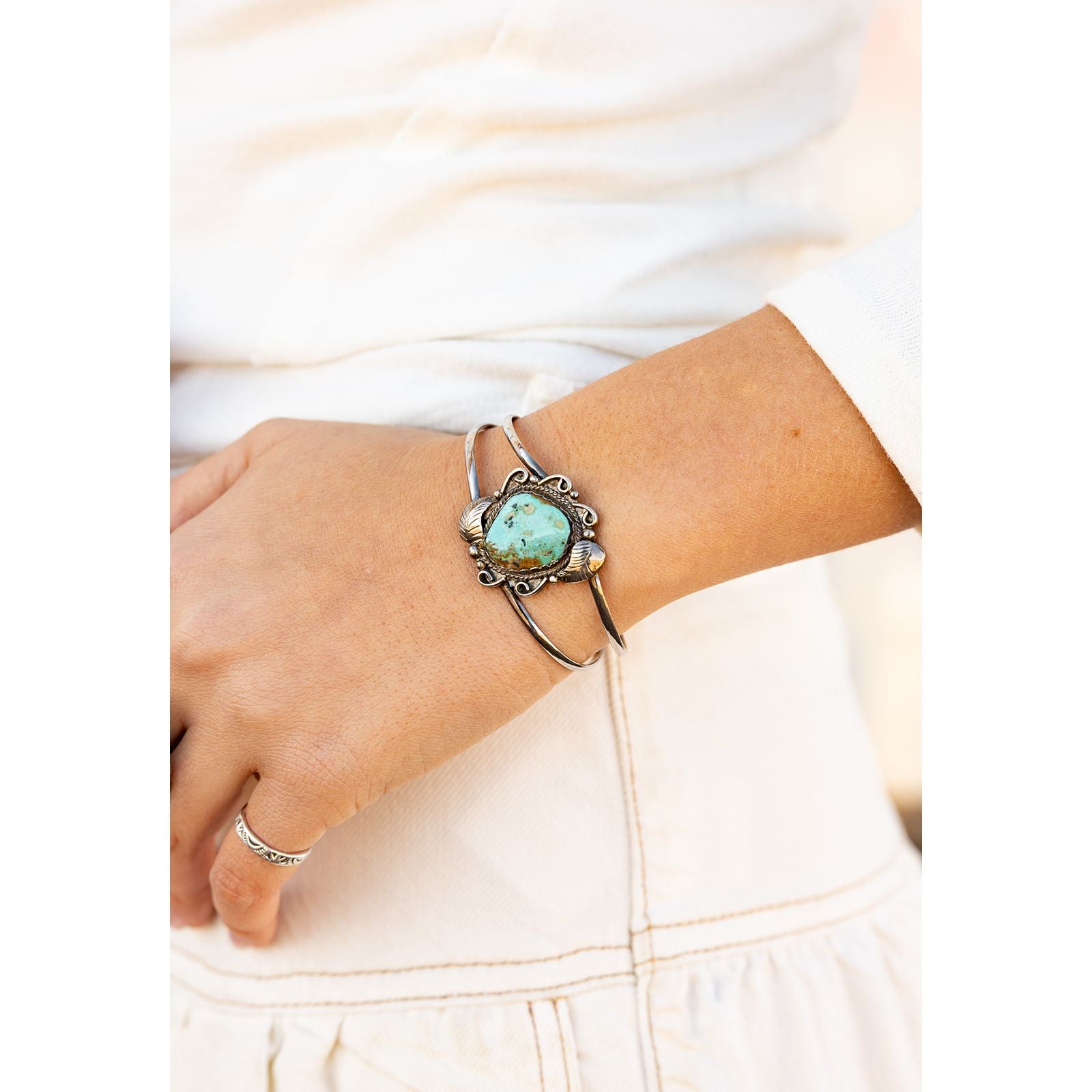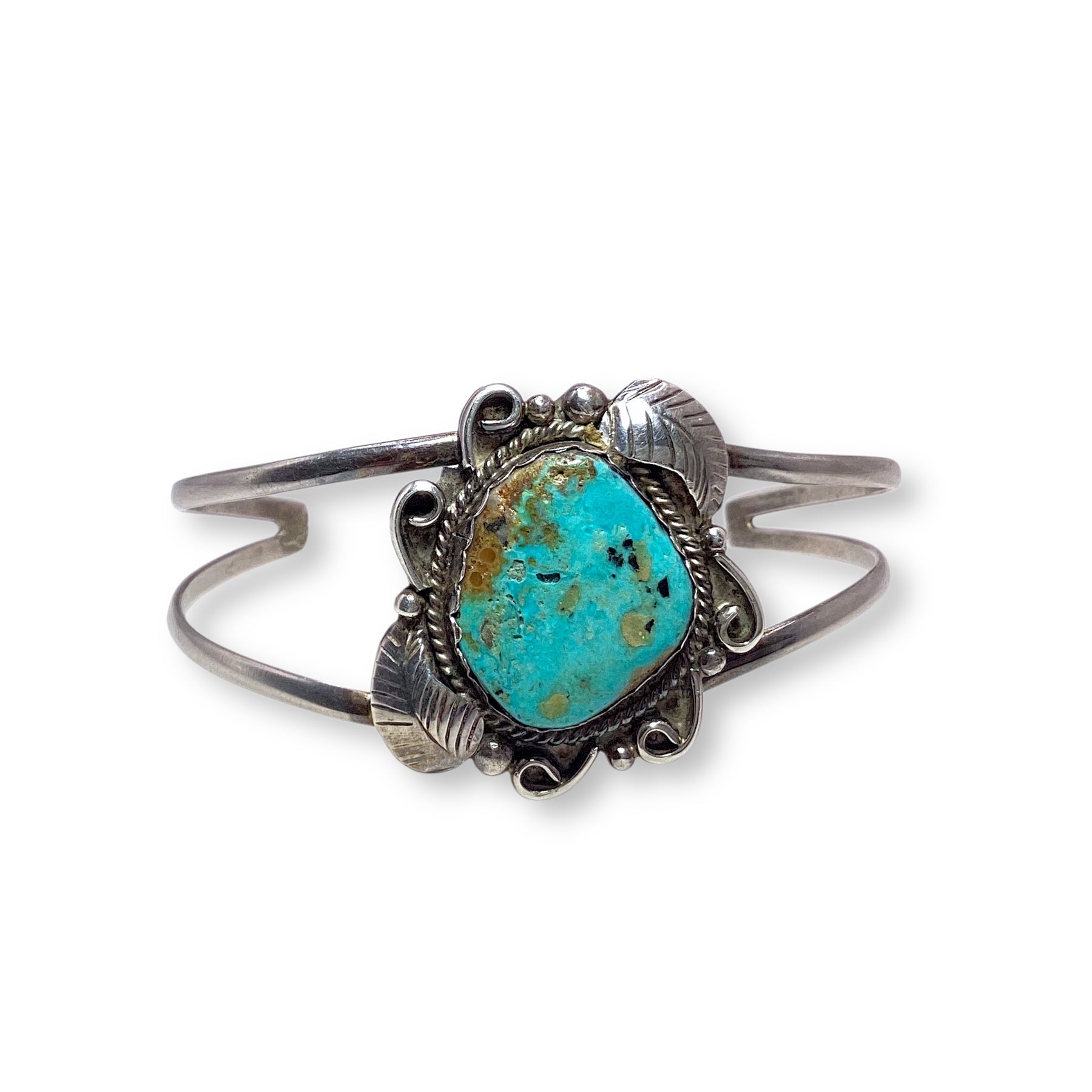 This Vintage Kings Manassa Royston Turquoise and sterling silver cuff is truly something special. Handcrafted and completely one of a kind, it features a beautiful turquoise stone set in rich silverwork that tells a story all its own. Every detail feels intentional, from the patina of time to the artisan touch you can see and feel—making this bracelet a rare treasure meant to be cherished.