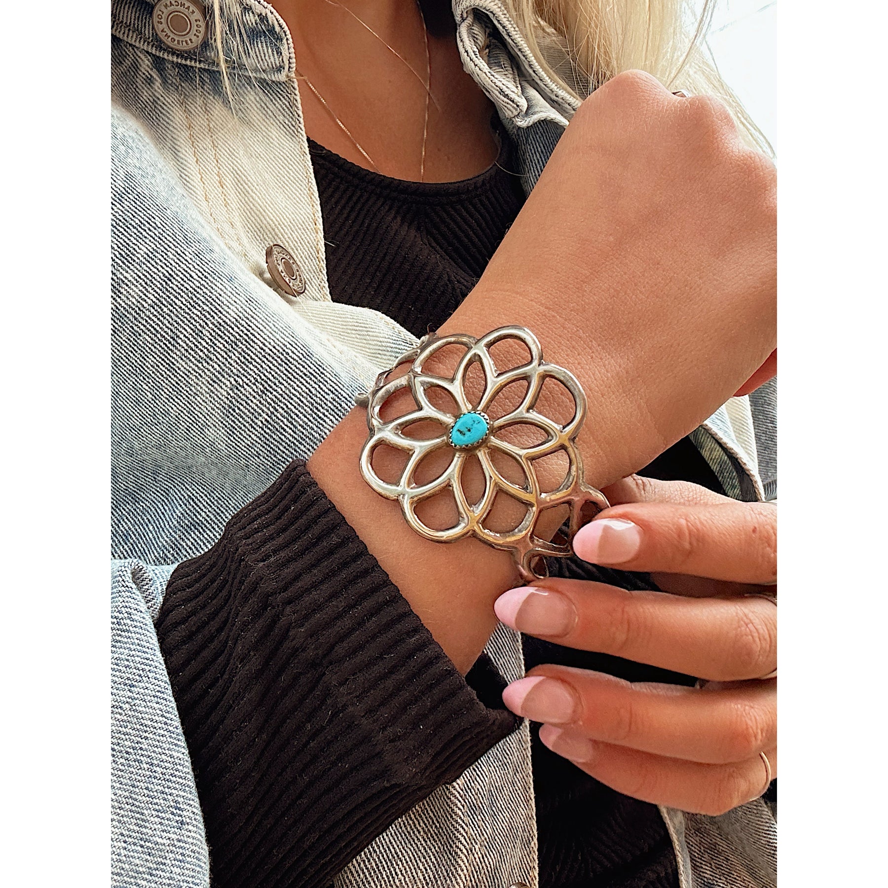 Absolutely stunning estate piece with vintage Sleeping Beauty Turquoise. This giant handmade wire cuff is perfect in its uniqueness. Authentic vintage Native American made.