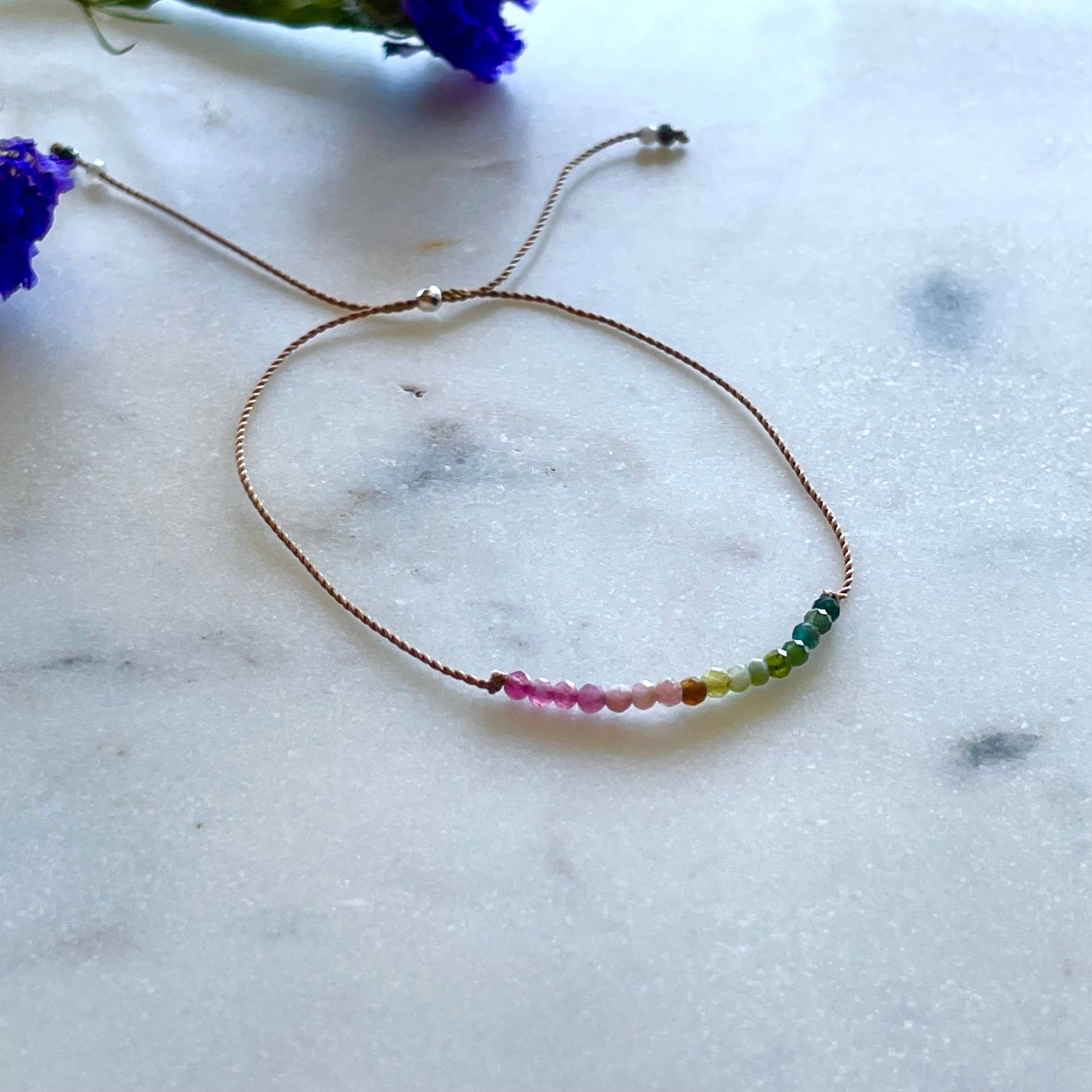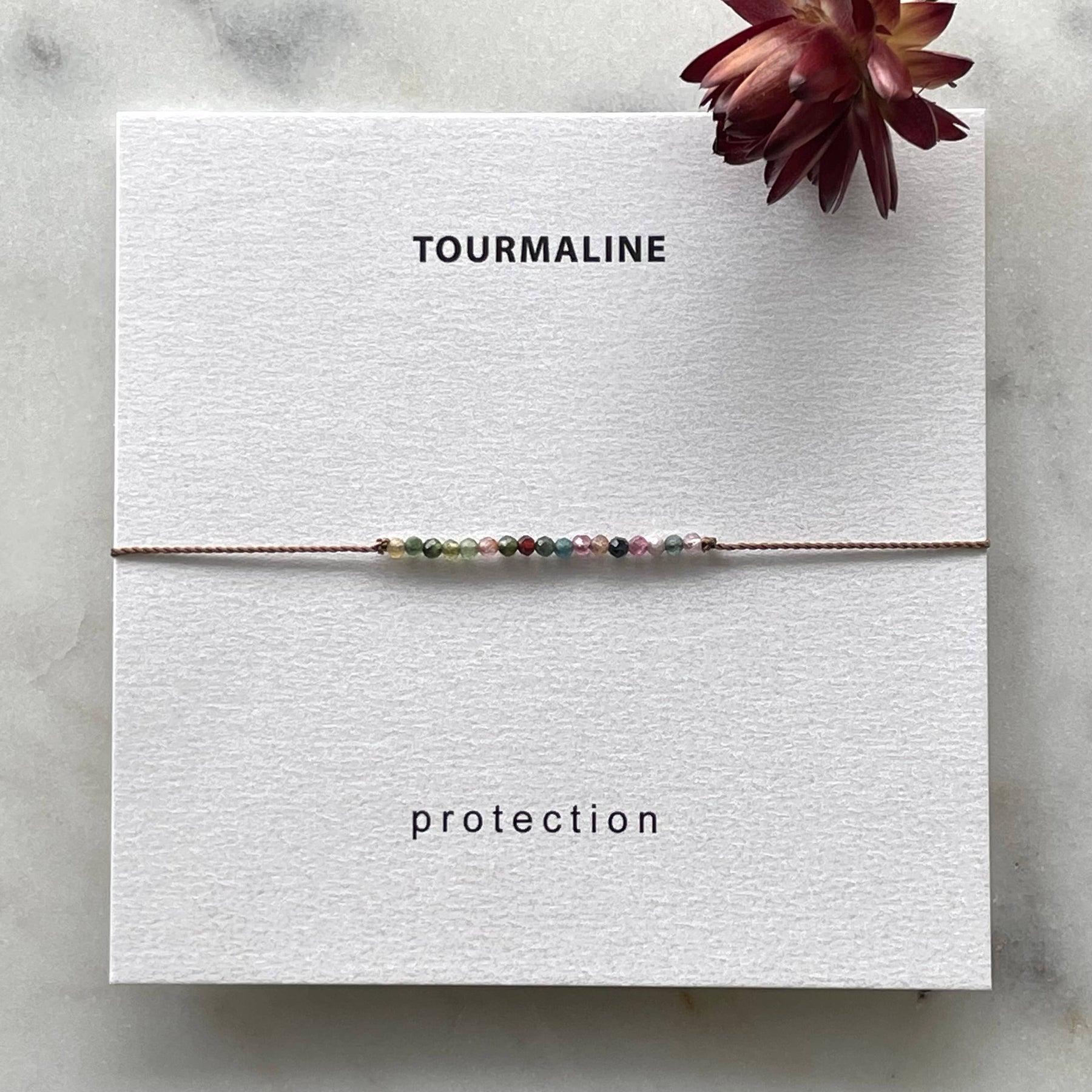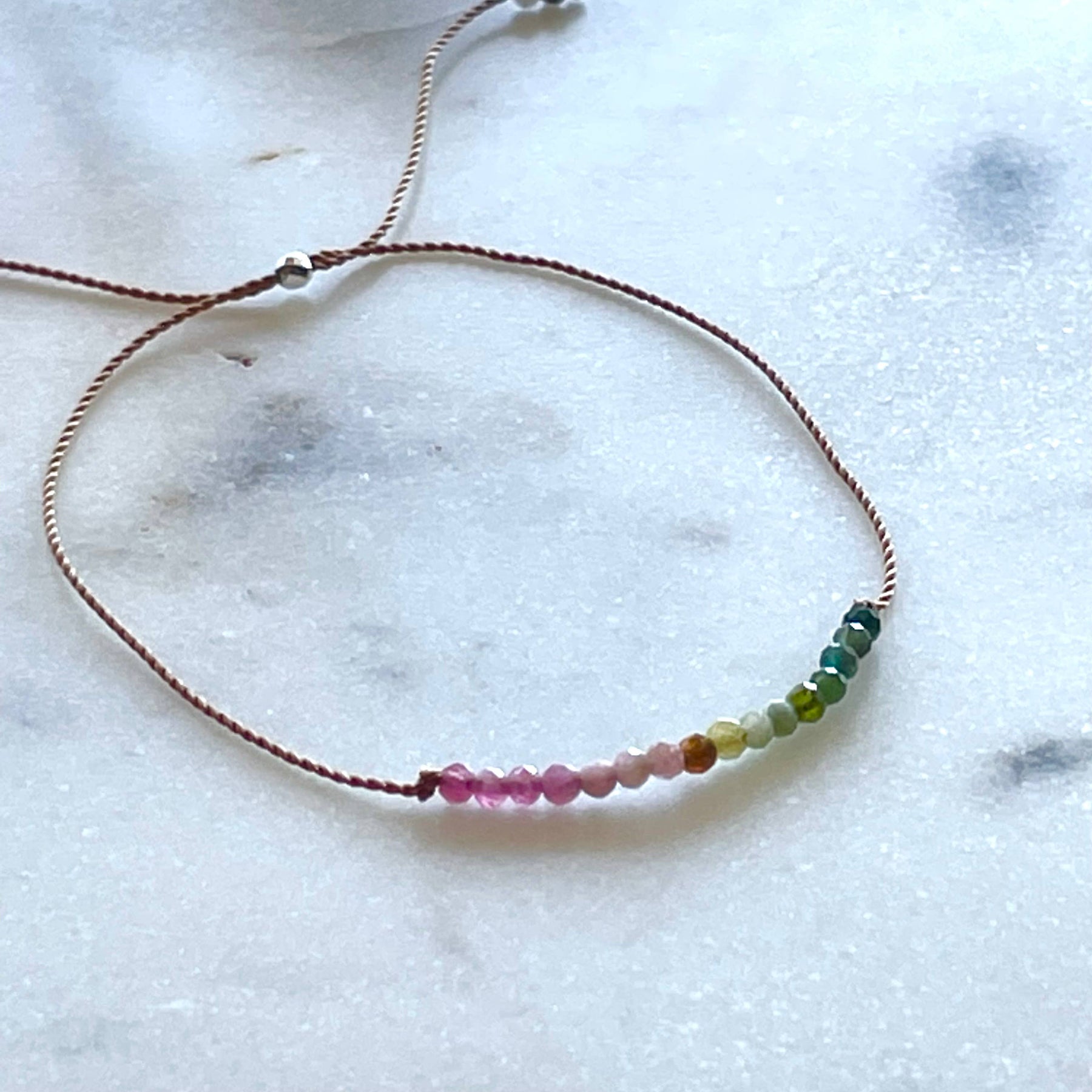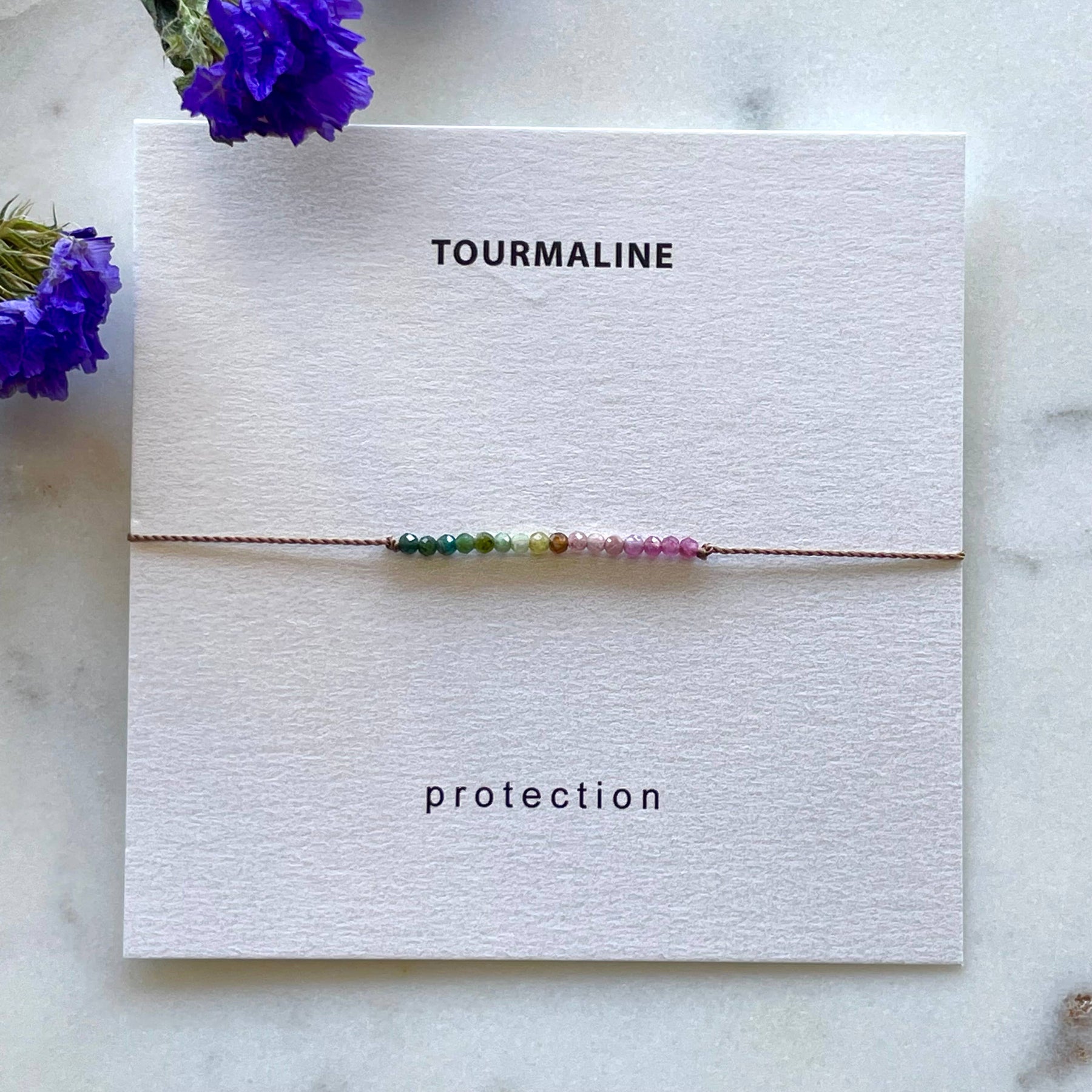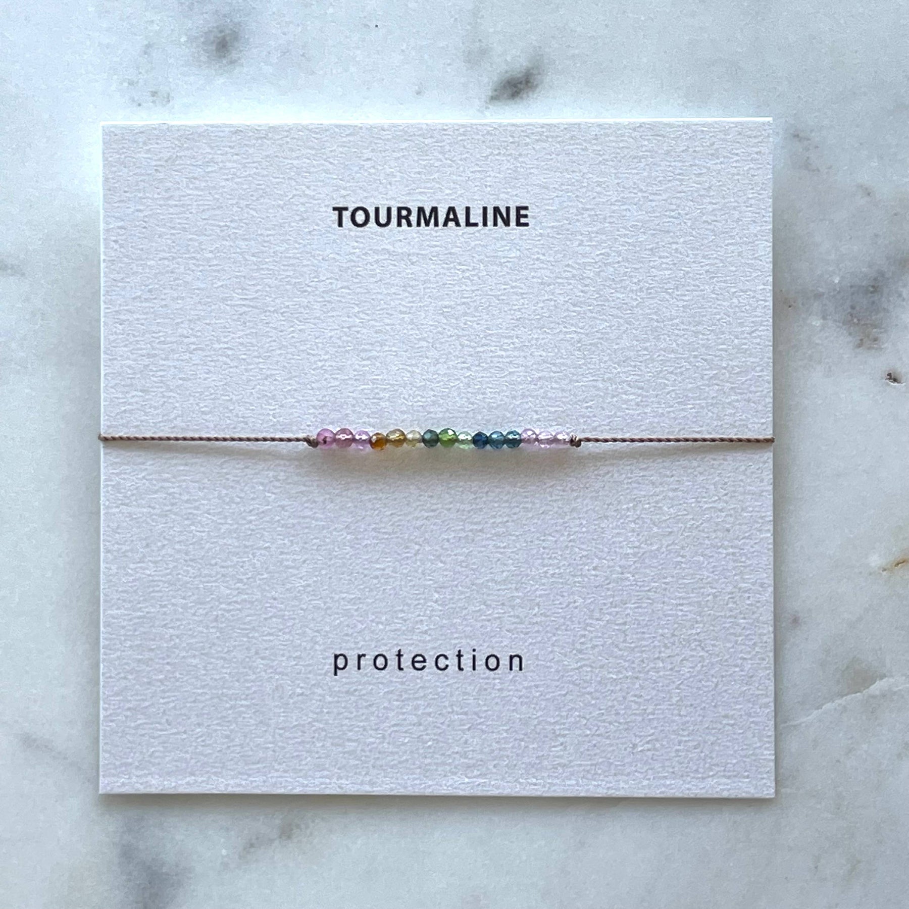 Protection bracelet made with tiny, multicolored watermelon tourmaline gemstone beads hand knotted on thin, durable nylon cord. Adjustable design with sliding bead fits most wrists. Bracelet comes on a pretty card with stone meaning. Makes a lovely gift!