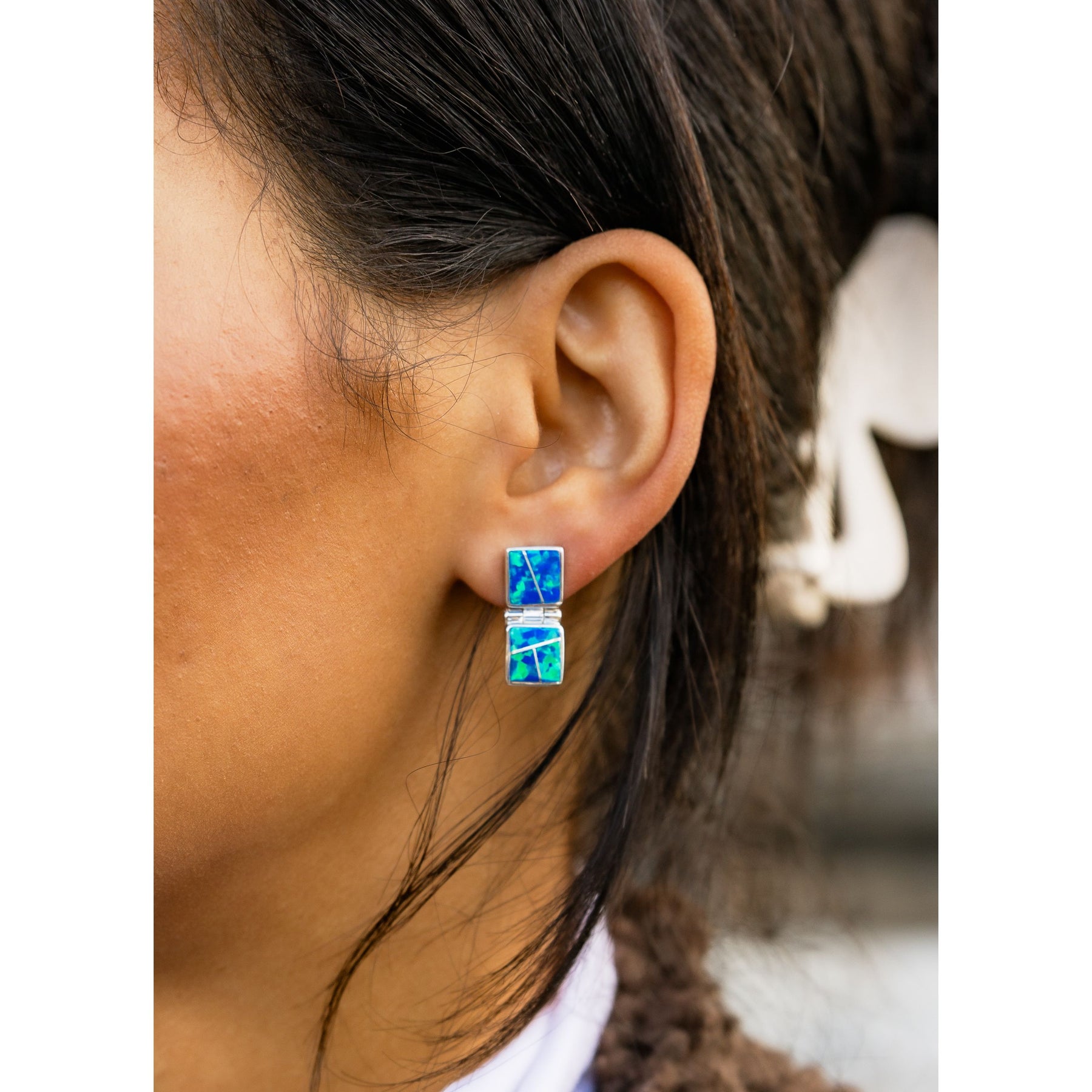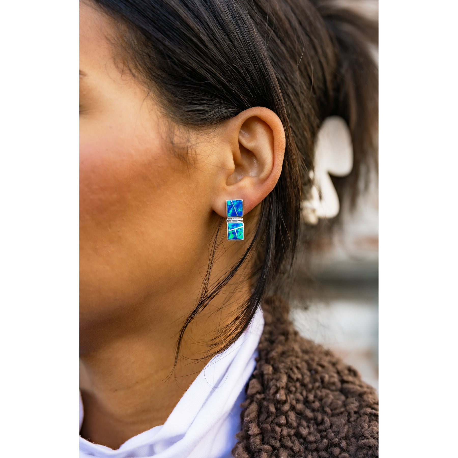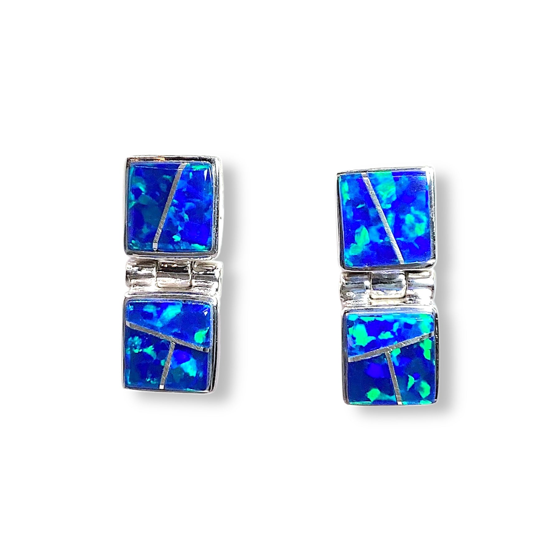 Handcrafted by Navajo artist Calvin Begay, these earrings are a striking blend of bold design and feminine grace. Each earring features two inlaid blue opal squares joined by a sterling silver hinge, creating movement and catching the light with every turn. Vibrant, modern, and full of Southwestern spirit, they make a statement without ever feeling heavy.