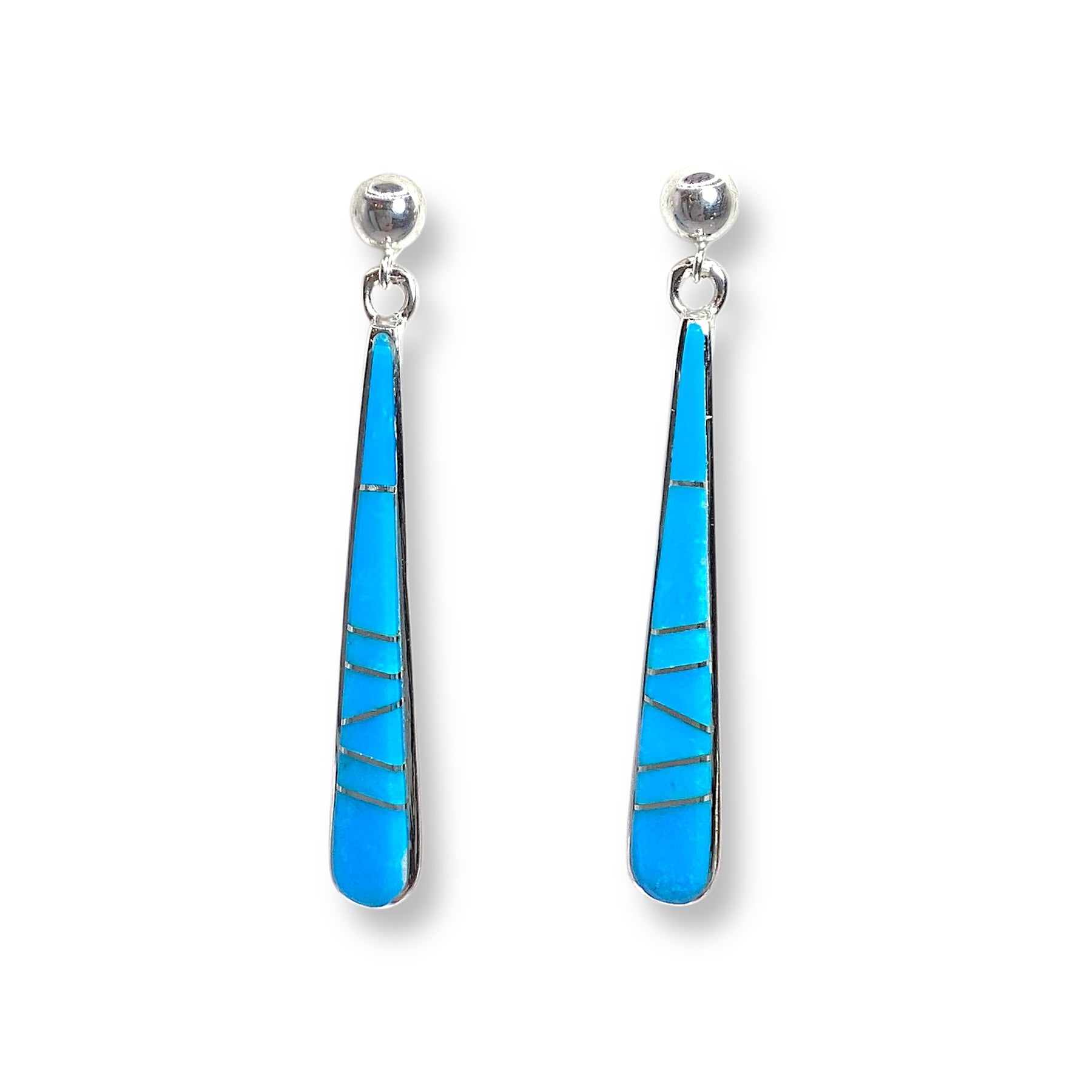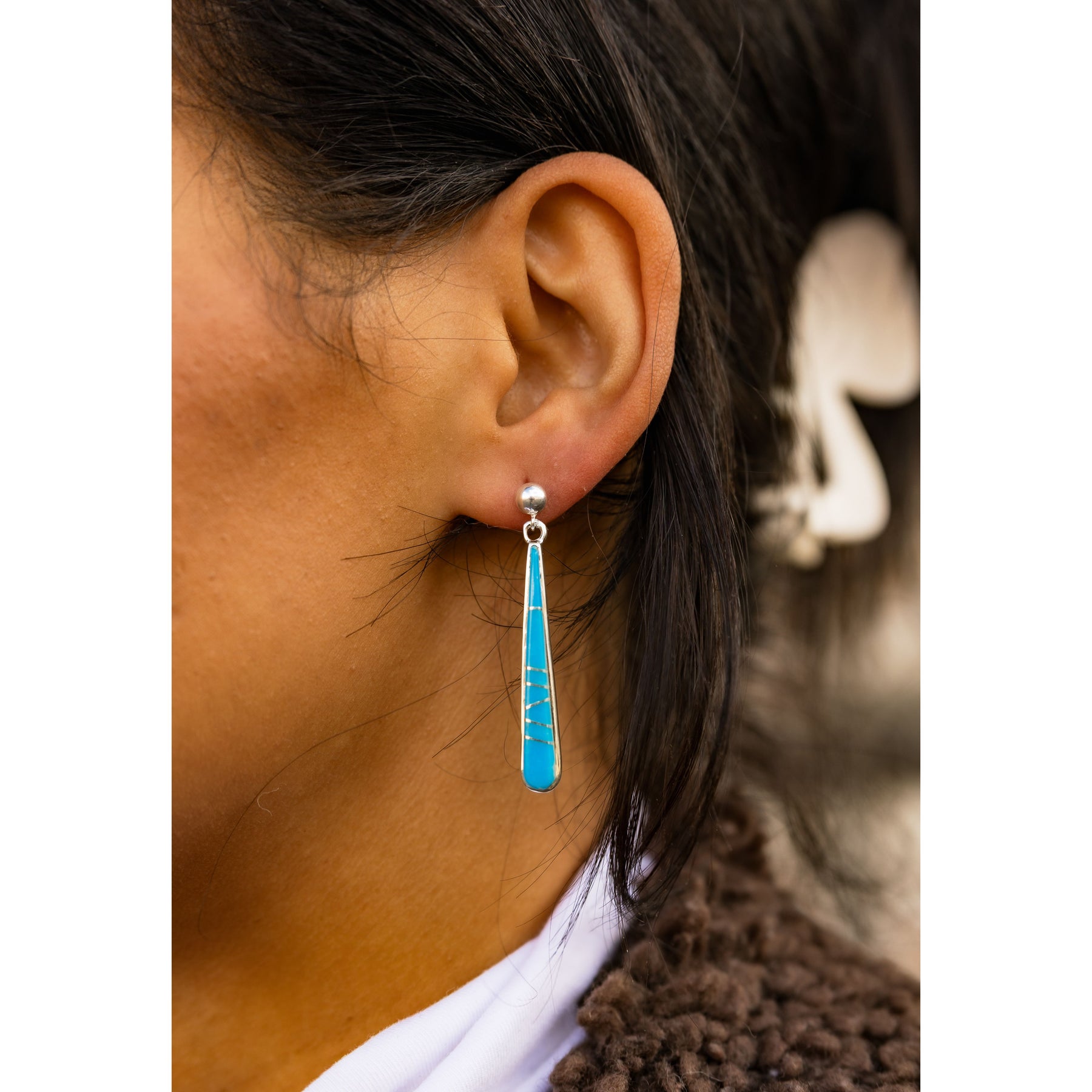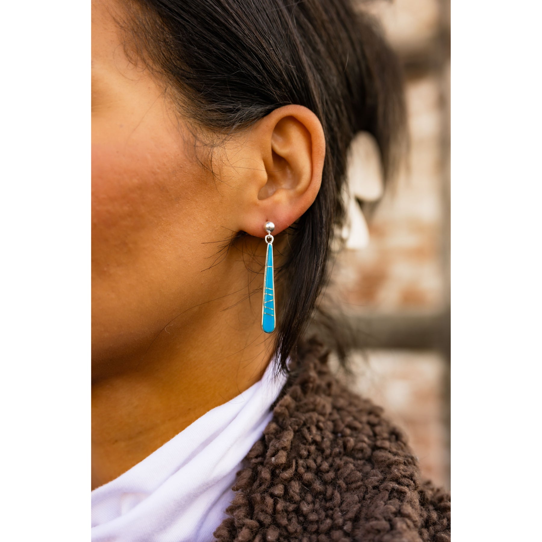 Handmade by Navajo artist Calvin Begay, these drop earrings are like a little piece of endless sky you can wear. Vibrant blue turquoise inlay flows down each slender silver drop, catching the light with every sway, while the polished silver stud keeps the look grounded and effortless. Playful yet soulful, they carry that free-spirited Southwestern energy with every movement.
