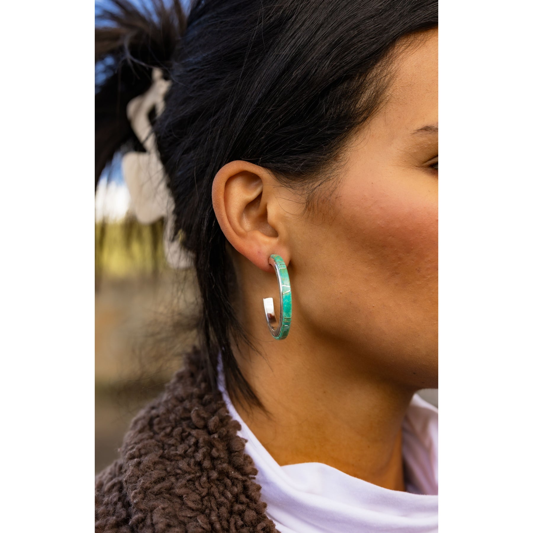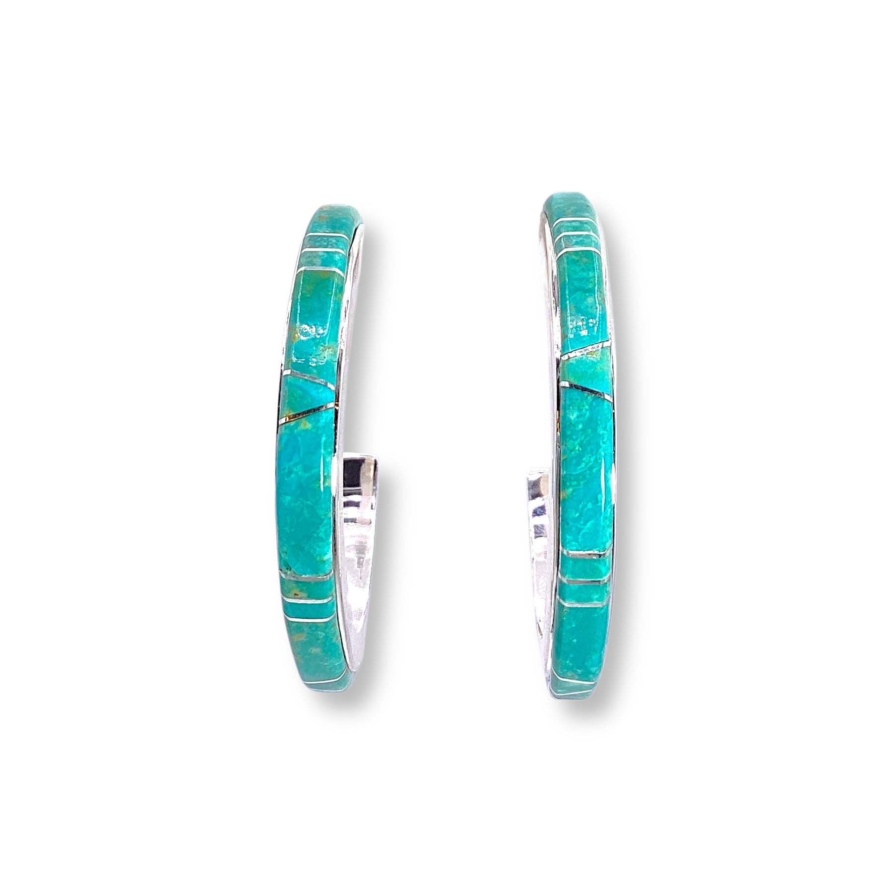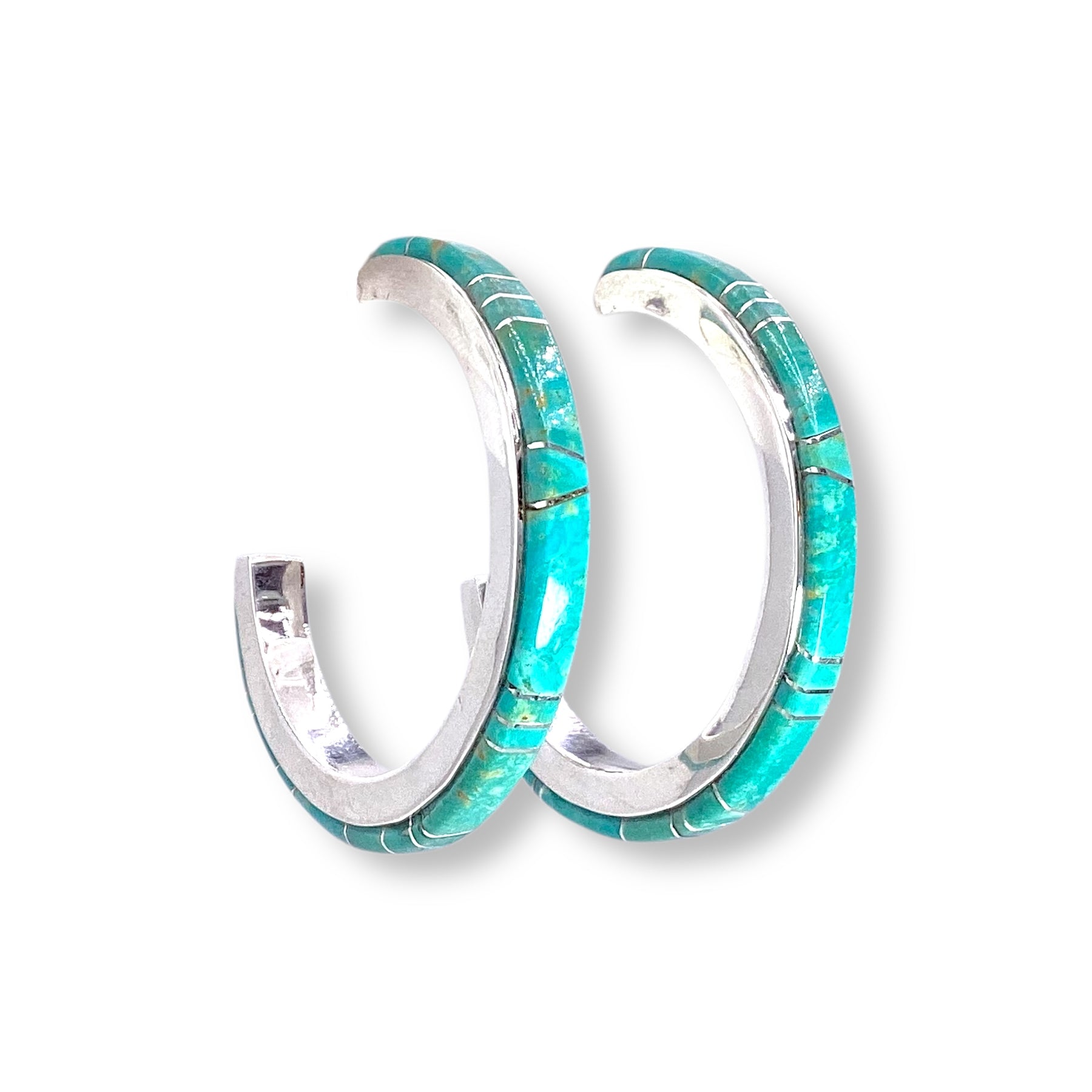 Handmade by Navajo artist Calvin Begay, these inlaid turquoise hoops feel like little circles of sunshine. Each piece of vibrant turquoise is set seamlessly into sterling silver, creating a bright, sky-blue mosaic that glows with every turn. Light, lively, and full of desert-day warmth, they bring an easy, sunlit spirit to your everyday style.