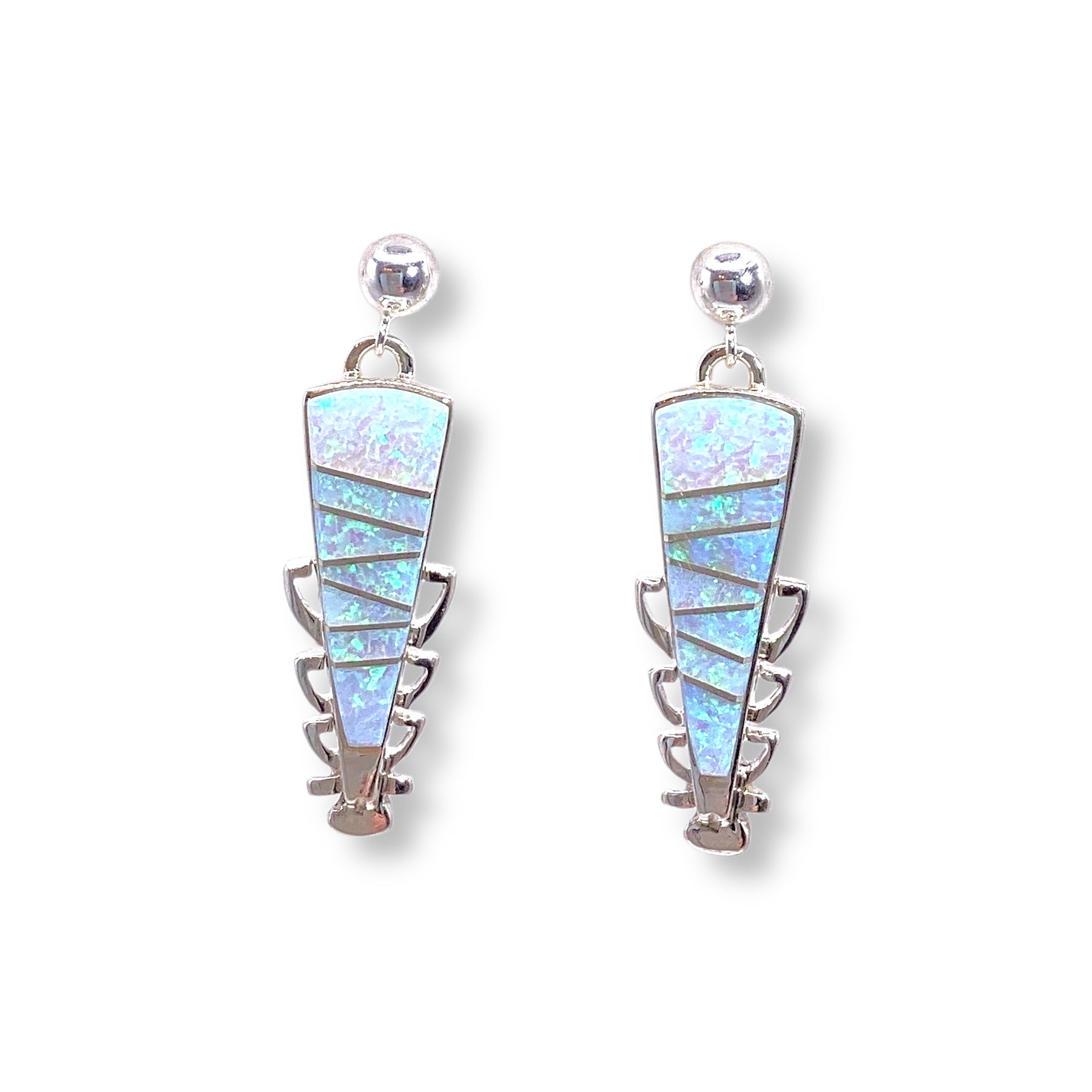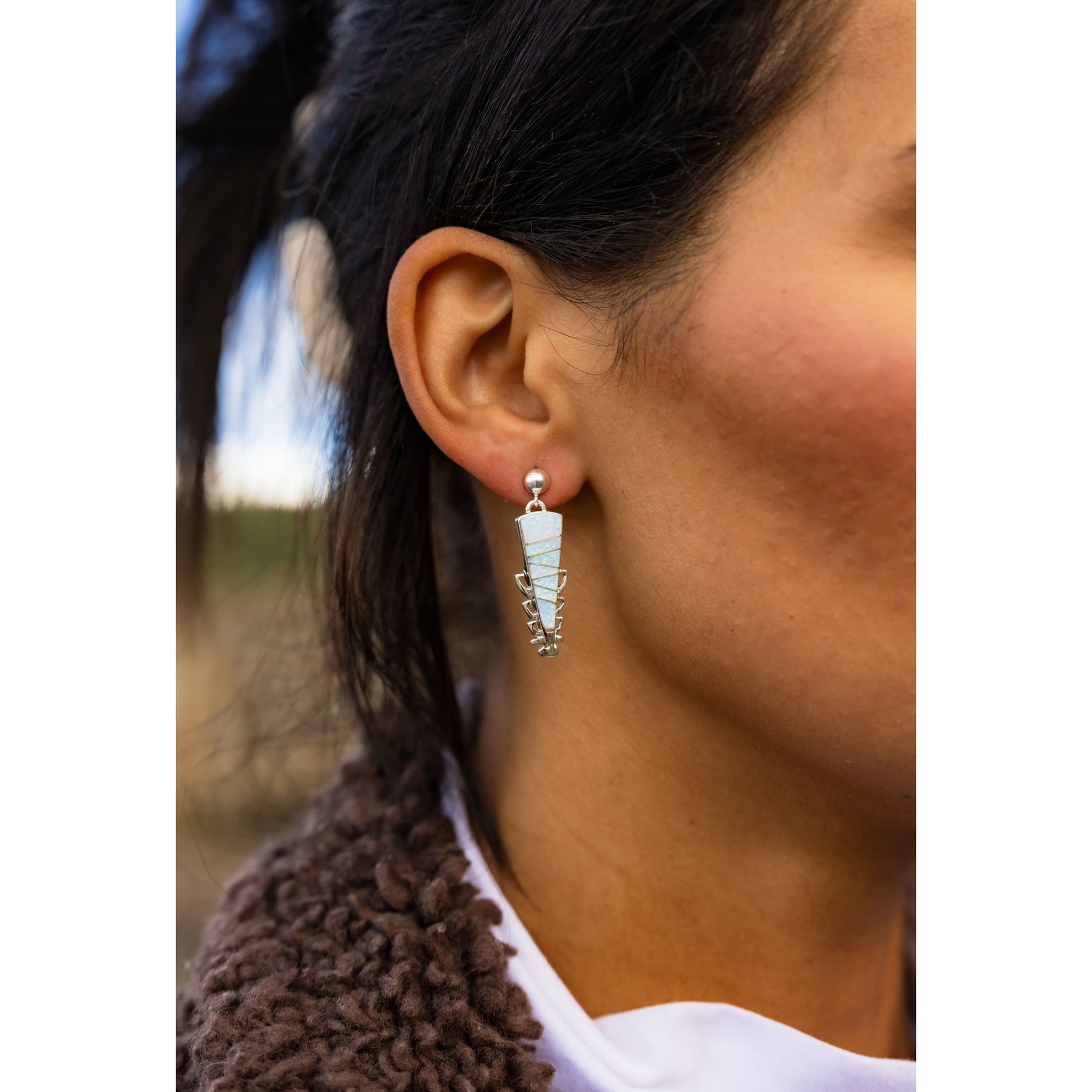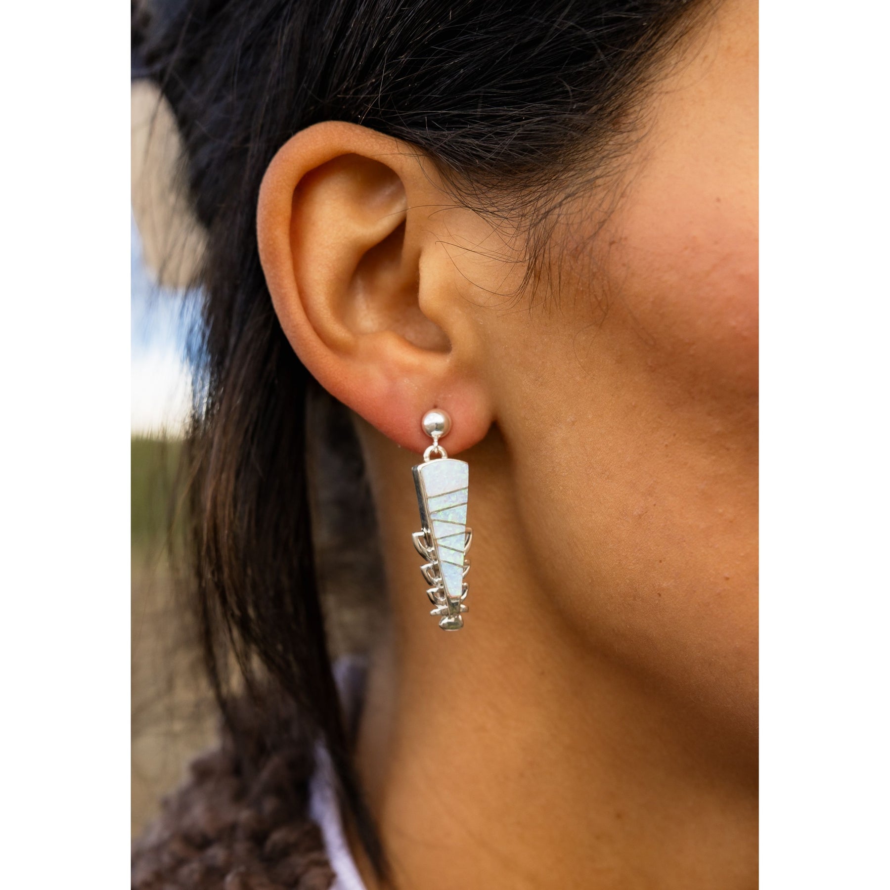 Handmade by Navajo artist Calvin Begay, these inlaid white opal earrings feel like tiny fragments of a crisp, snowy morning. The luminous opals shimmer with icy blues and soft pearlescent fire, set into sterling silver for a look that’s both sleek and serene. Their long, elegant drop mirrors the quiet sparkle of frost catching the winter sun—ethereal, calm, and perfectly wintry.