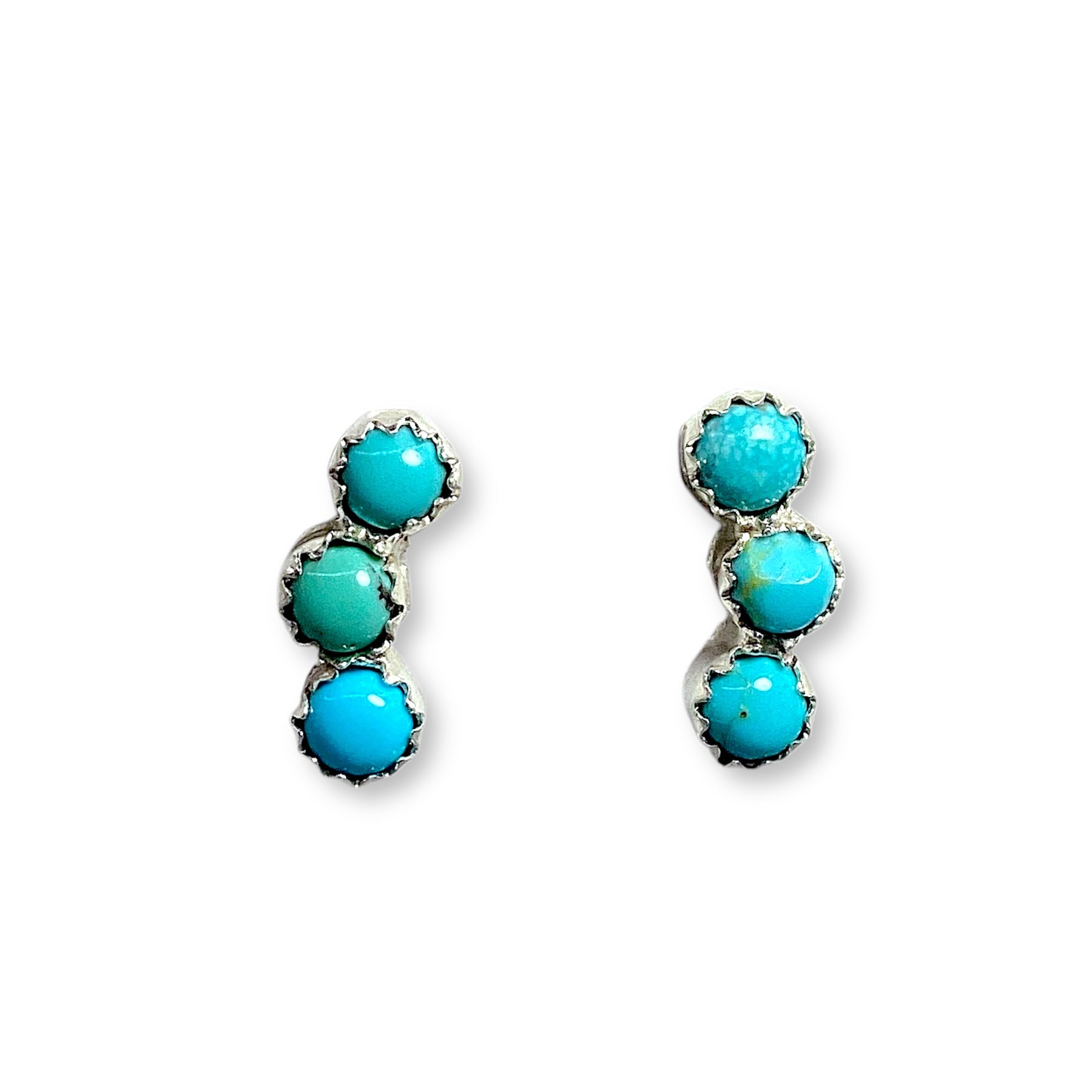 Handcrafted by Zuni artist Janice Spencer, these earrings feature three vibrant Kingman Turquoise stones set in classic sterling silver sawtooth bezels. The trio of stones creates a balanced, elegant design that highlights the rich color and natural beauty of the turquoise.