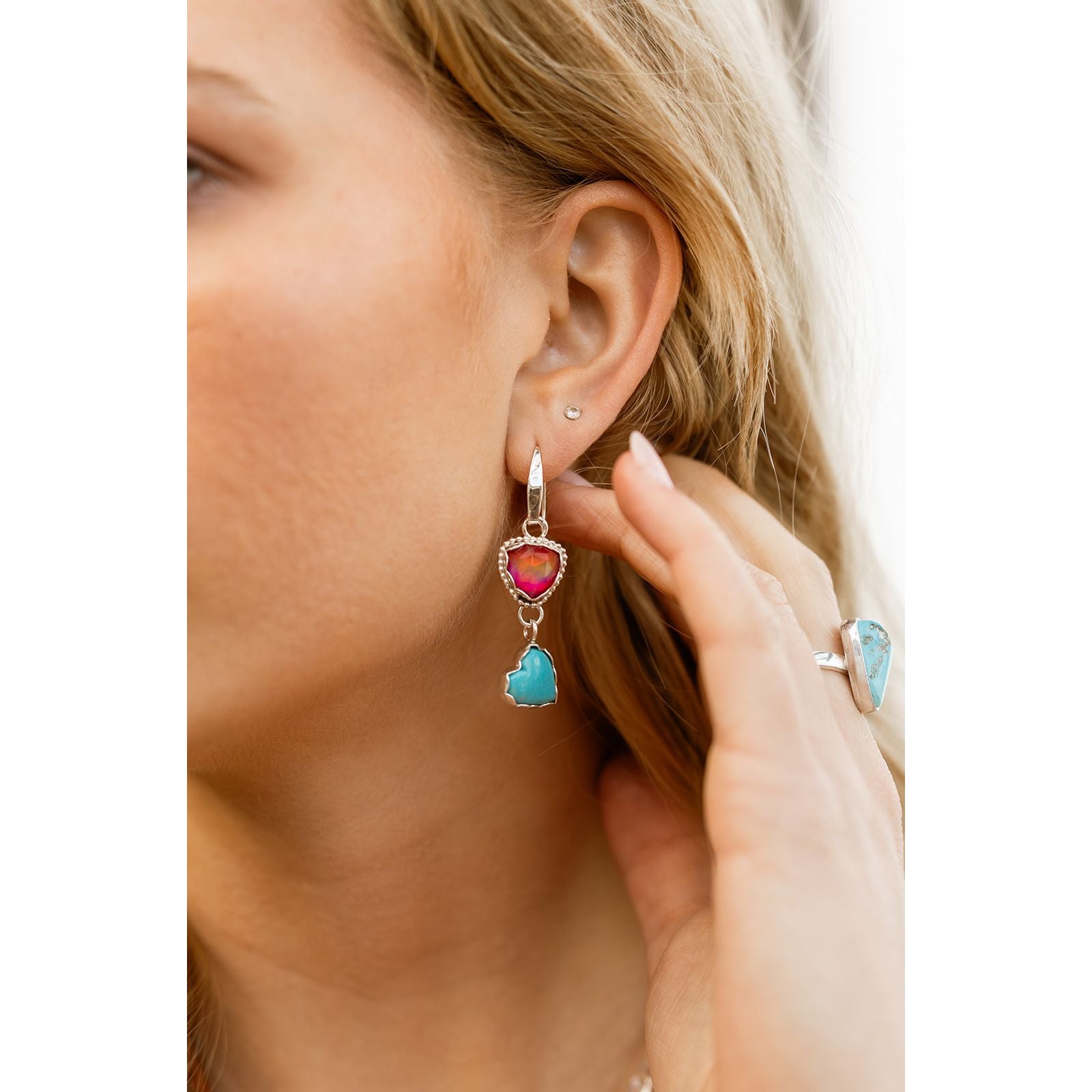 Enchanted earrings with pink tourmaline stone and Kingman turquoise hearts float beautifully with perfect movement compliments all our exclusive series. ✨