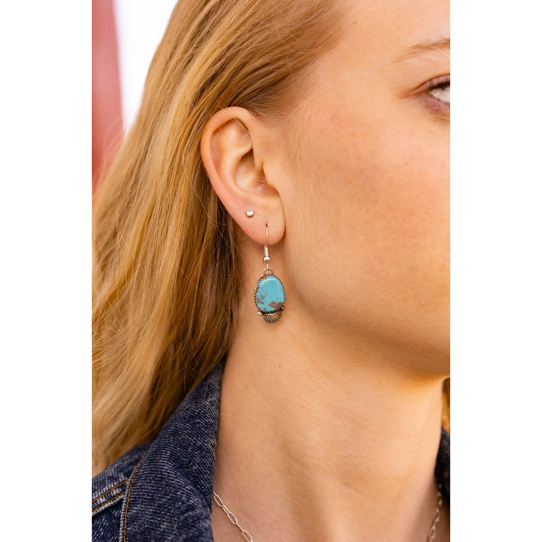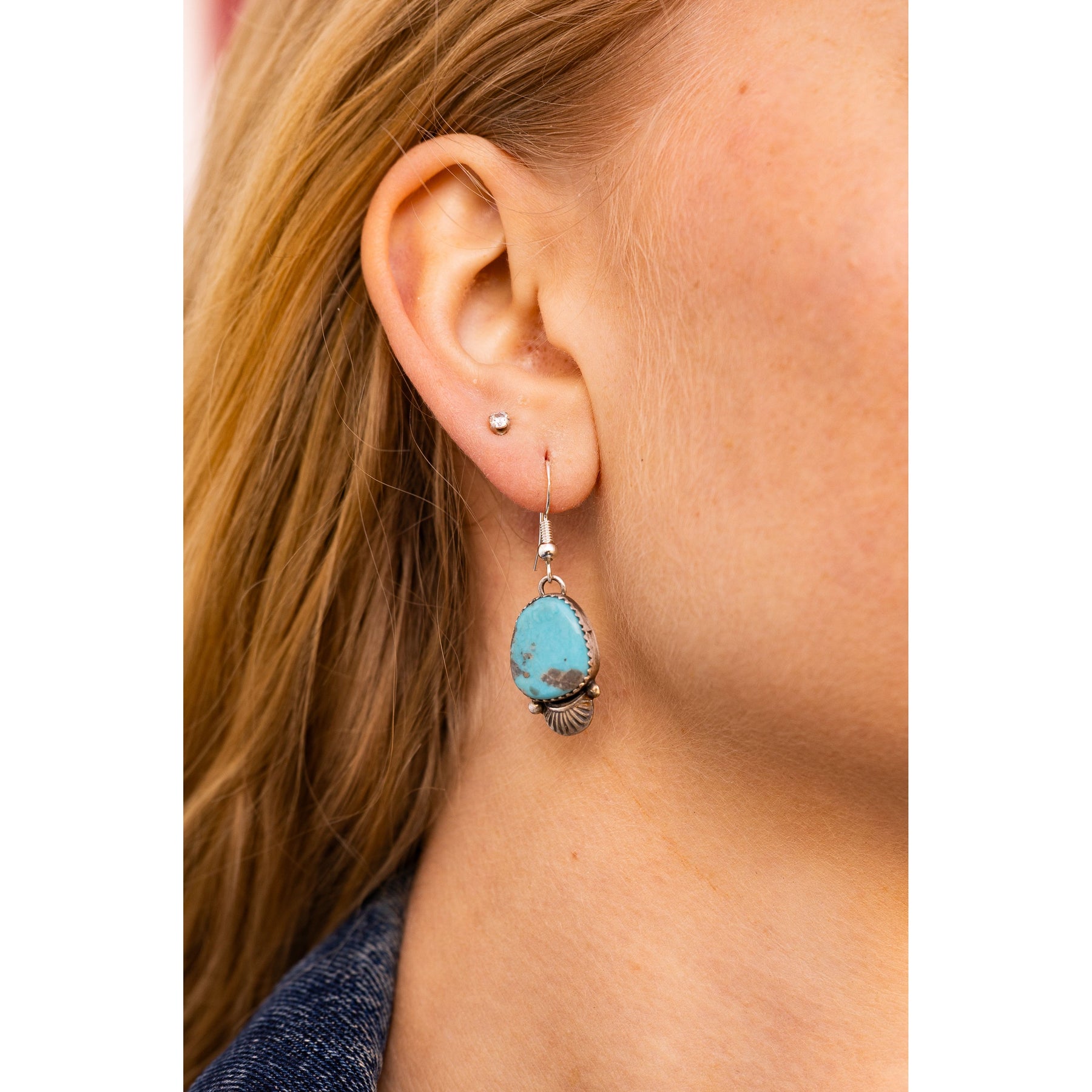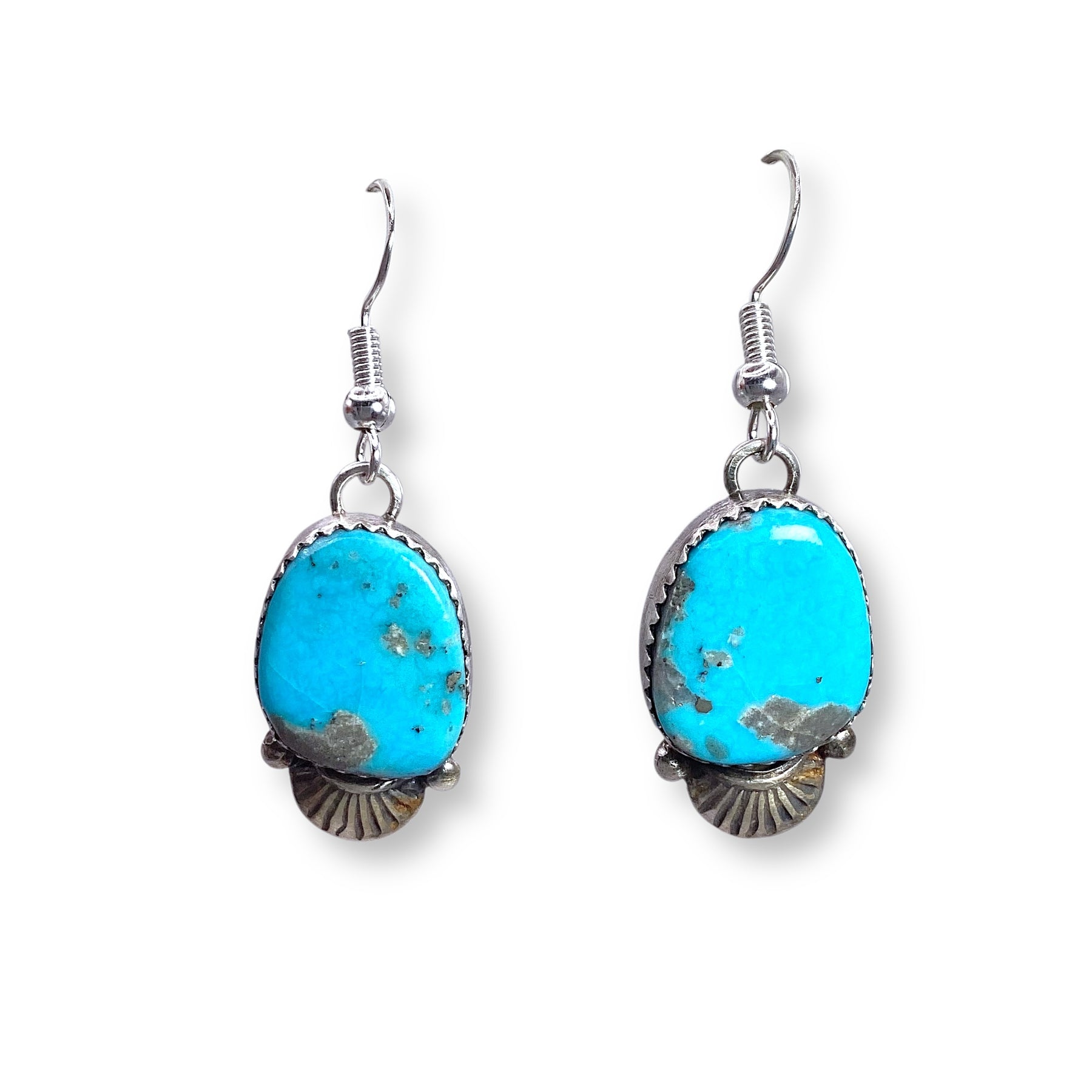 Handcrafted by Navajo artist Mary Tso, these dangle earrings feature striking turquoise stones set in classic sawtooth sterling silver bezels. The bright, sky-blue color pops against the silver, creating a look that’s confident, eye-catching, and full of Southwestern attitude. With their strong lines and graceful drop, they make a bold statement while still feeling beautifully wearable.