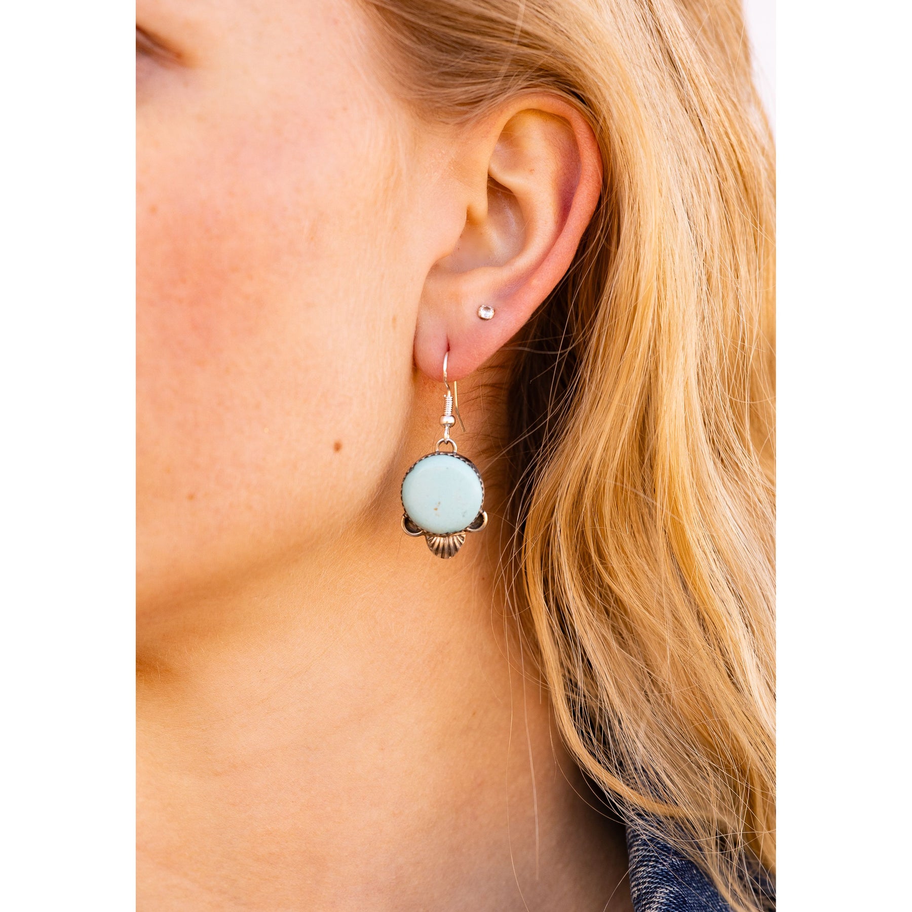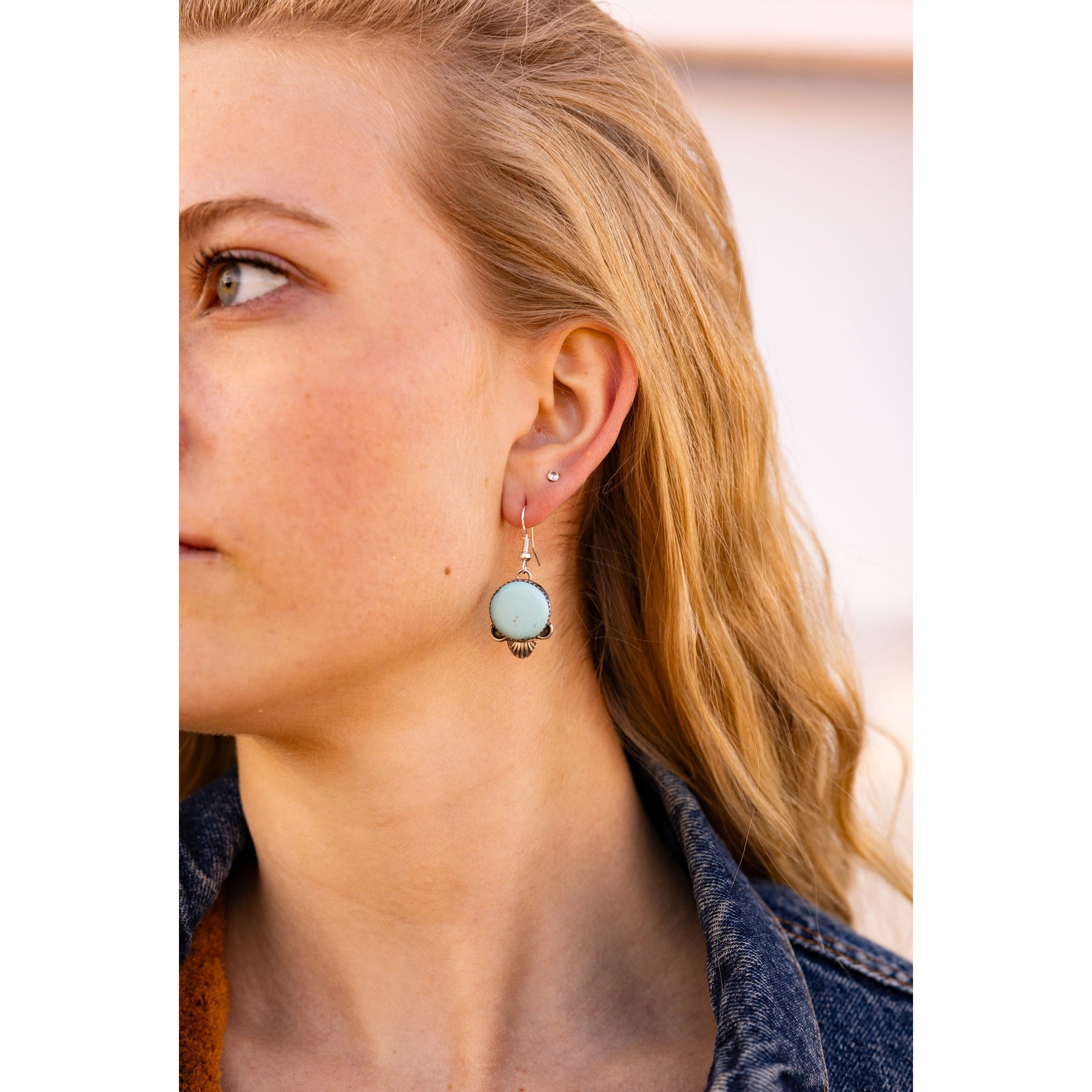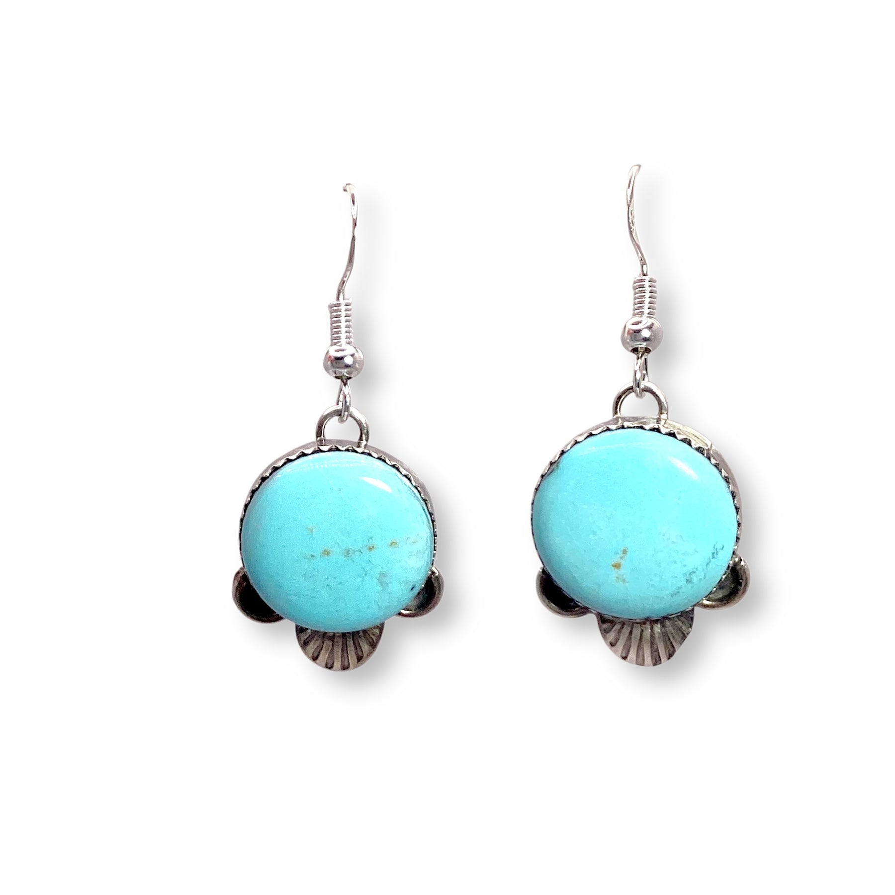 Handcrafted by Navajo artist Mary Tso, these dangle earrings feature soft light blue turquoise stones set in delicate sawtooth sterling silver bezels. The pale blue hue feels airy and dreamy, while the gentle movement gives them that effortlessly undone vibe. Feminine, relaxed, and full of soul—these are the kind of earrings you’ll reach for on repeat.