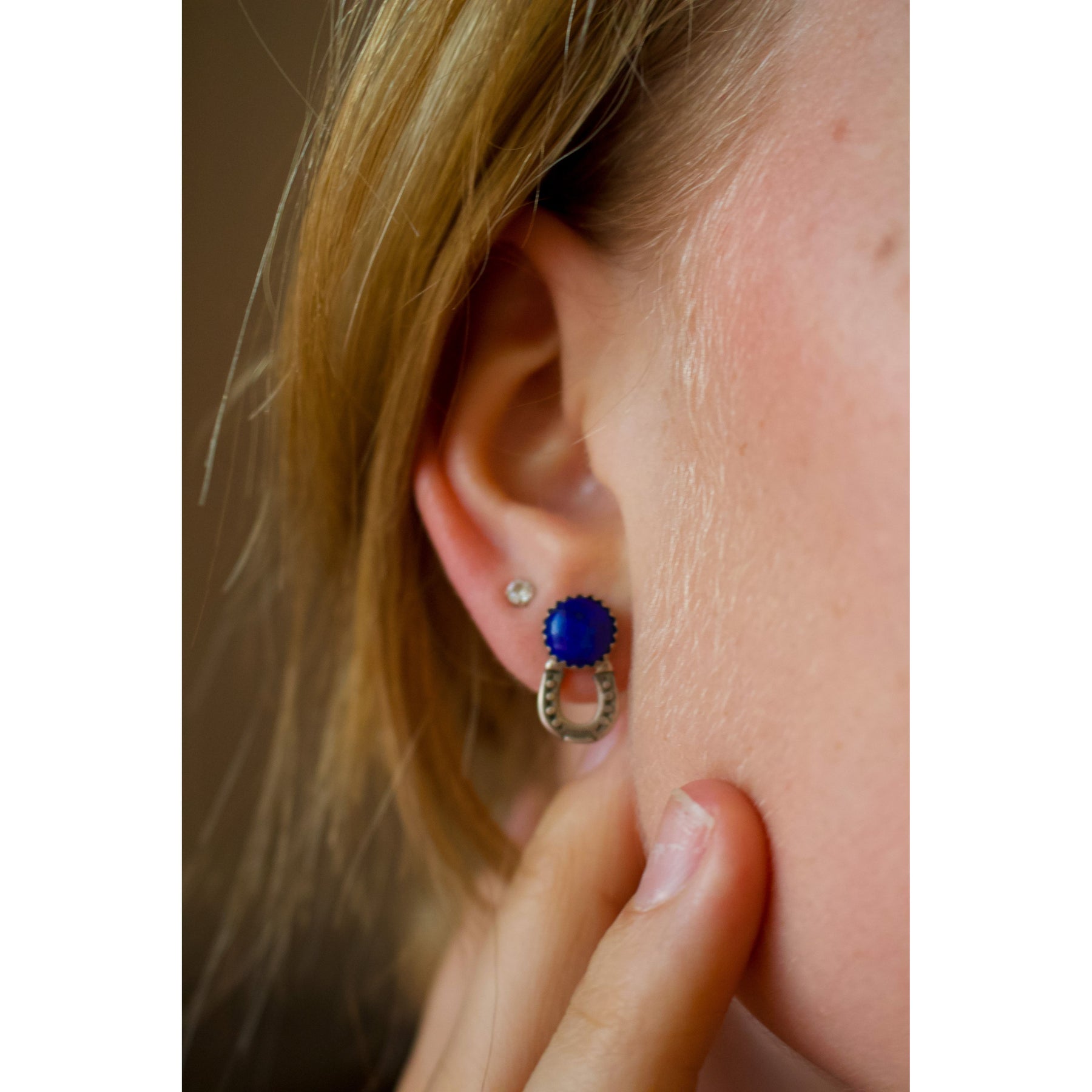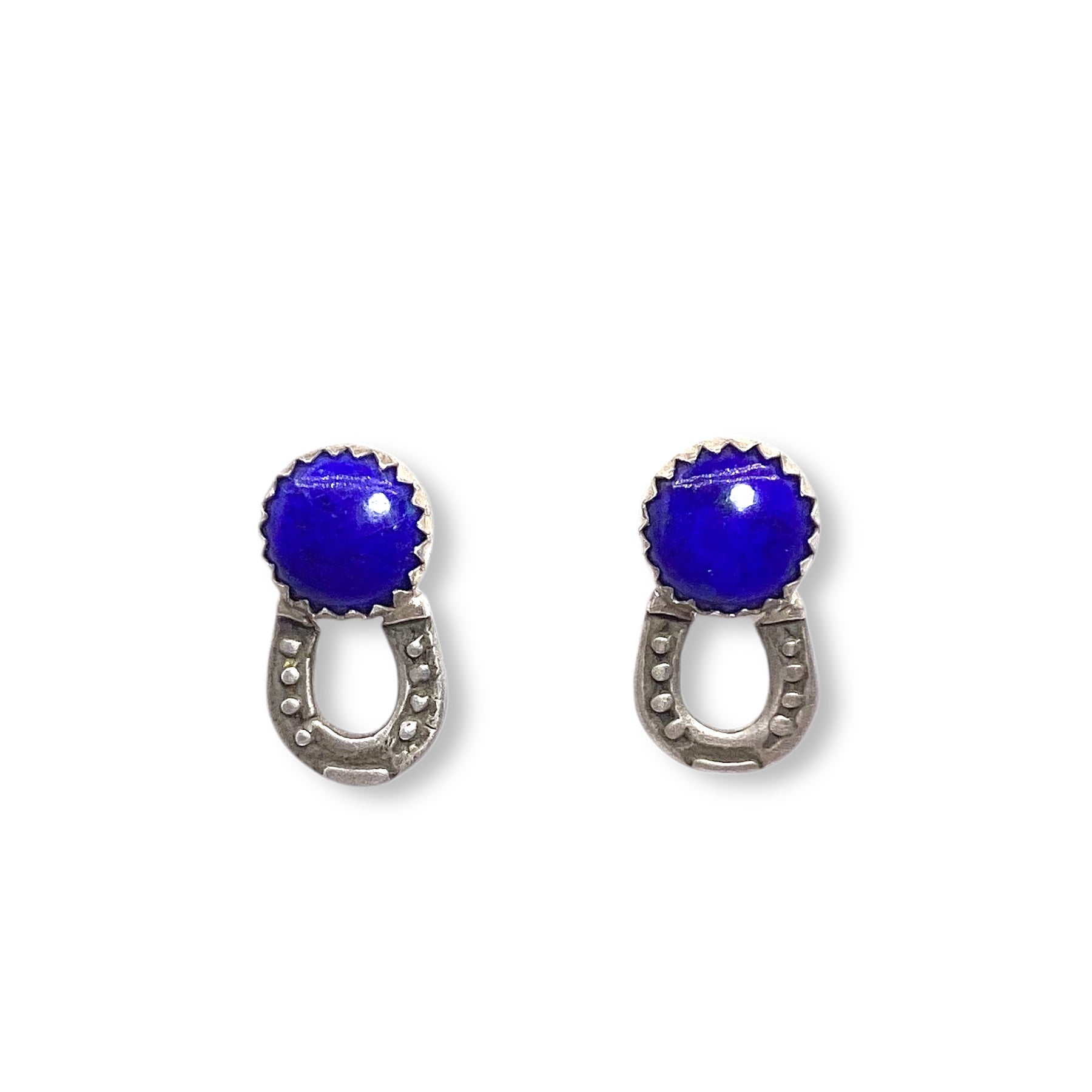 These earrings bring that effortless, wanderlust-filled vibe—rooted in artisan soul and a touch of desert magic. A deep Lapis stud anchors each piece, rich and celestial like a midnight sky, while a handcrafted sterling silver horseshoe adds a hint of wild-spirited charm.