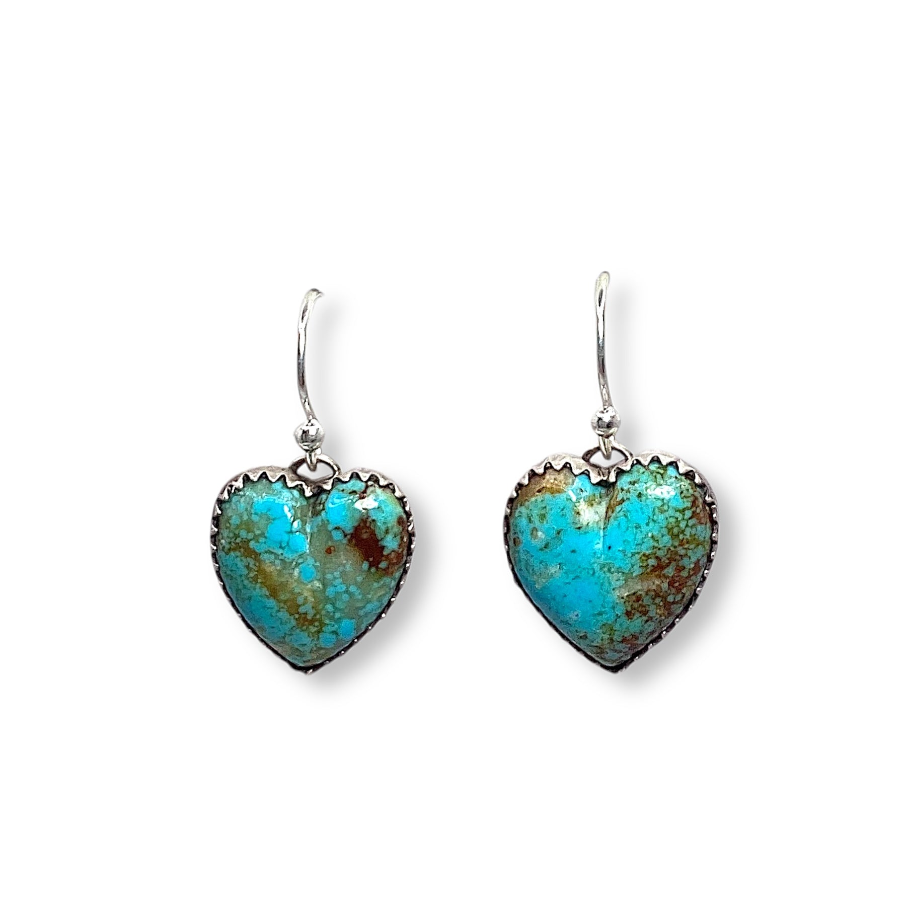 Brimming with soft, bohemian charm, these Ristra Ranch earrings feature a dreamy turquoise heart, cradled in a delicate sawtooth sterling silver bezel. The heart sways from handcrafted silverwork, giving each movement a touch of romance and wanderlust. Effortlessly feminine, a little wild, and perfect for free-spirited days.