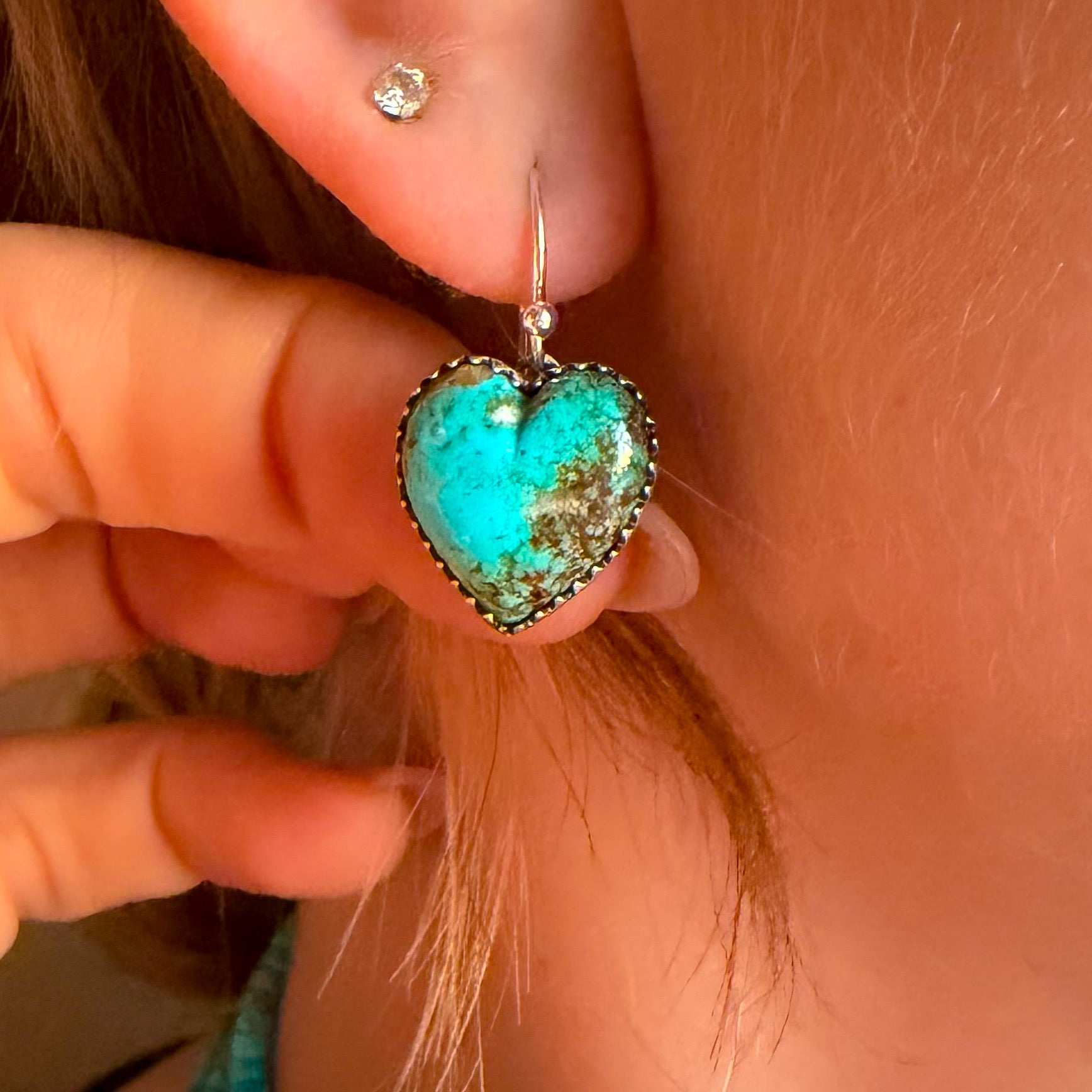 We adore the way these earrings feel both tender and untamed—the turquoise heart brings sweet, soulful energy, while the sawtooth bezel and artisan silverwork add that signature Southwestern magic. A pair that feels like a love note to open skies and slow, sunlit moments.