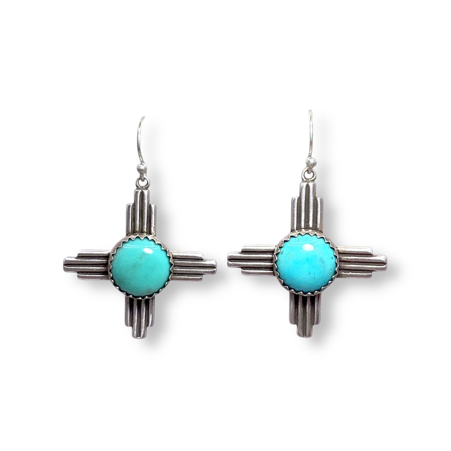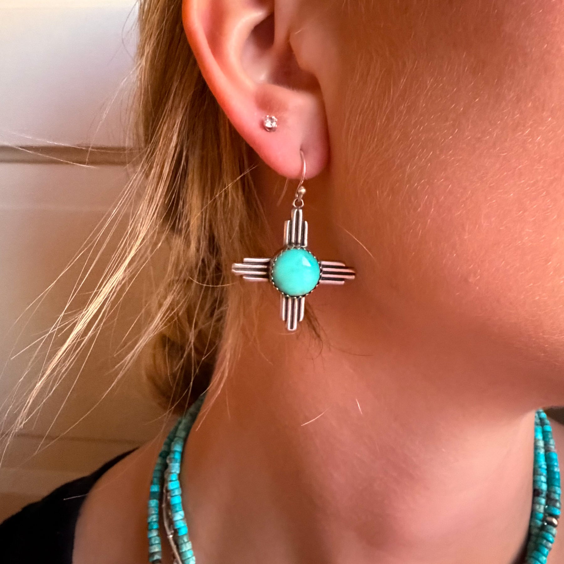 These Ristra Ranch stunning earrings feature a vibrant turquoise stone set at the heart of a classic Native sunburst design. Crafted in sterling silver and made to dance with every step, they carry that easy, sun-kissed Southwestern charm.