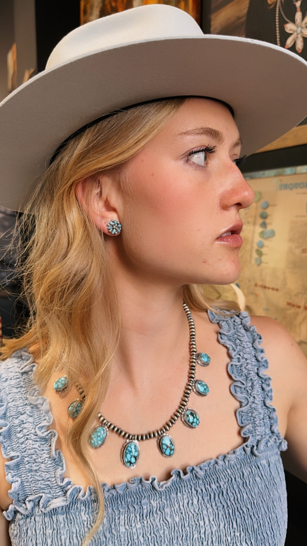 These native made Kingman cluster studs are such a southwestern favorite. These beauties have a sawtooth bezel around the gorgeous Kingman turquoise stones. They are a perfect piece to add to any collection.