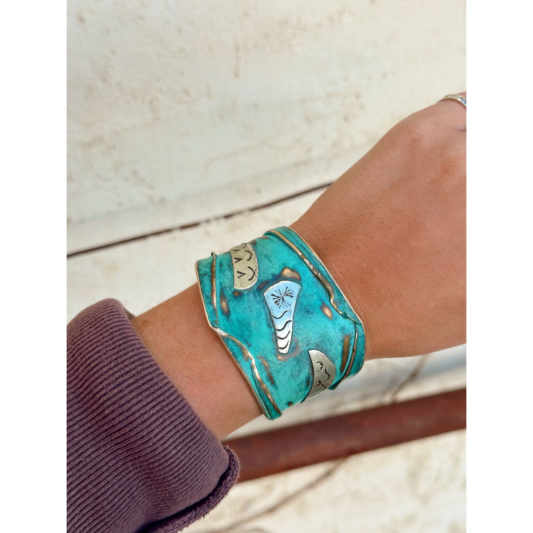 Handcrafted by Lazaro Gutierrez, this cuff is a striking fusion of patinaed brass and sterling silver, designed to command attention. Its bold lines and layered textures create a one-of-a-kind statement piece that feels both modern and deeply rooted in Southwestern tradition. Distinctive, strong, and undeniably unique, it’s jewelry with attitude and soul.