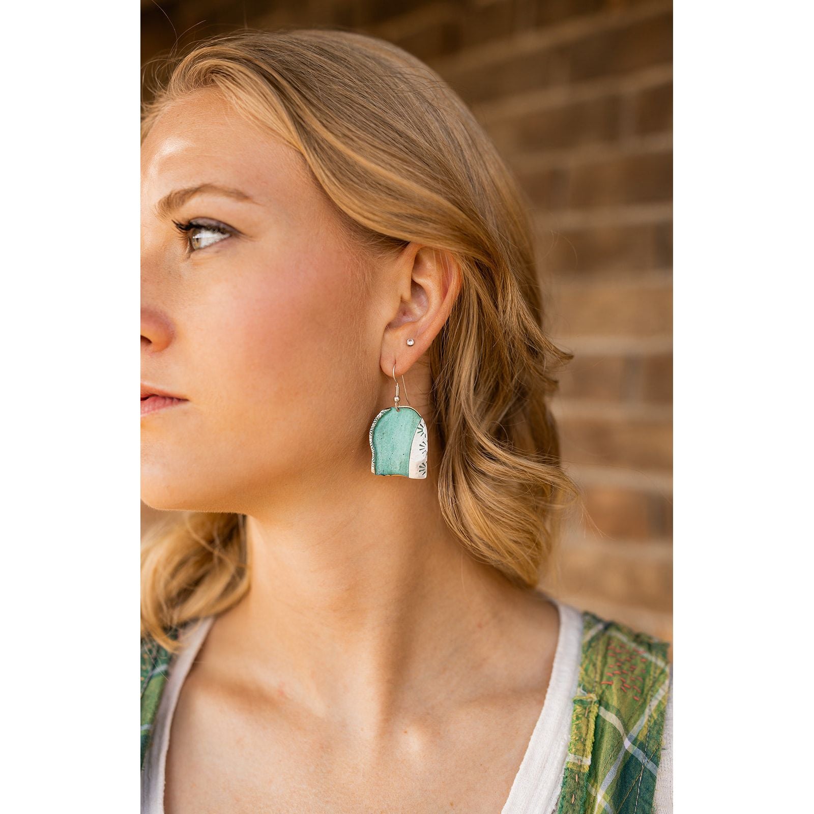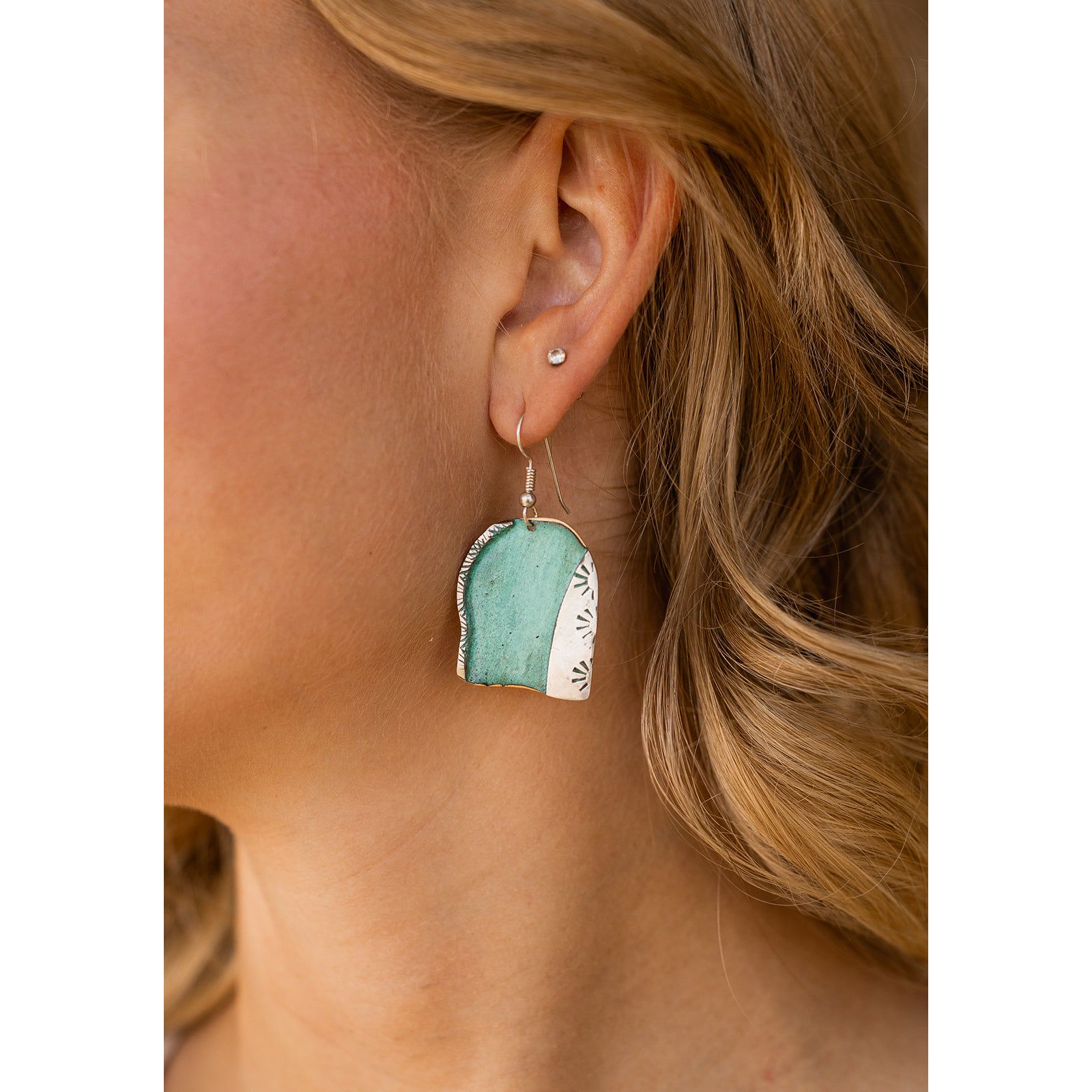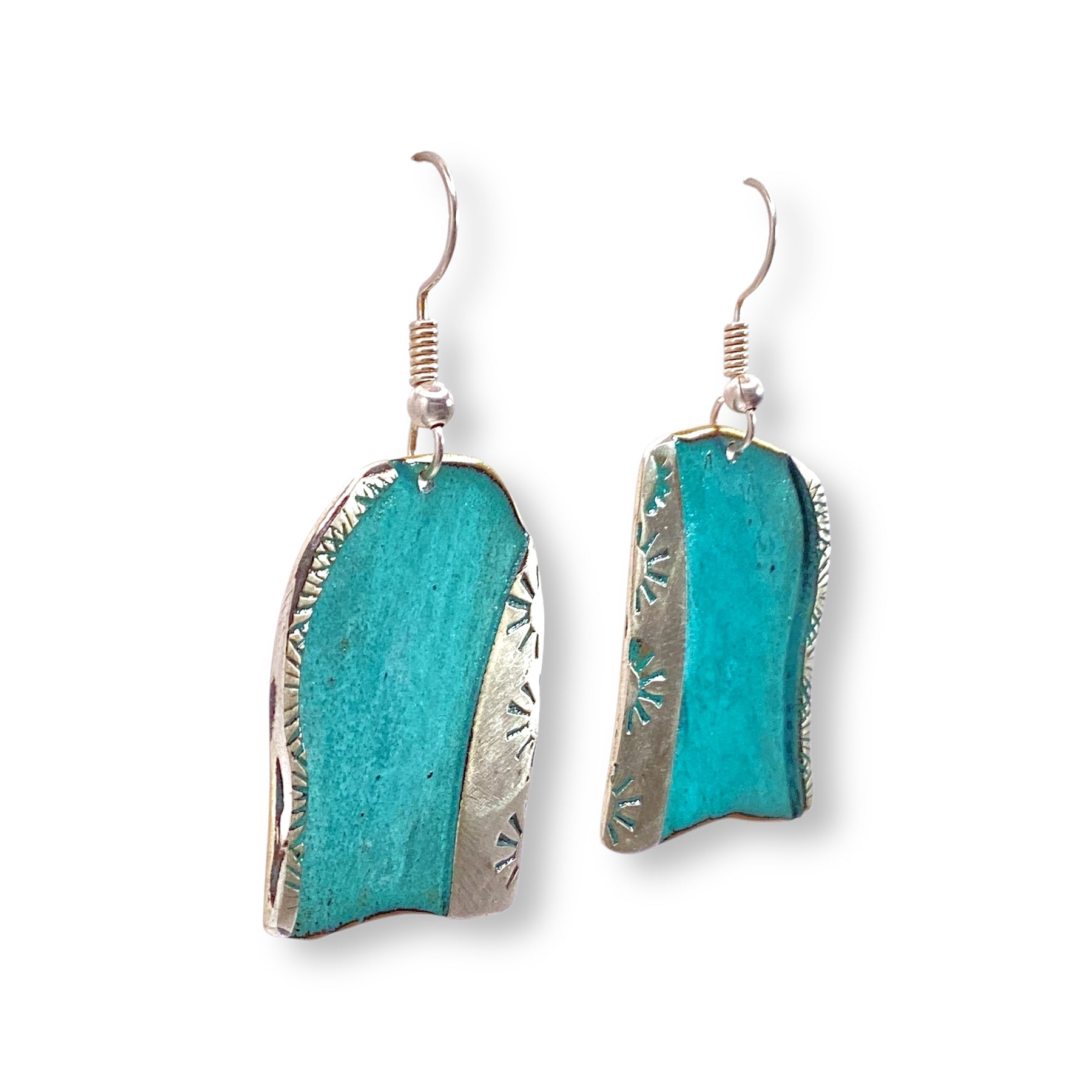 These dangle earrings bring the perfect mix of warmth and edge, featuring solid brass with a rich patina and sterling silver stamped with a delicate sun design. Handcrafted with care by silversmith Lazaro Gutierrez, they’re a standout for any look.
