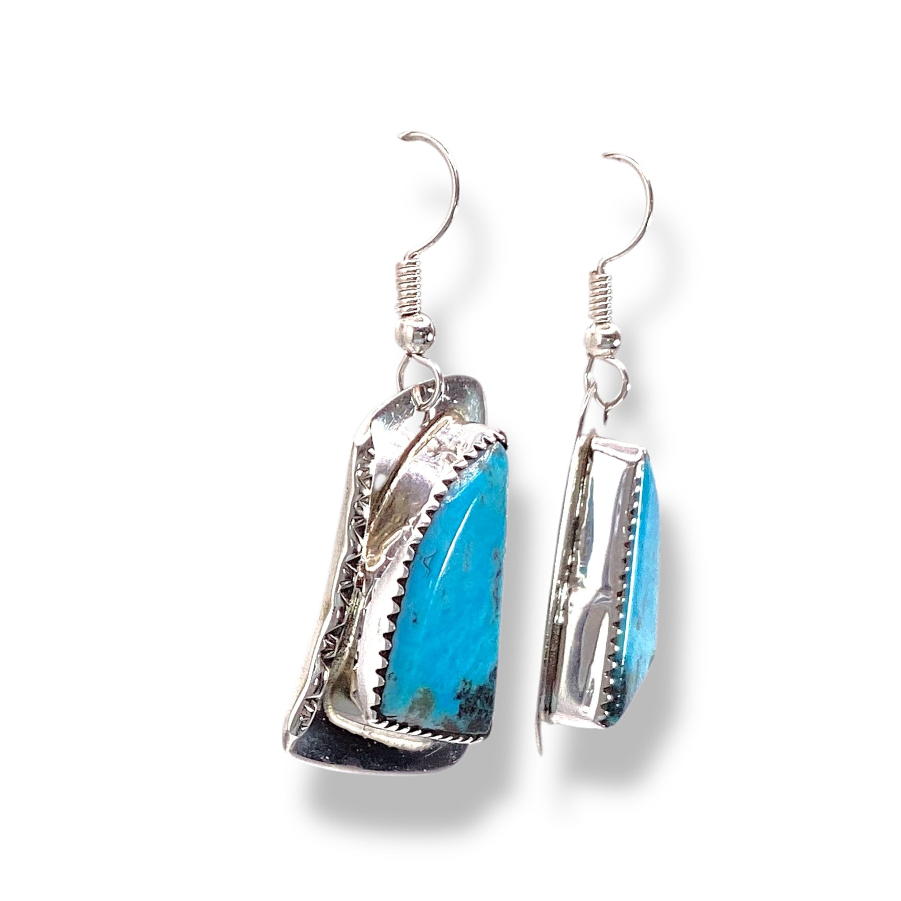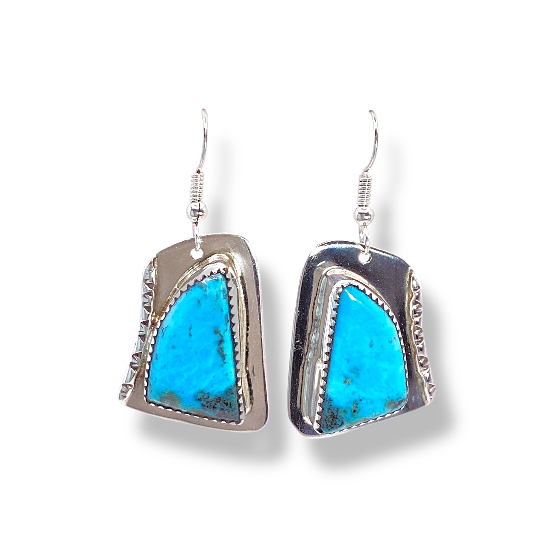 Bright turquoise stones framed by bold southwestern-inspired sterling silver sawtooth bezels, expertly handcrafted by Lazaro Gutierrez. A perfect blend of vibrant color and timeless design.