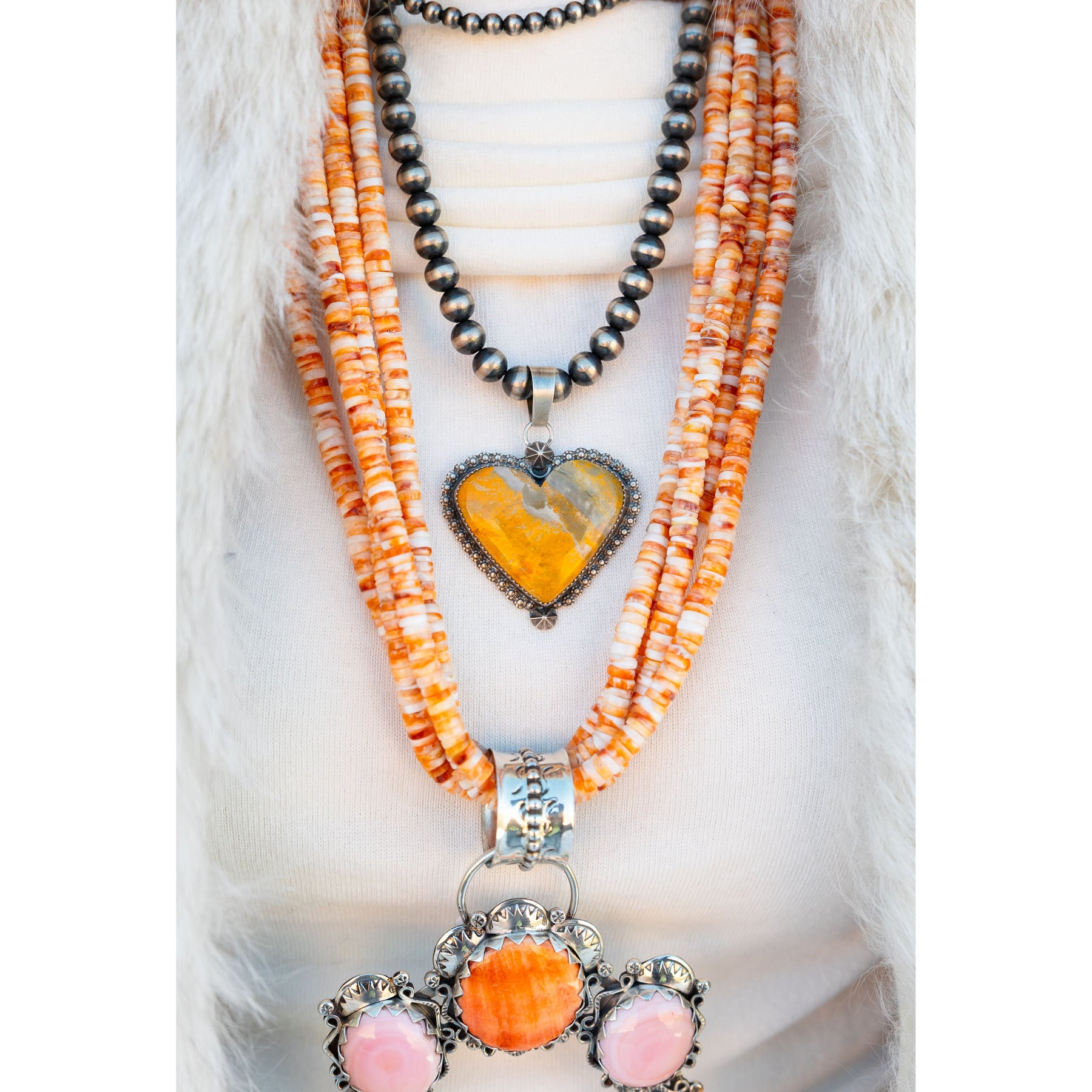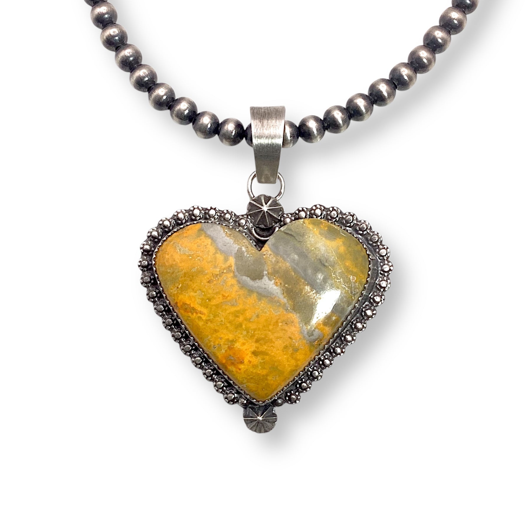 Handcrafted by Navajo artist Mary Tso, this striking heart pendant features bold Bumblebee Jasper set in a classic sawtooth sterling silver bezel. The dramatic mix of golden yellow, charcoal, and earthy tones creates instant impact, while traditional Southwestern embellishments frame the stone with powerful detail. It’s fearless, radiant, and impossible to ignore—a true statement piece.