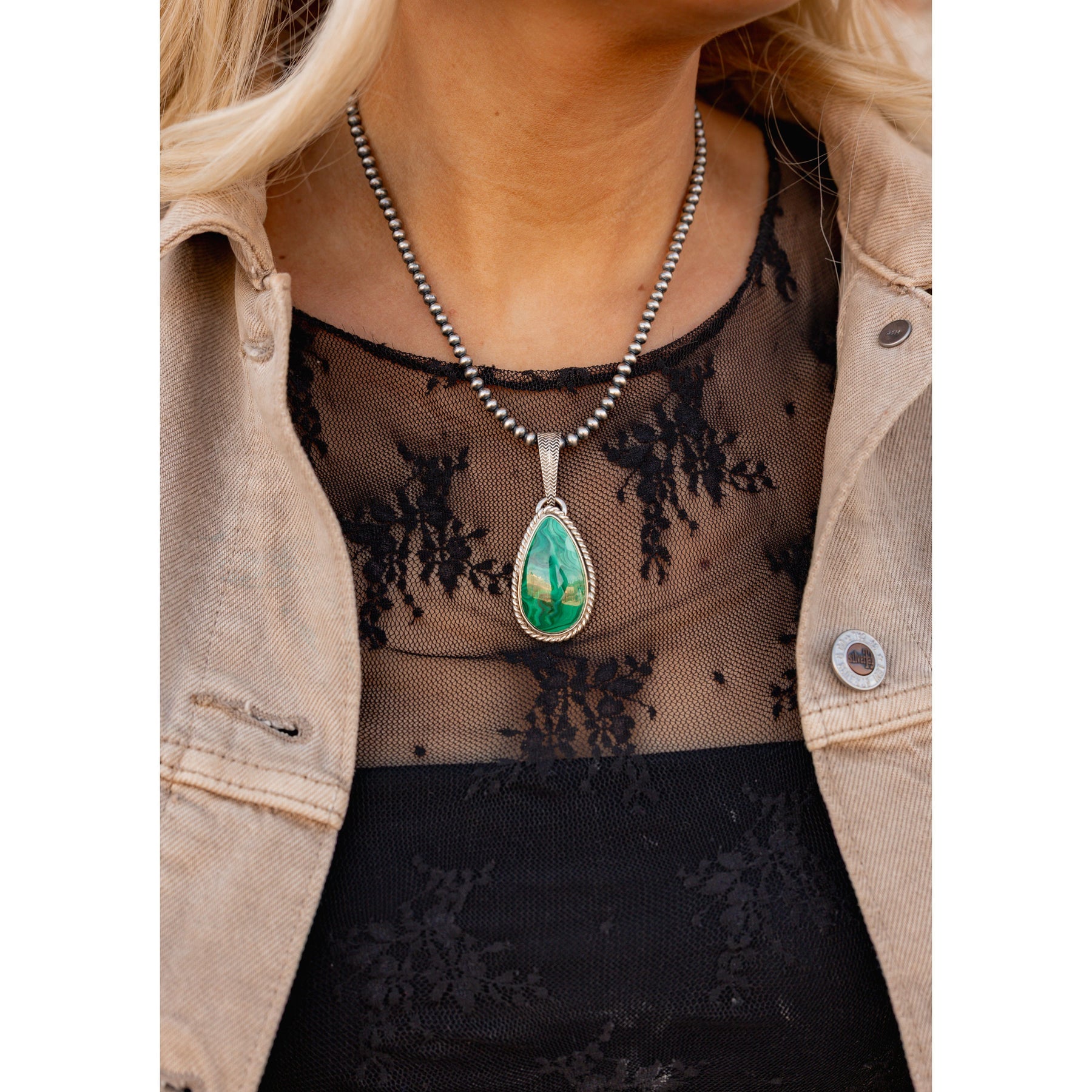 A malachite pendant that is absolutely stunning—glassy, and one of the highest-grade malachites we have ever seen. A substantial-sized pendant perfect for the ones you love, or to wear on special occasions when you want something meaningful and unforgettable.