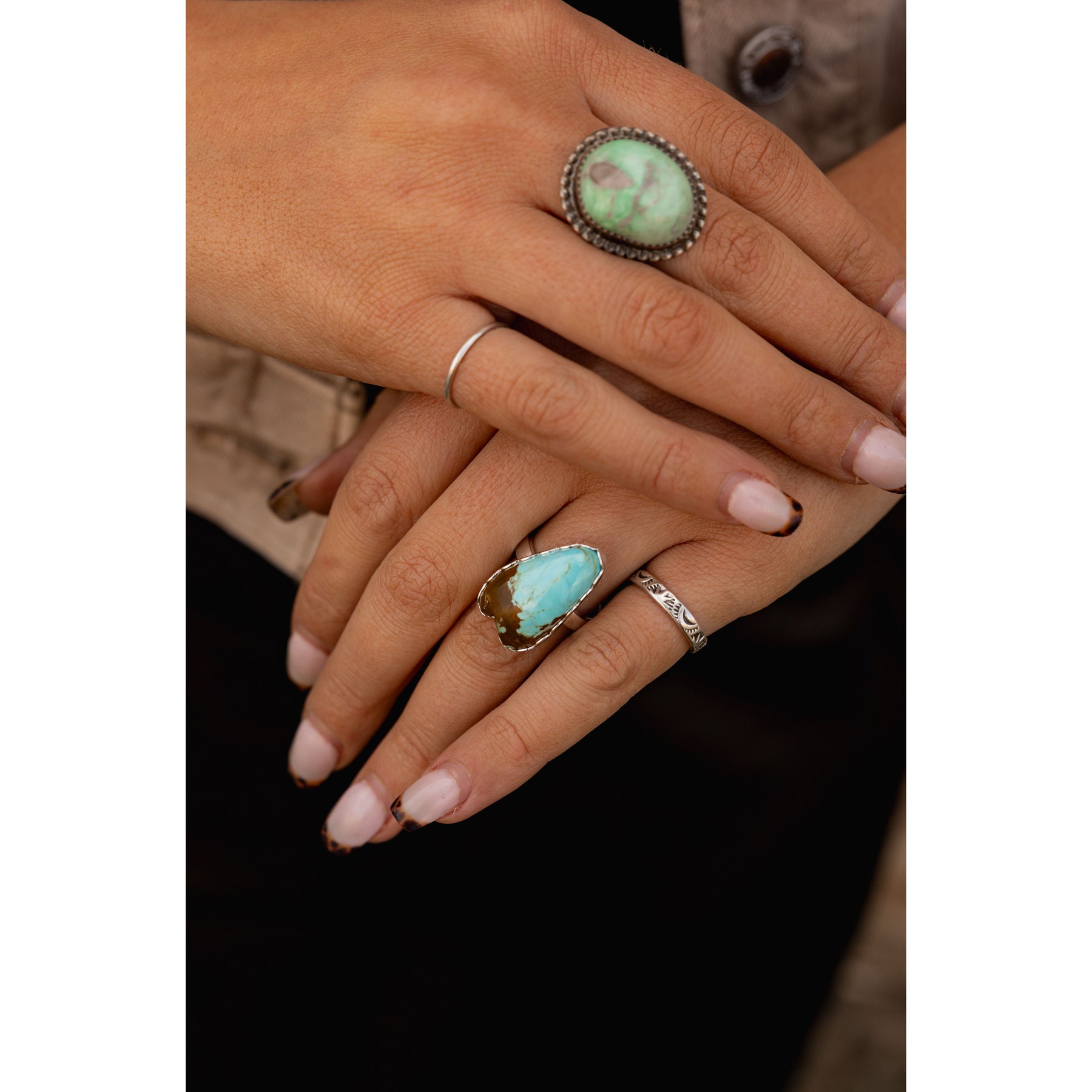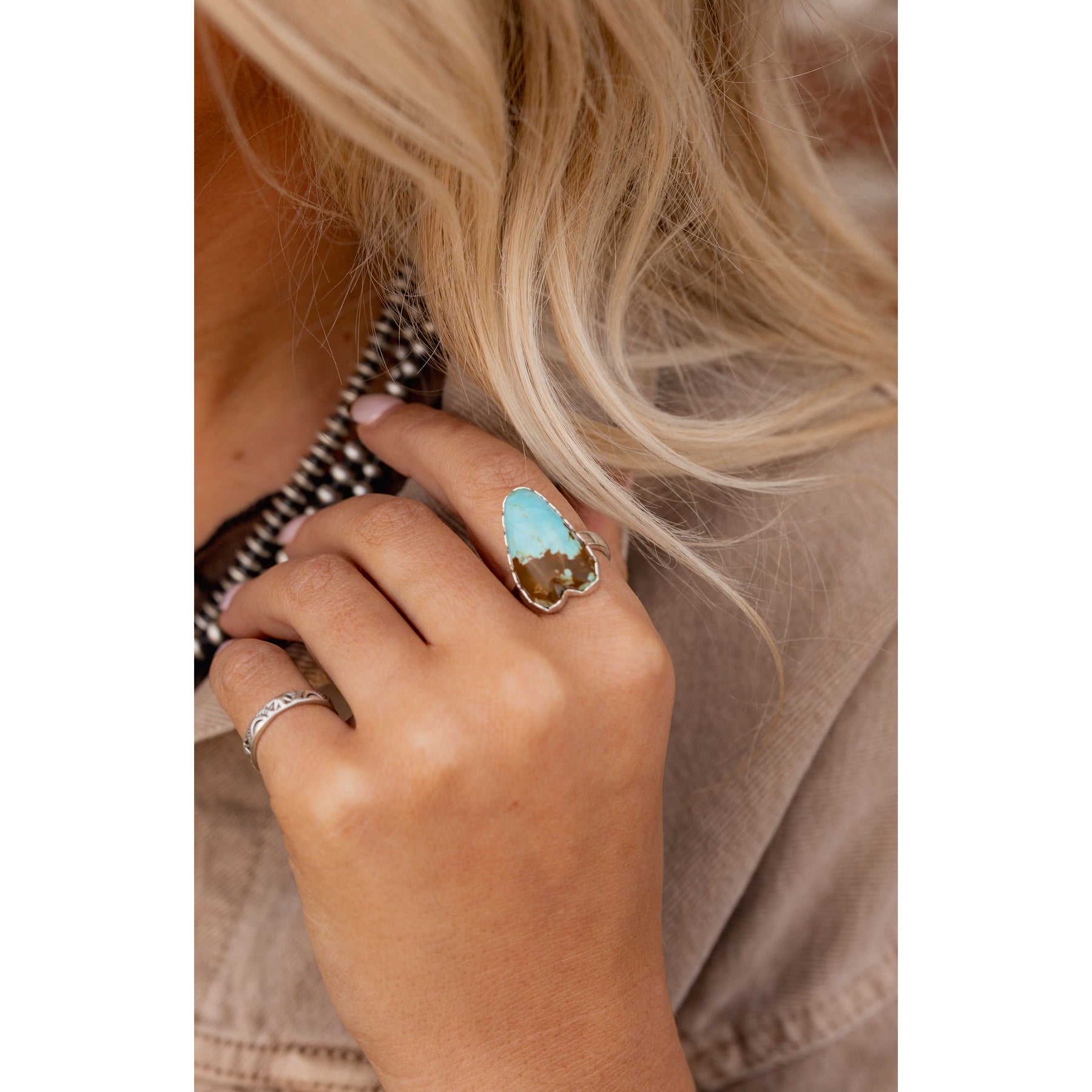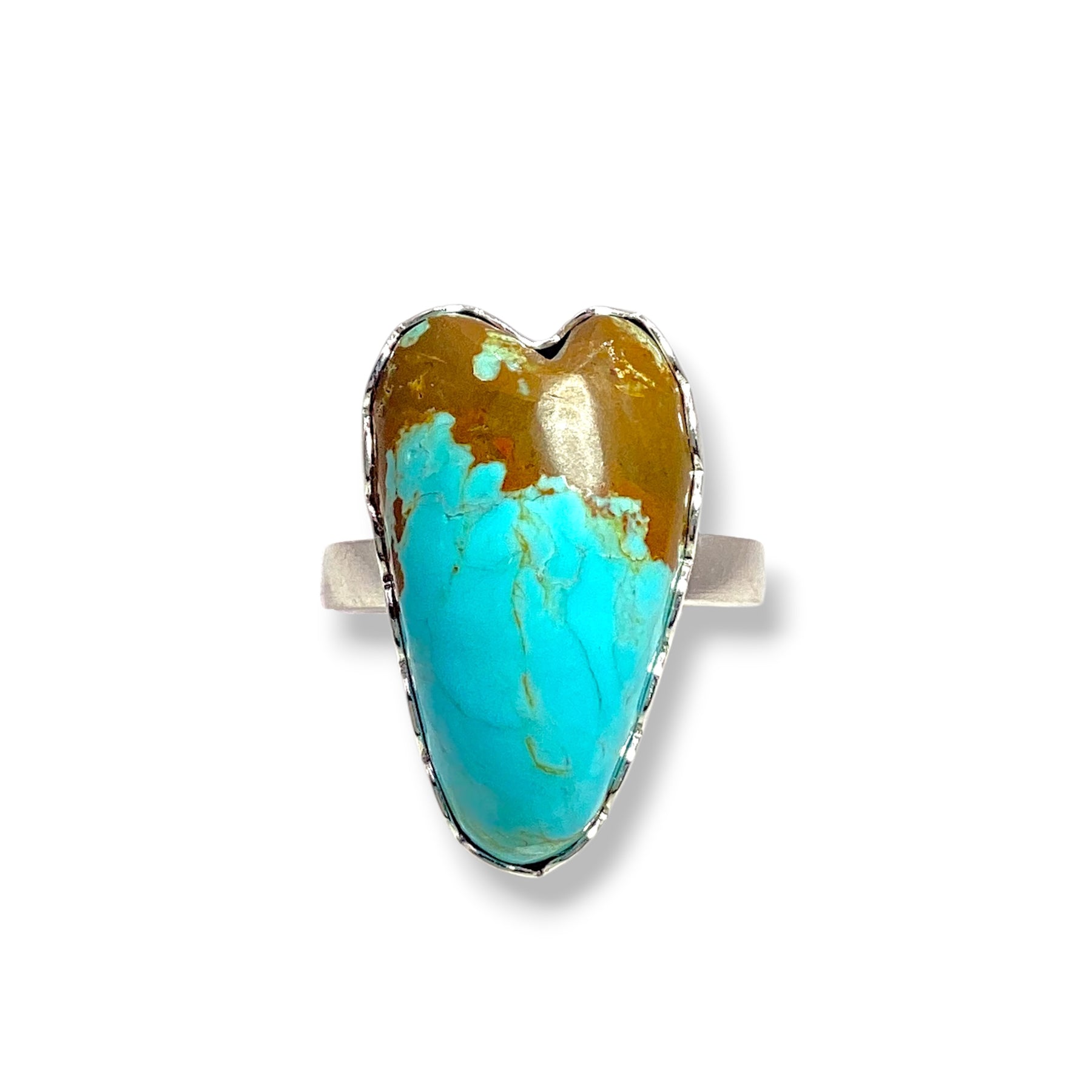 Meet the newest piece in our Christine collaboration with Michael Silberhorn. Set in sweet scalloped bezels, this Number 8 turquoise is high-grade and comfortable for all-day wear—an absolute heart-stopper, pun fully intended. This piece looks like it was half dipped in chocolate just like our favorite ice cream cone.Â