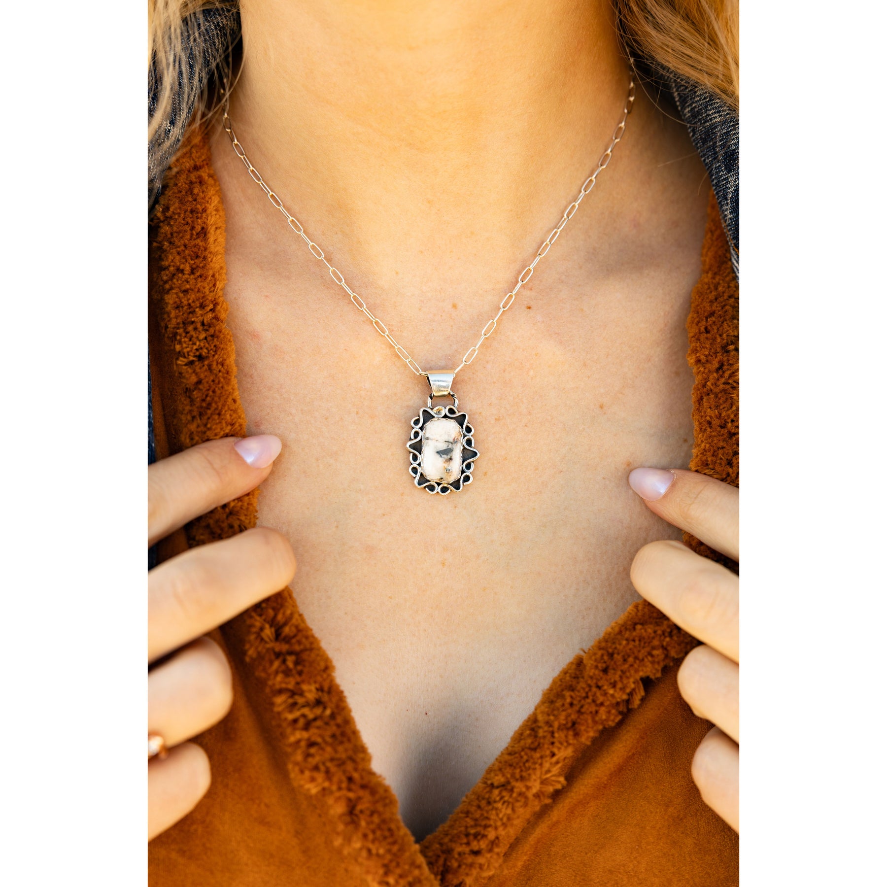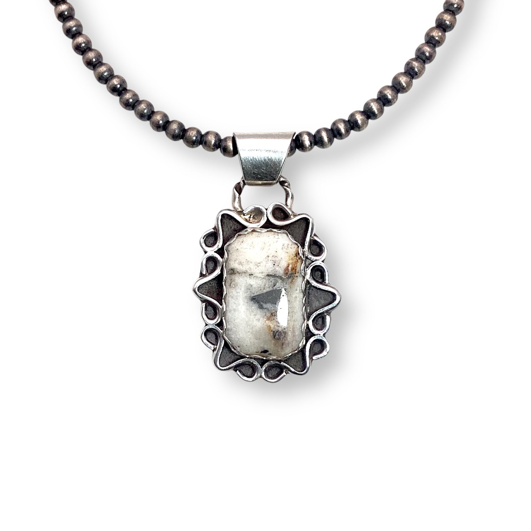 Handcrafted by Franklin C. Crowther, this pendant features a striking square White Buffalo stone set in a scalloped sterling silver bezel with detailed silverwork throughout. The bold shape and high-contrast stone give it a fresh, fashion-forward edge, while the handcrafted details keep it rooted in Southwestern tradition. It’s the perfect mix of classic craft and cool-girl style.
