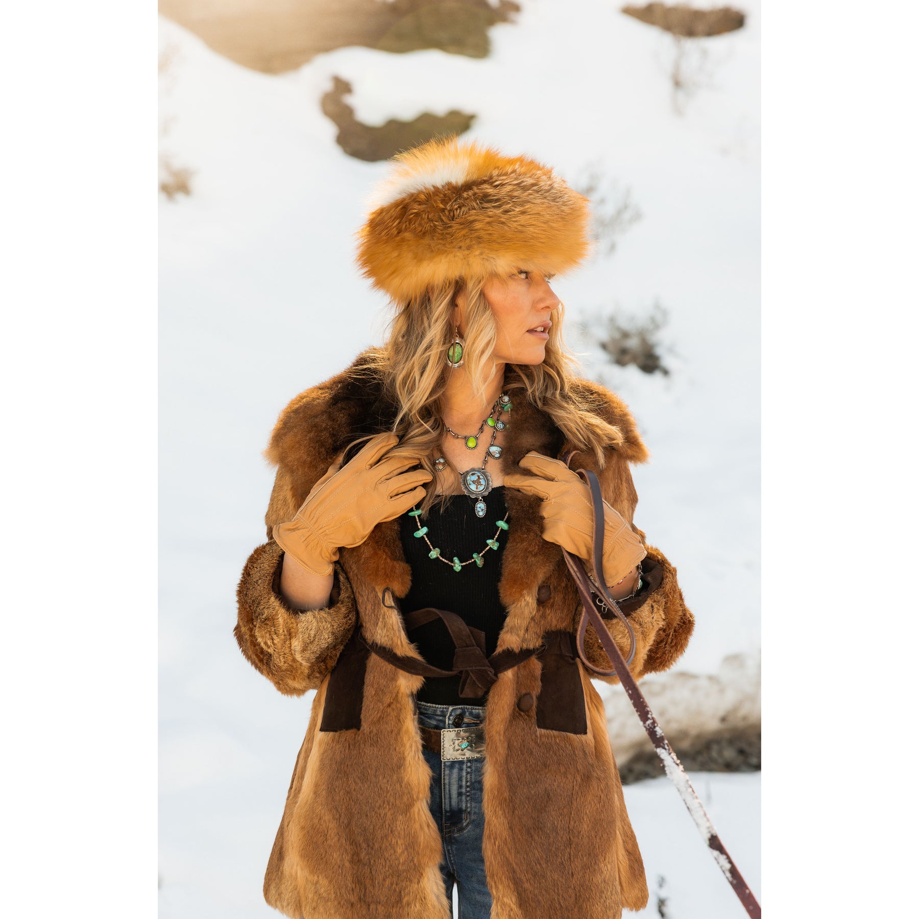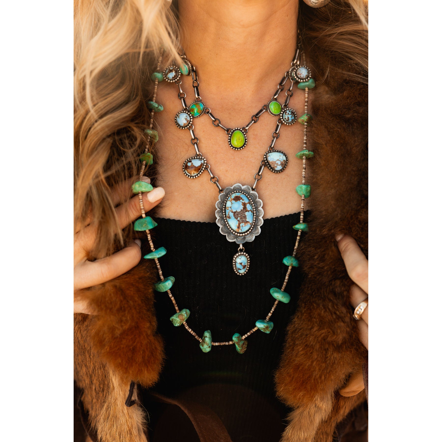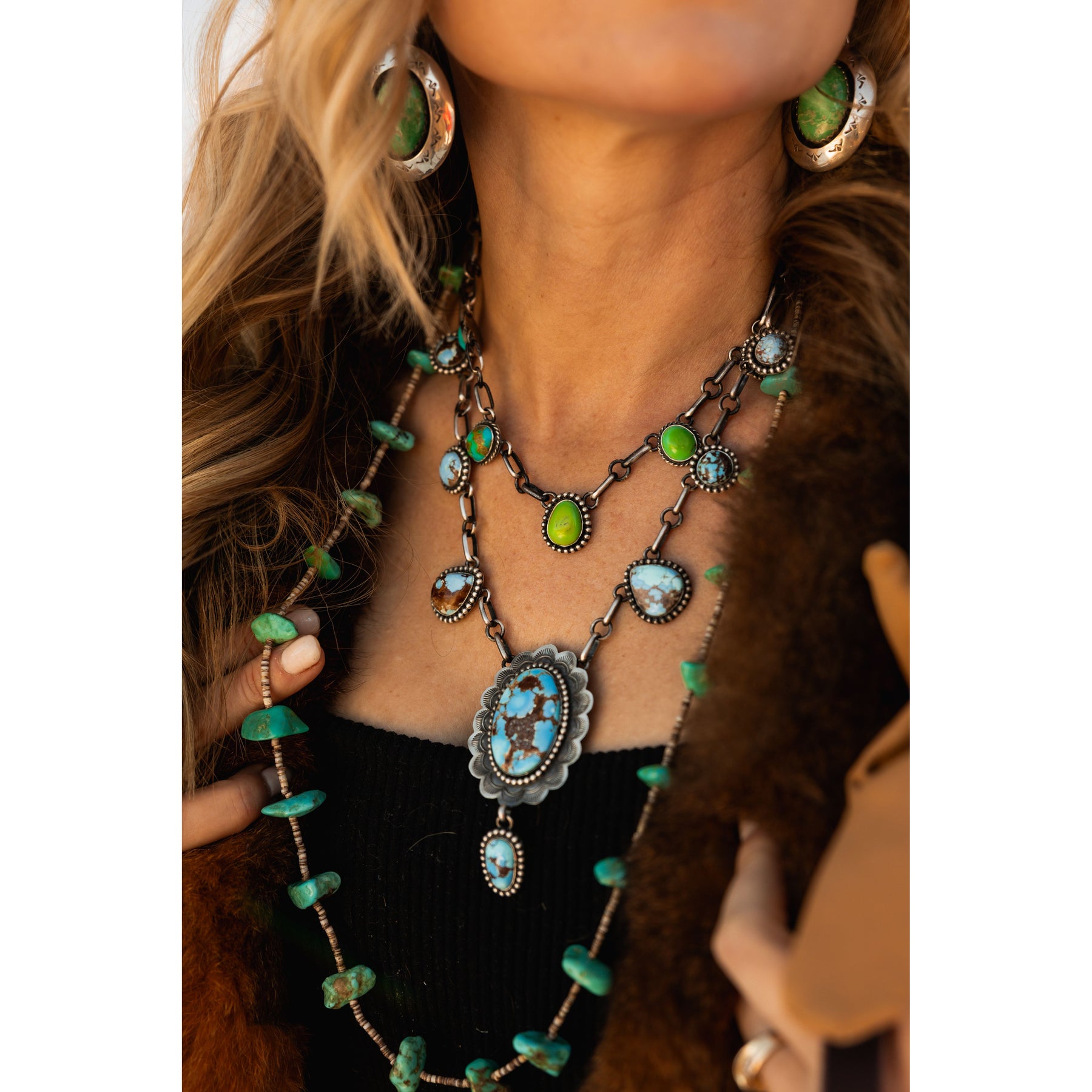 You all know how we feel about Golden Hills Turquoise around here! We love the blue. Set in smooth silver bezels with all the fixings (look at the concho scalloped center), and of course Leigha's handmade chain that we adore. It's the caviar to slow made jewelry.