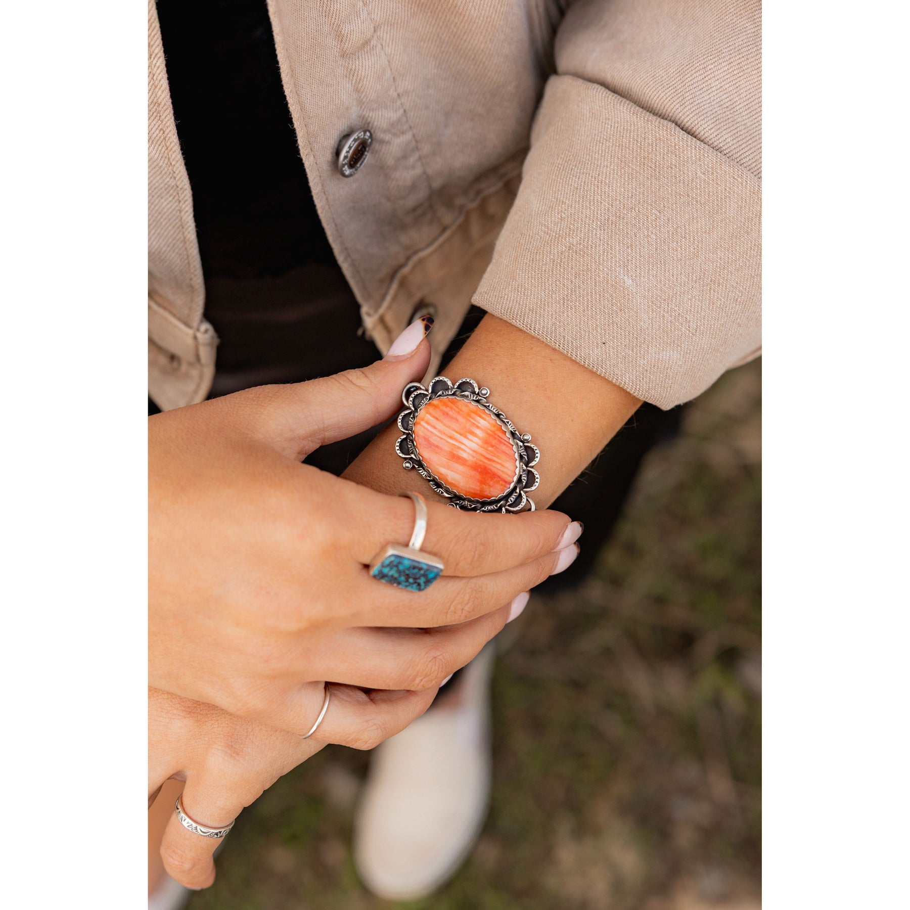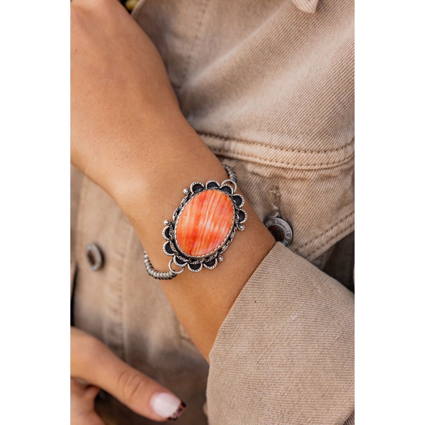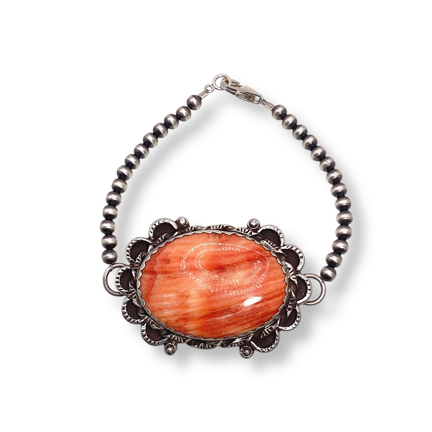 Handcrafted by Lyanne Goodluck, this bracelet features a warm spiny oyster shell stone set in a delicate scalloped bezel, paired with lustrous Navajo pearls for a romantic, southwestern-inspired touch.