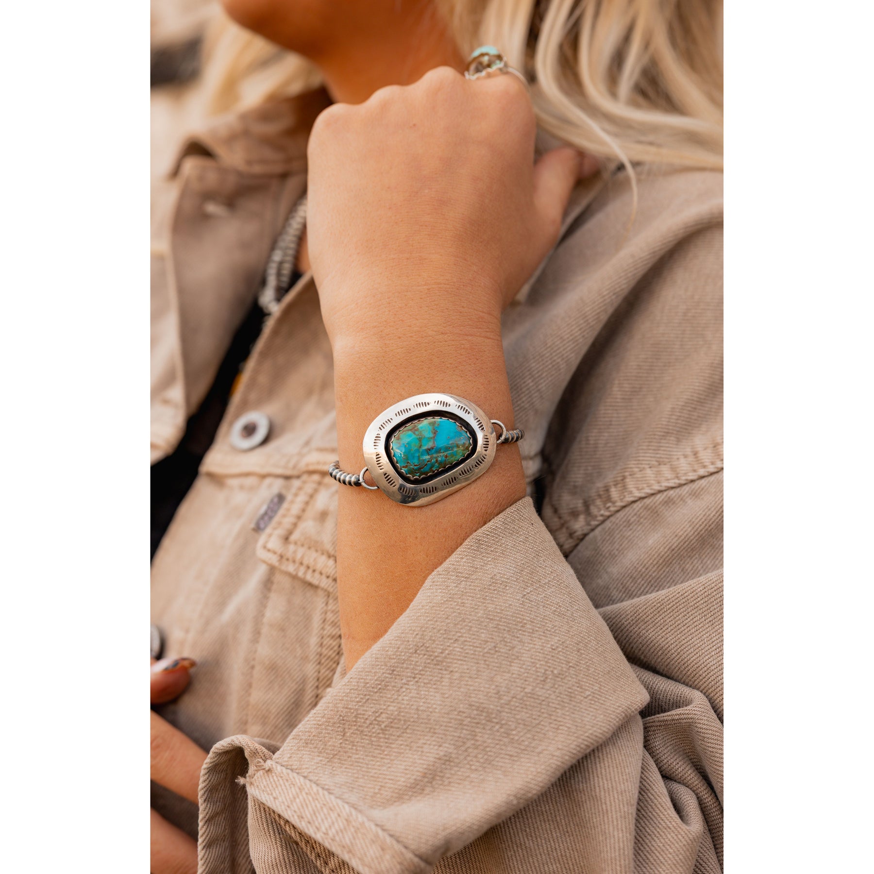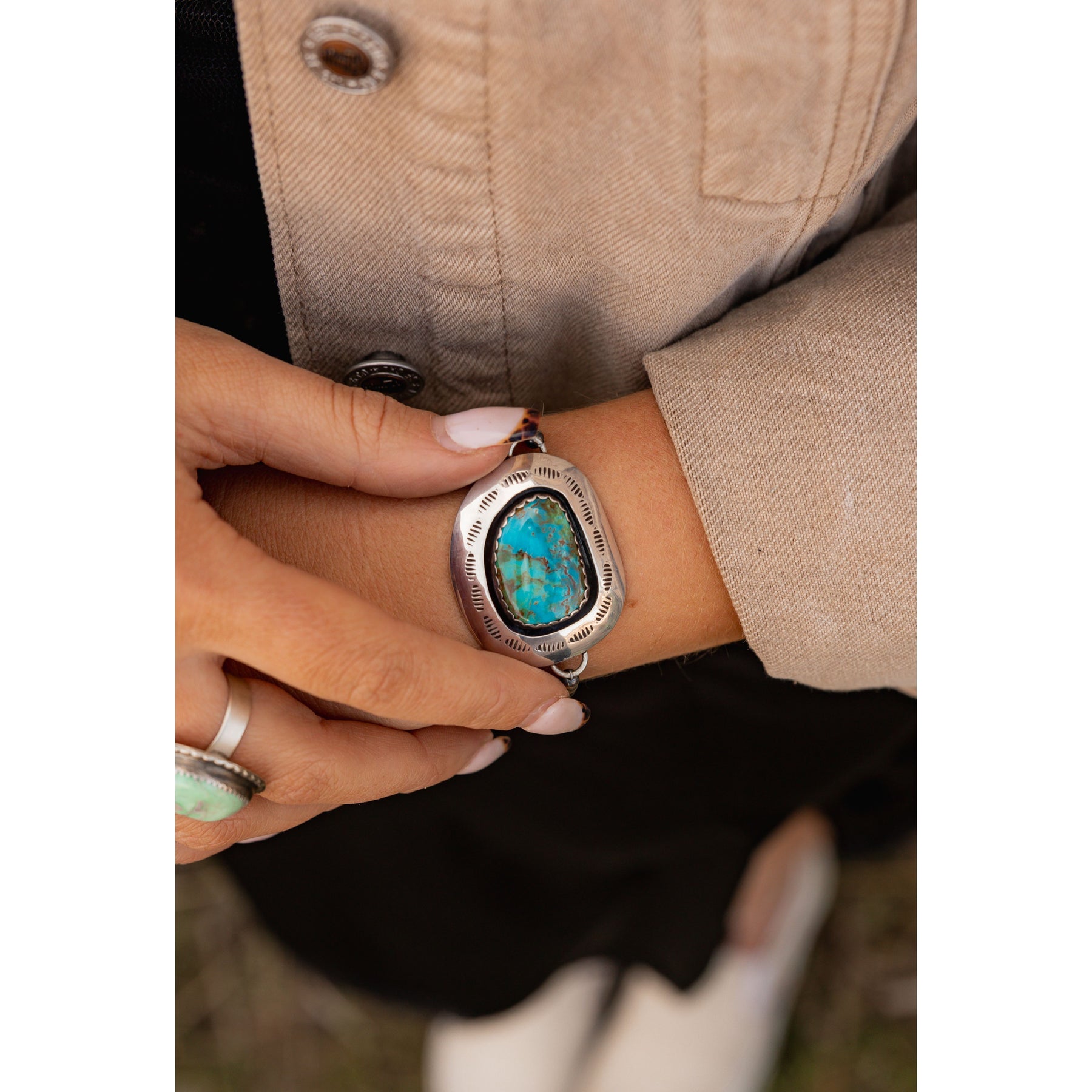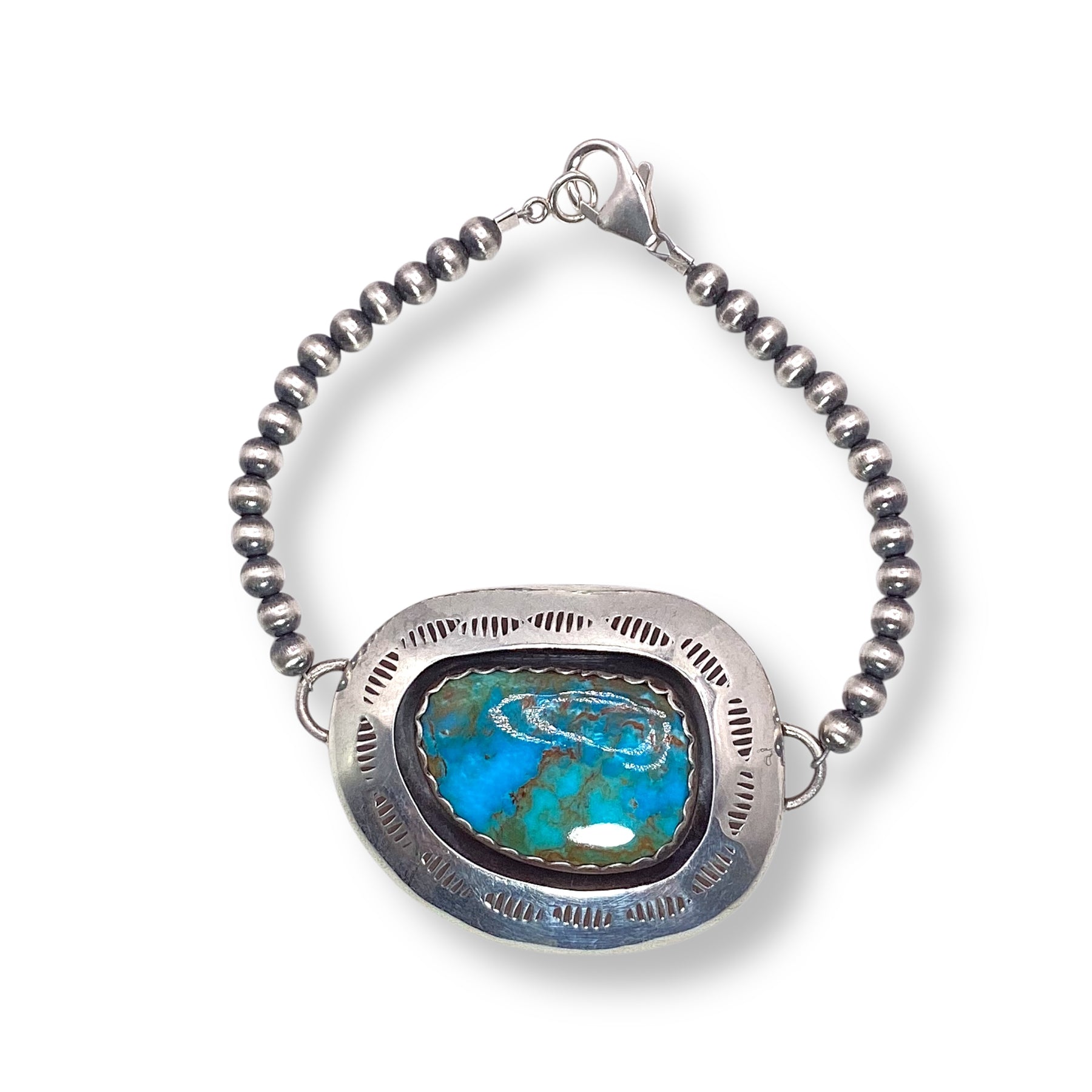 A statement piece by Lyanne Goodluck, this bracelet features vibrant turquoise set in a sterling silver shadowbox, accented with lustrous Navajo pearls. Bold, handcrafted, and full of southwestern spirit.
