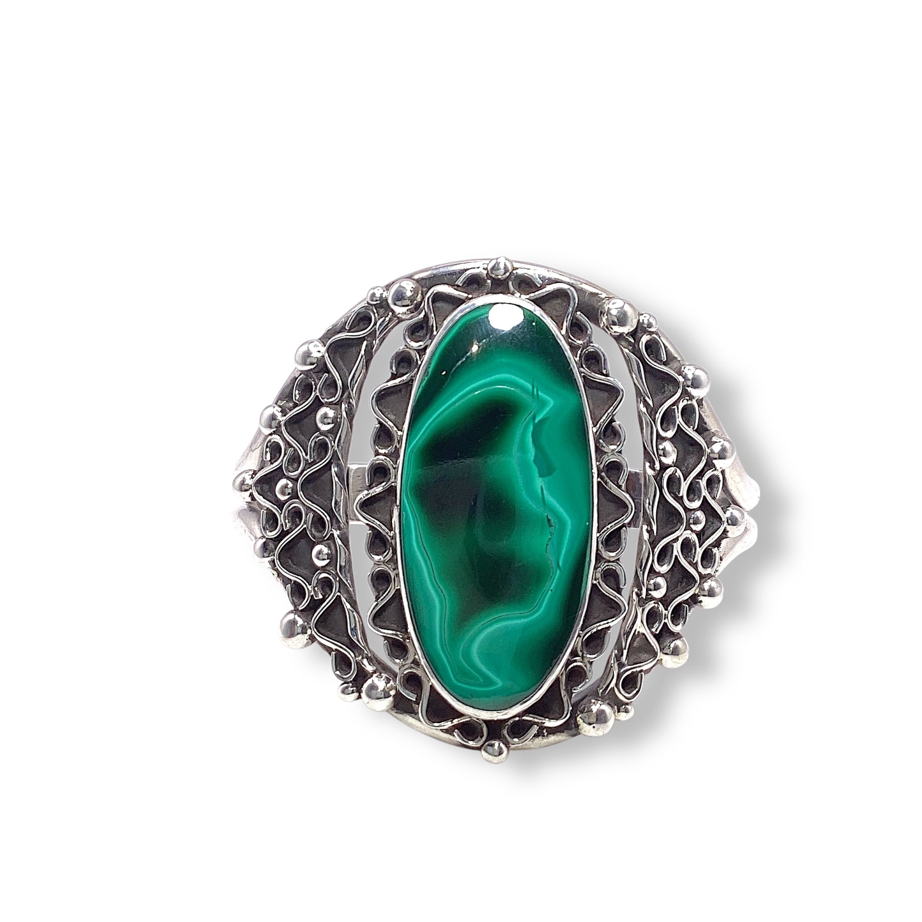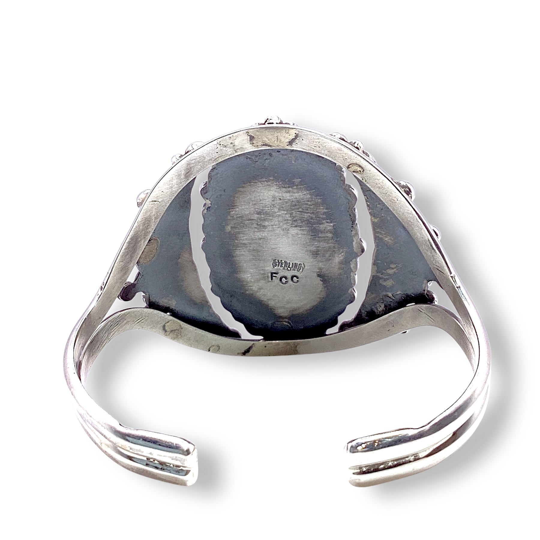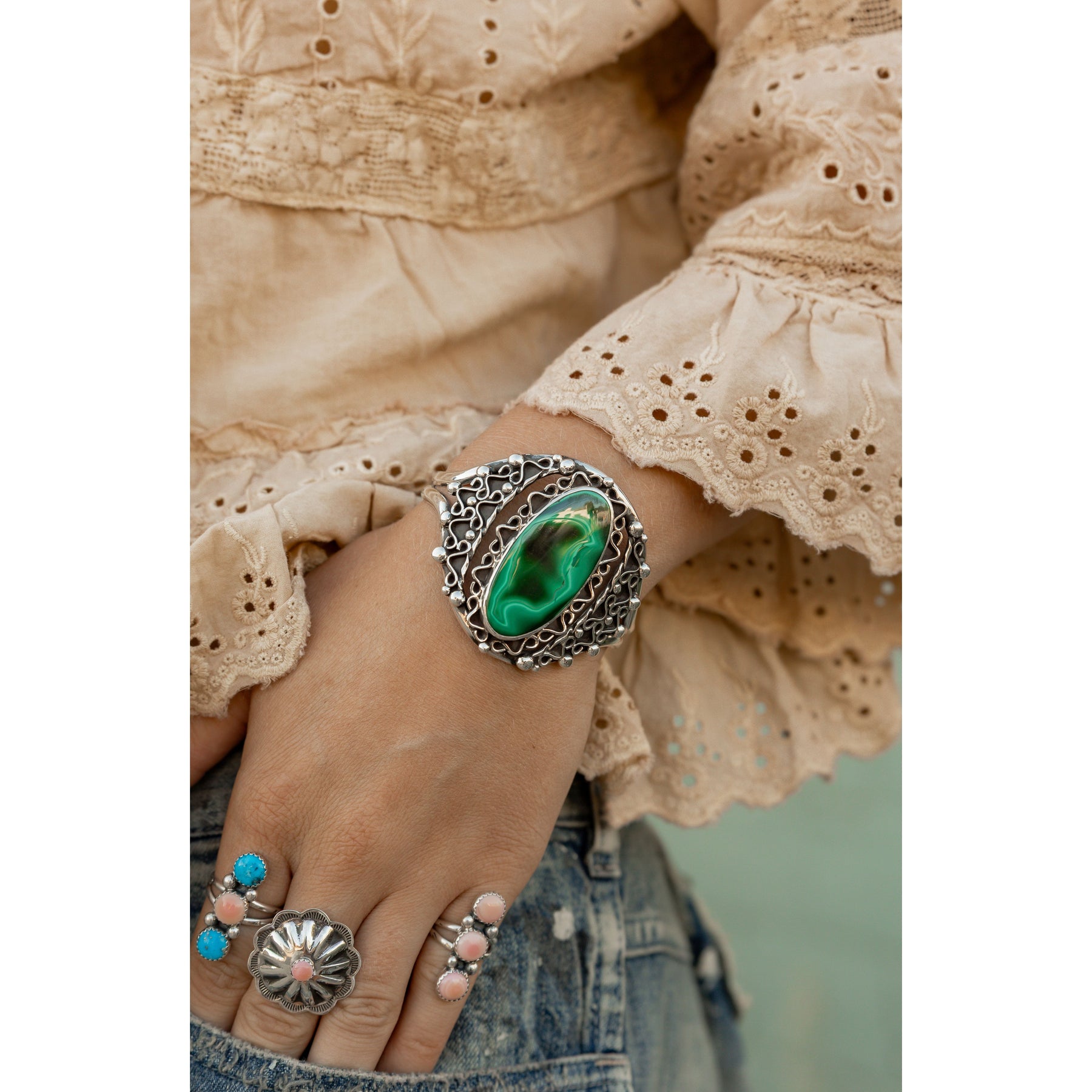 A striking handcrafted cuff featuring a rich green malachite stone set in a smooth sterling silver smooth bezel, framed by exquisite silverwork. Made by Franklin C. Crowther, son of Navajo artist Lyanne Goodluck, this piece blends bold design with refined craftsmanship.