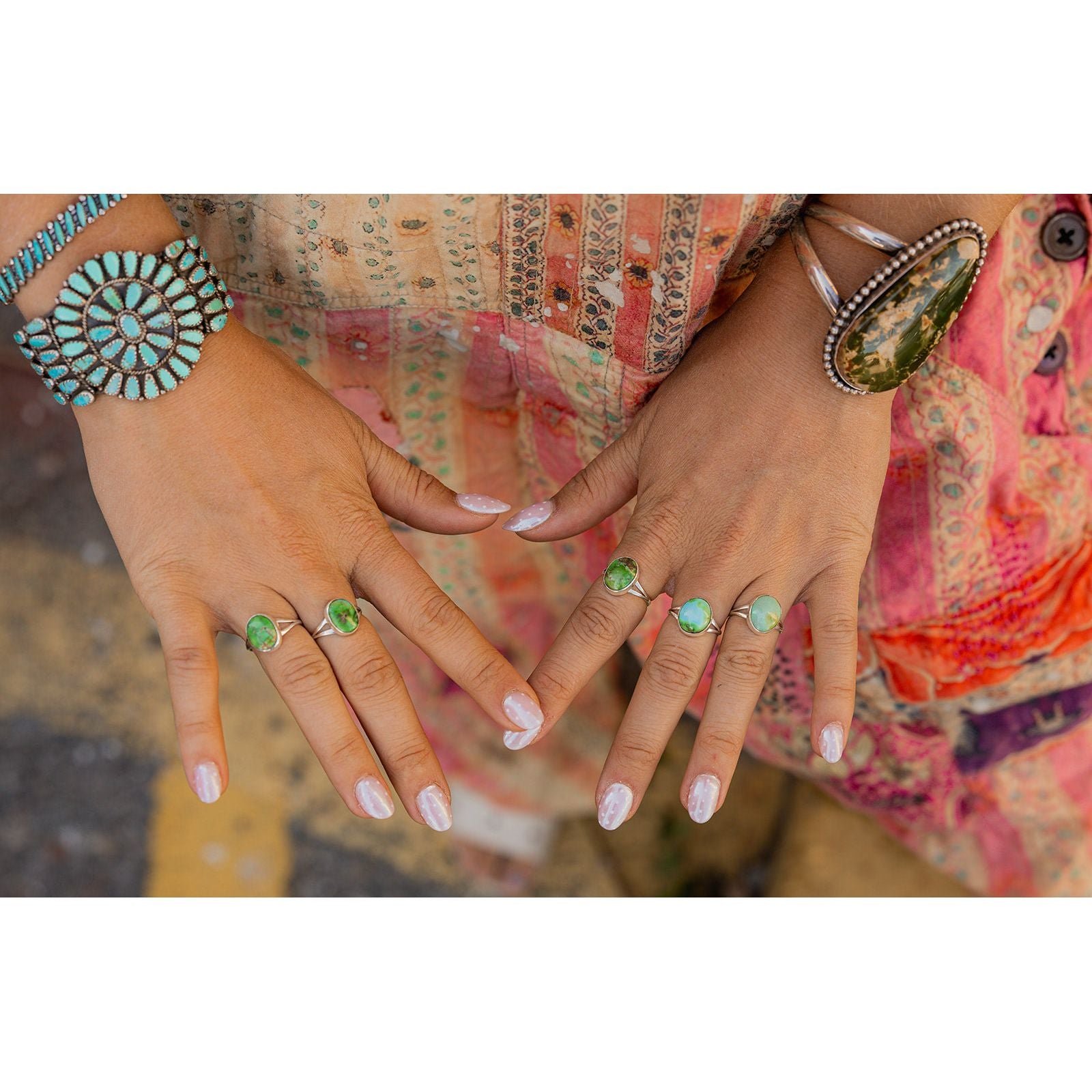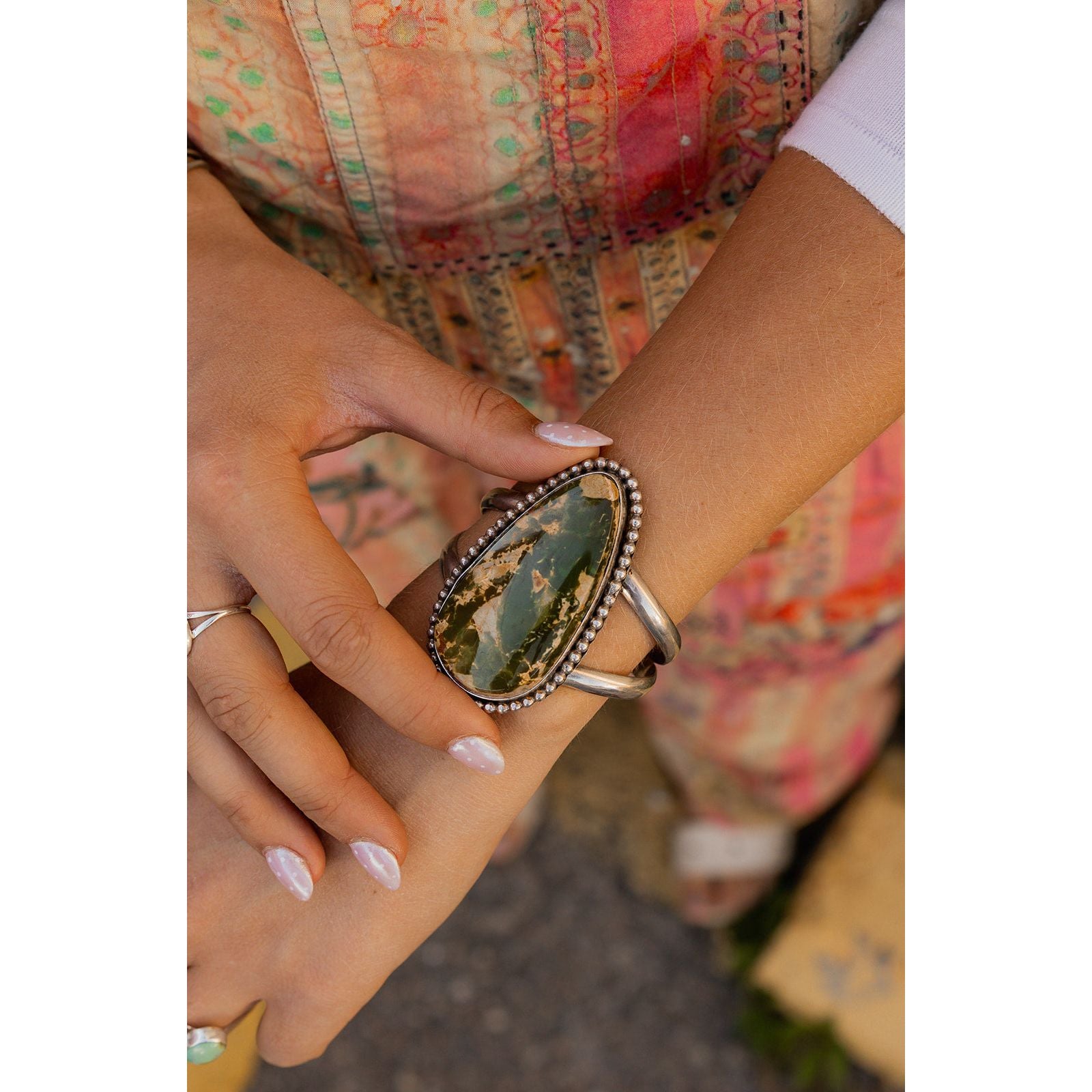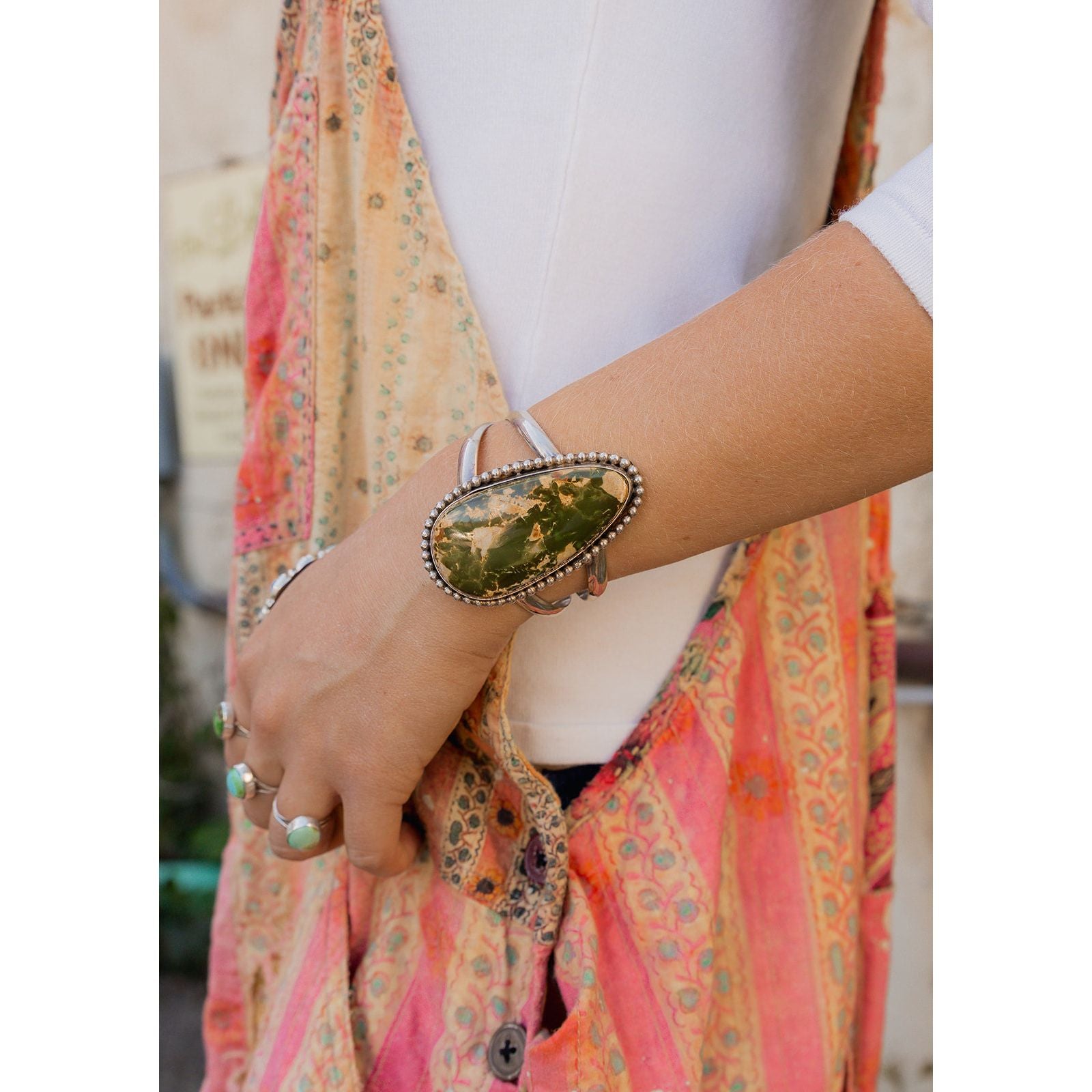 This giant Royston Turquoise bracelet by fourth-generation Native American artist Leigha Cleveland features an impressive true Royston green stone, measuring over three inches in length. Framed in a smooth silver bezel, this piece emphasizes the stone’s natural beauty without distraction, allowing the vibrant green tones to shine through. In Native culture, such a large stone not only reflects the artist’s skill but also symbolizes wealth and status within the tribe—a testament to the enduring significance of turquoise in Southwestern heritage. This bracelet is a striking piece, made to be worn and passed down for generations.Artist: Leigha Cleveland