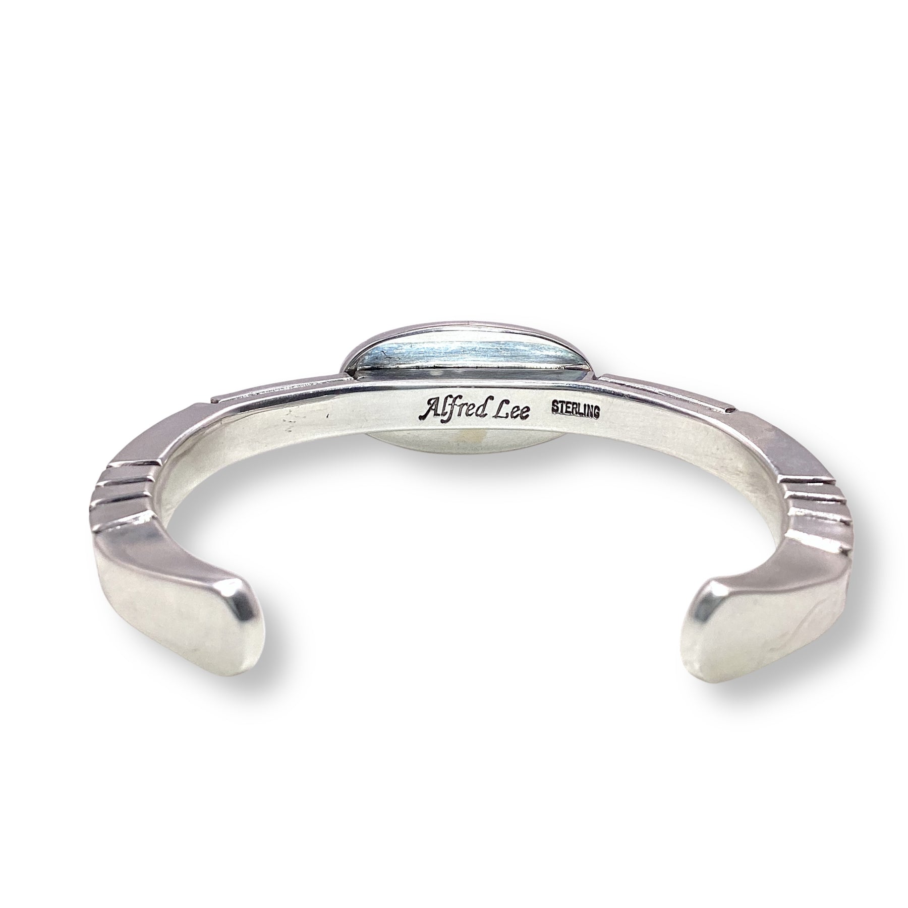 Handcrafted by renowned Navajo artist Alfred Lee, Sr., this cuff shows off a striking turquoise stone wrapped in sterling silver with detailed silverwork along a bold, polished band. A true statement piece with a Southwestern soul.