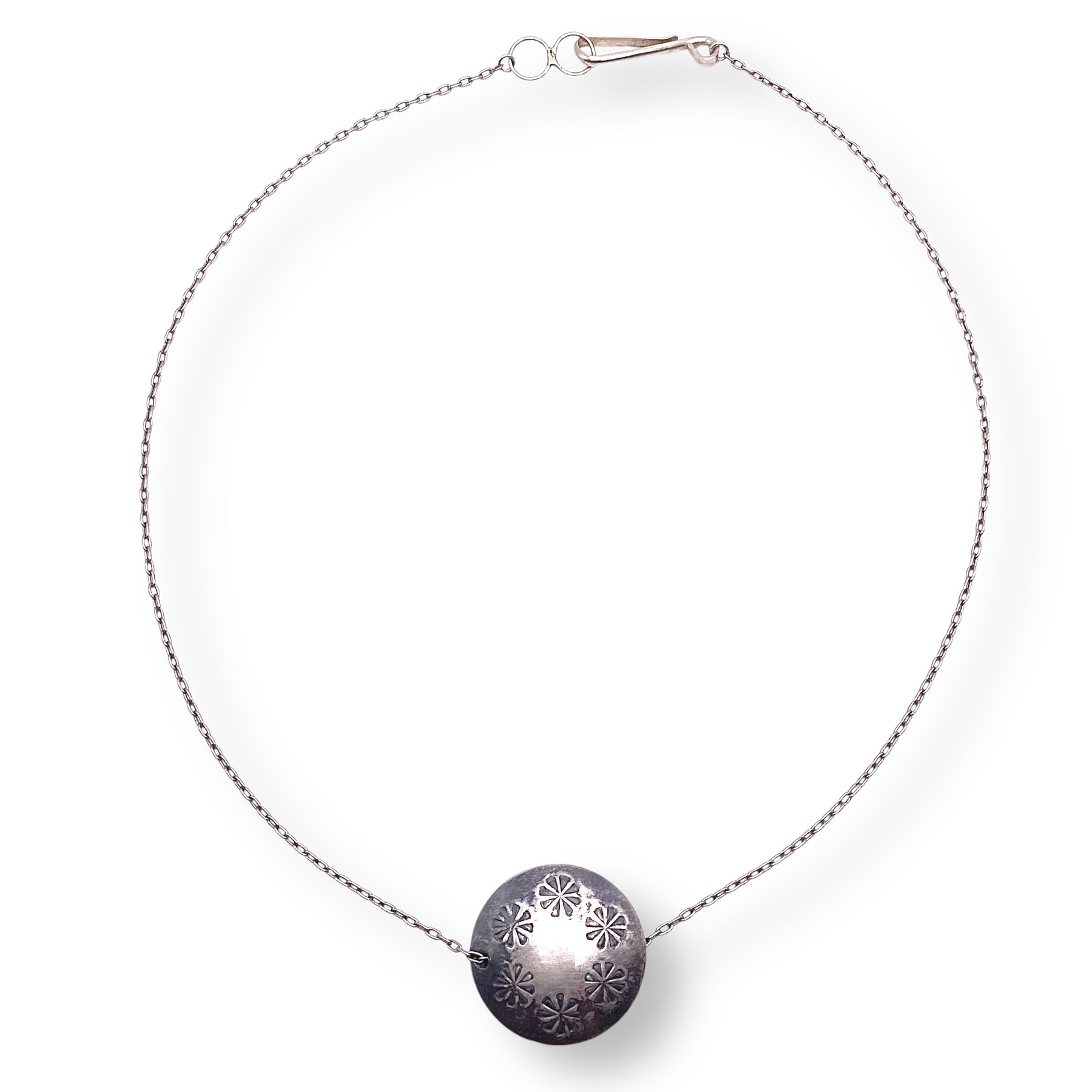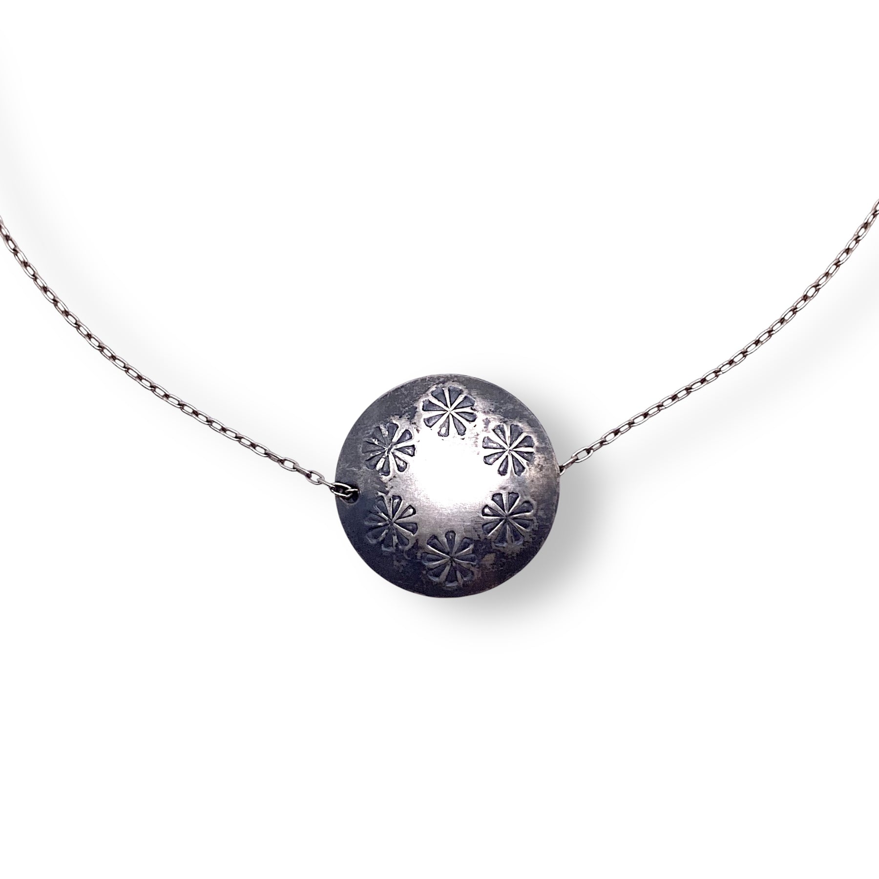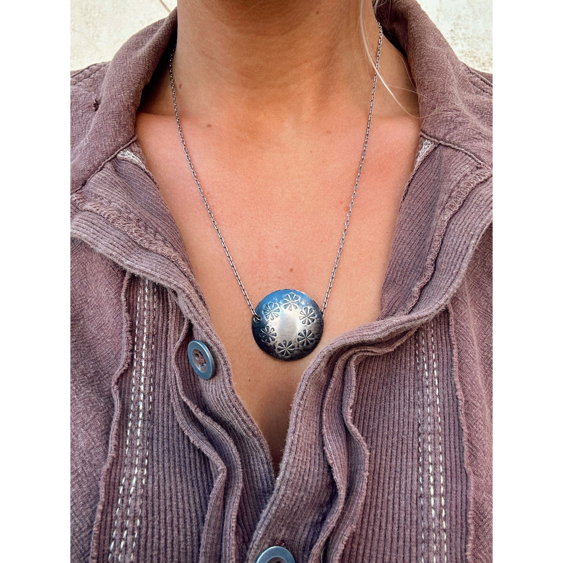 Created by Navajo artist Maryetta Daukei, this reversible necklace feels like a treasure found on a sun-soaked wander. The flower pillow-top pendant sits gracefully among smooth Navajo pearls, giving the whole piece a soft, vintage-meets-free-spirit silhouette. Each side of the pendant offers a different mood, making it the kind of necklace you can flip depending on where the day—or your heart—takes you.