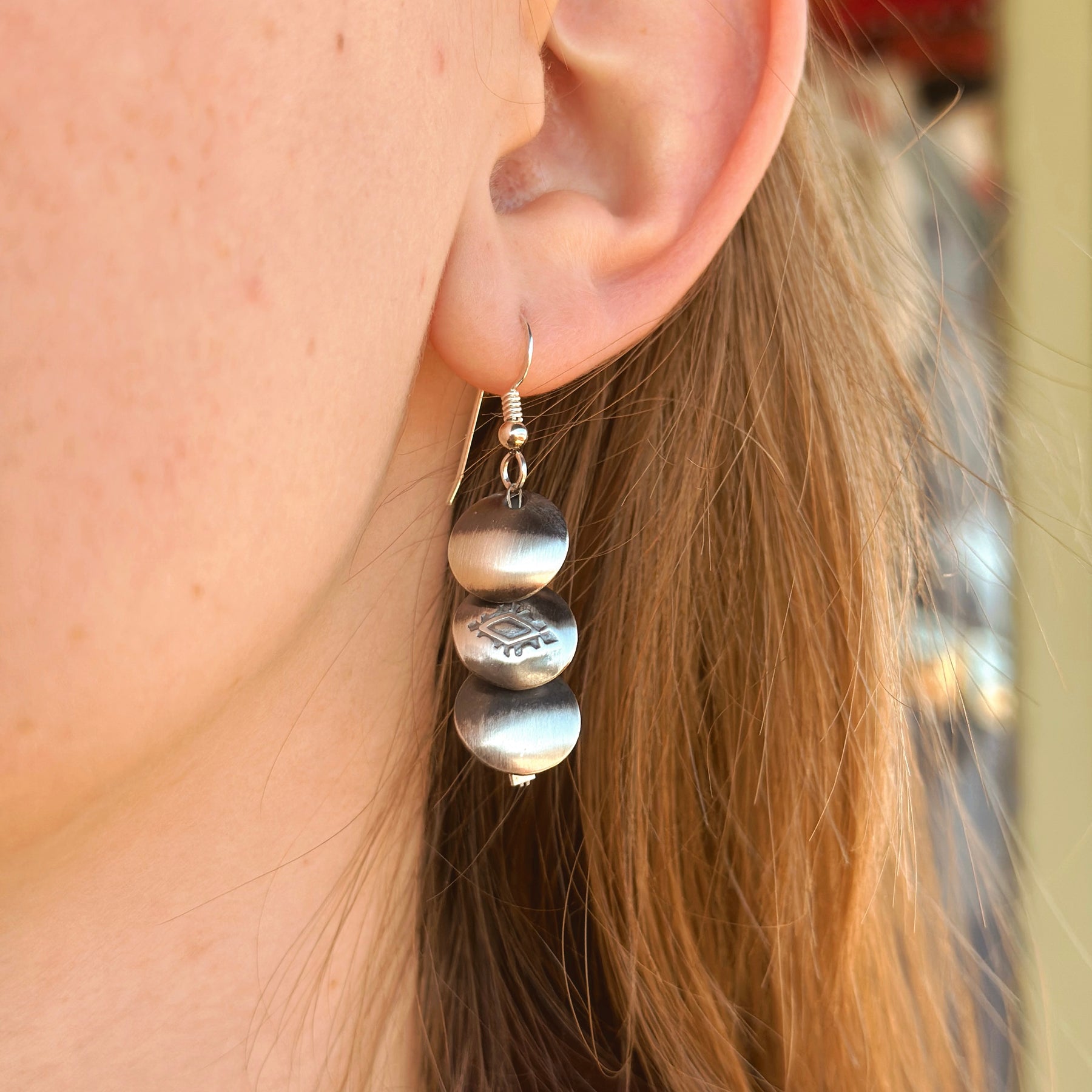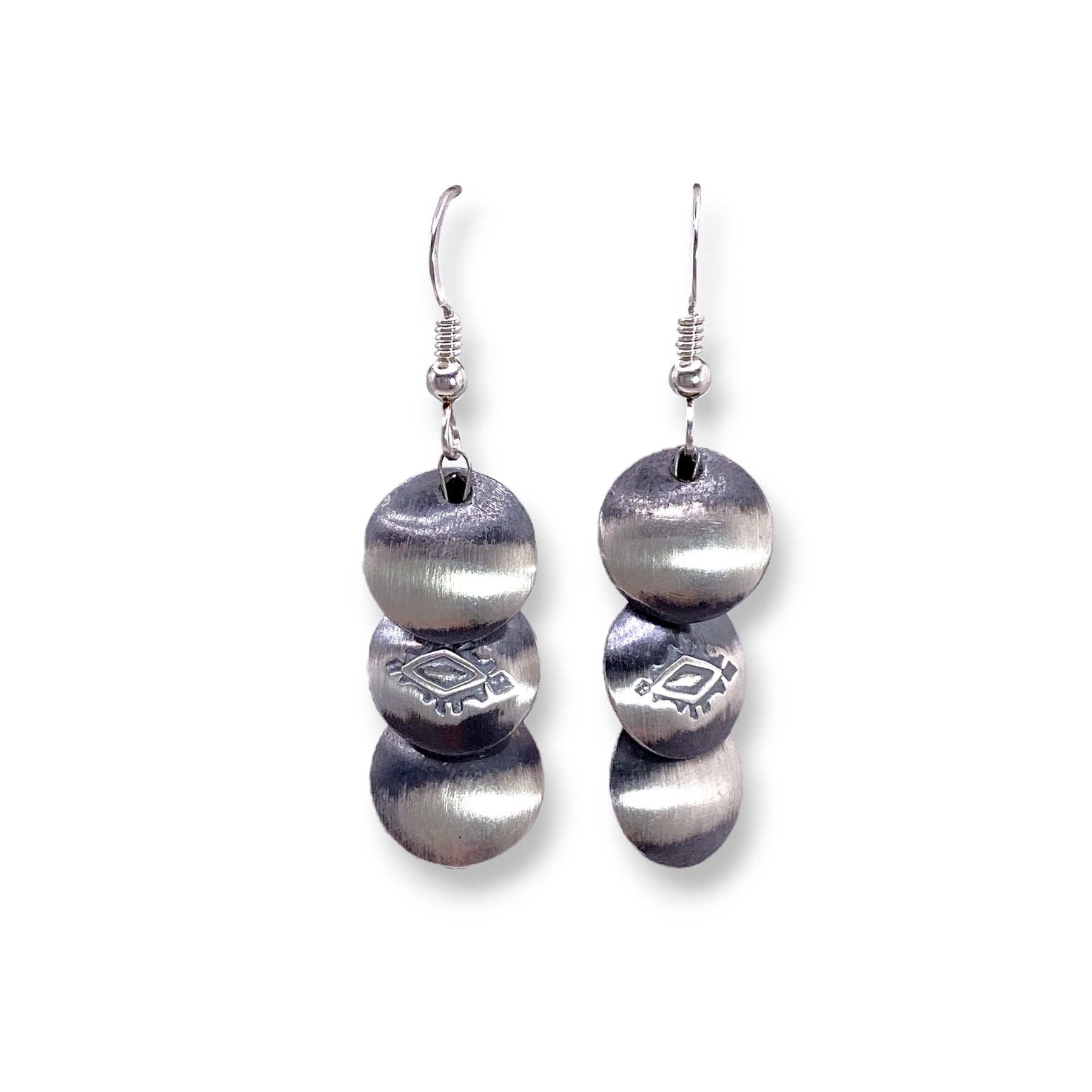 Handcrafted by Navajo artist Maryetta Daukei, these Pillow Top Navajo Pearl earrings feature a striking Aztec-inspired design that blends timeless tradition with modern edge. The domed silver and detailed stamping create a look that’s bold, textured, and effortlessly Southwestern.