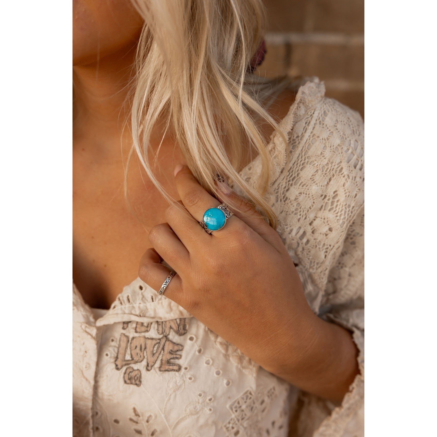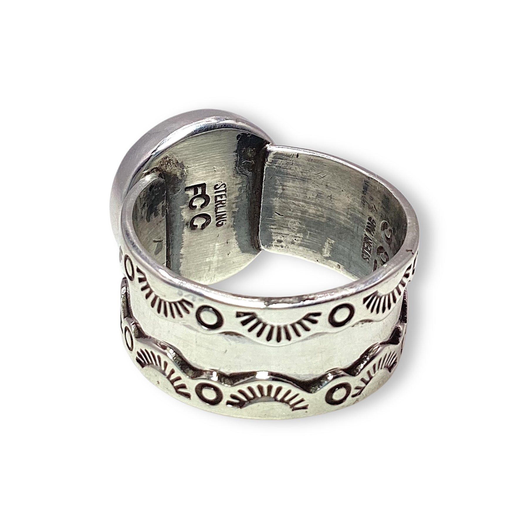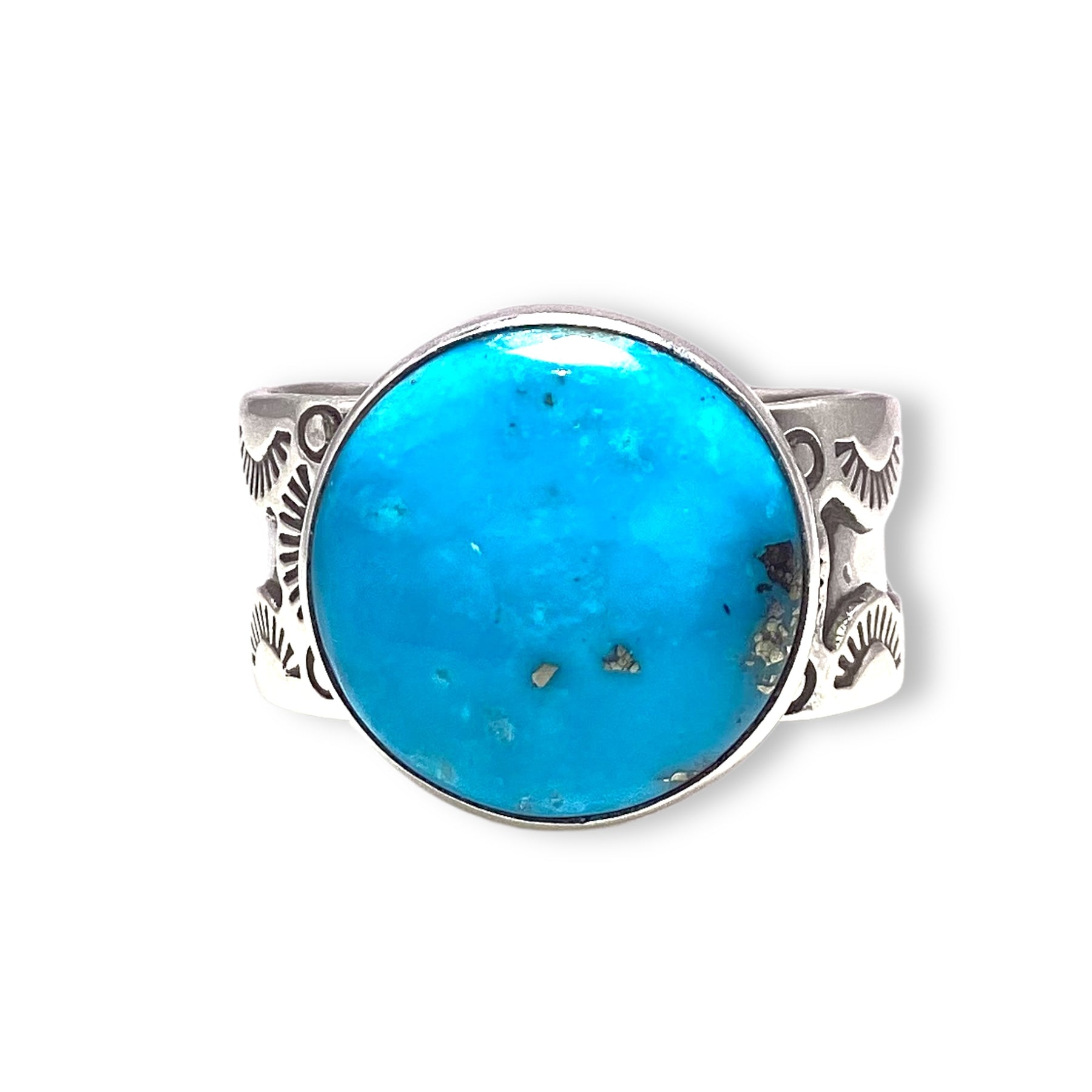 Handcrafted by Navajo artist Franklin C. Crowther, son of Lyanne Goodluck, this standout man's ring highlights a striking turquoise stone set in a smooth bezel. The wide sterling silver band is detailed with his signature silverwork, creating a piece that feels both strong and refined.