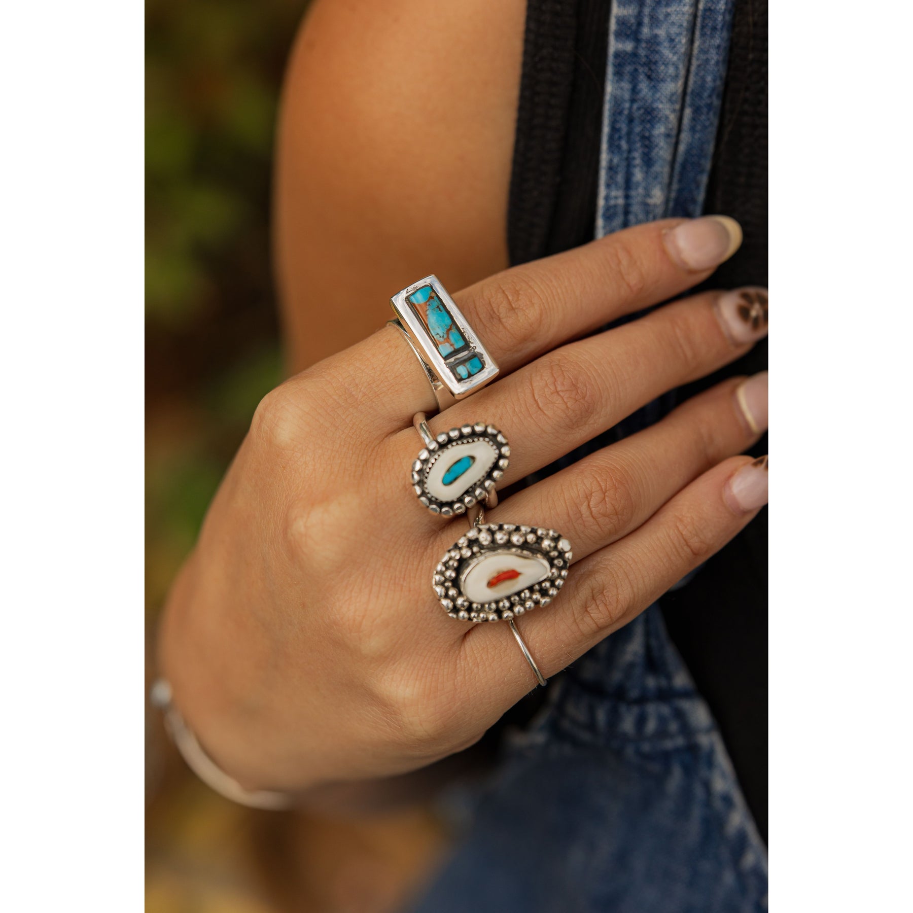 A bold Turquoise Villa Grove bar ring by silversmith, Randy Christensen, set in smooth sterling silver that lets the stone’s vivid blue steal the show. Sleek lines and a modern edge meet timeless Southwestern craftsmanship.