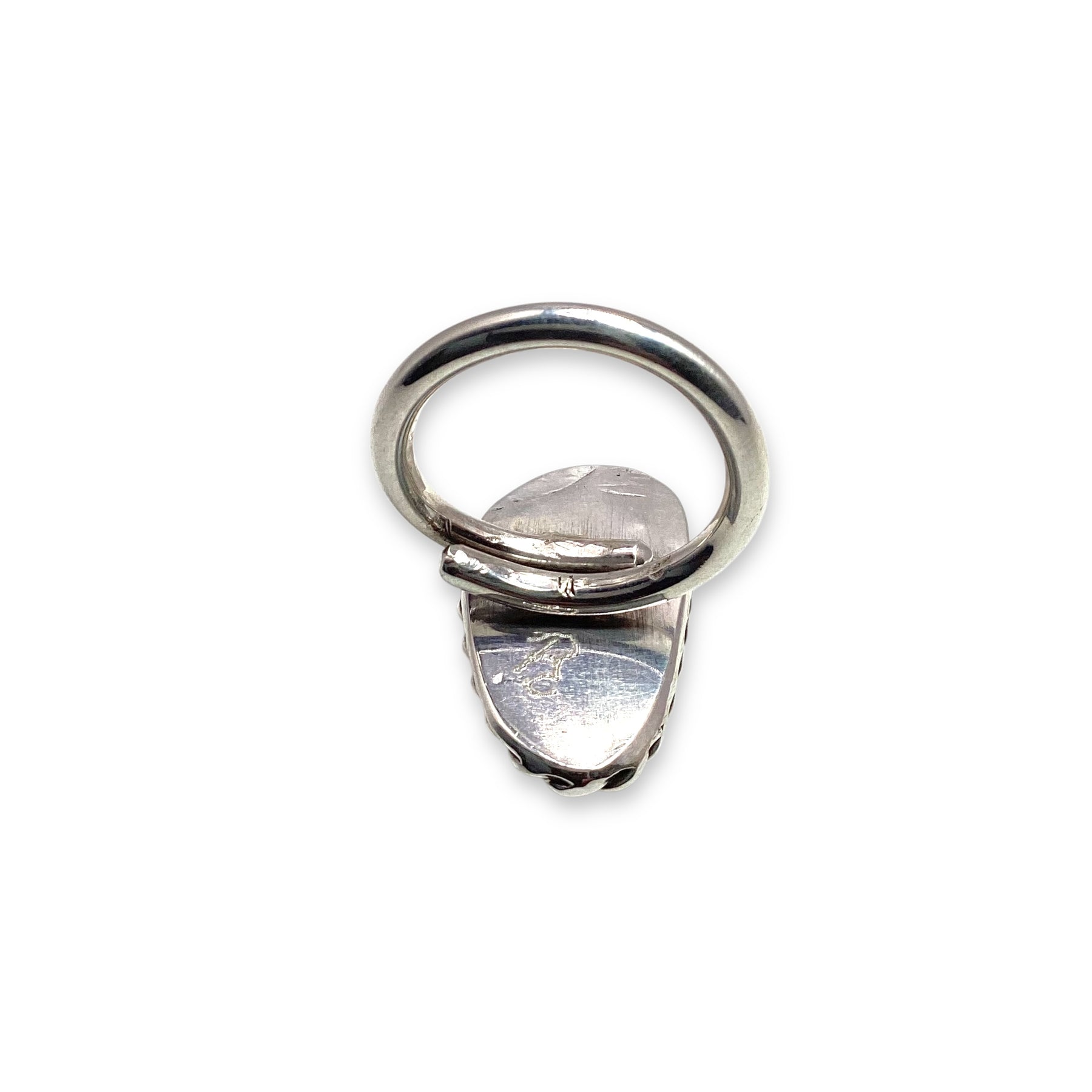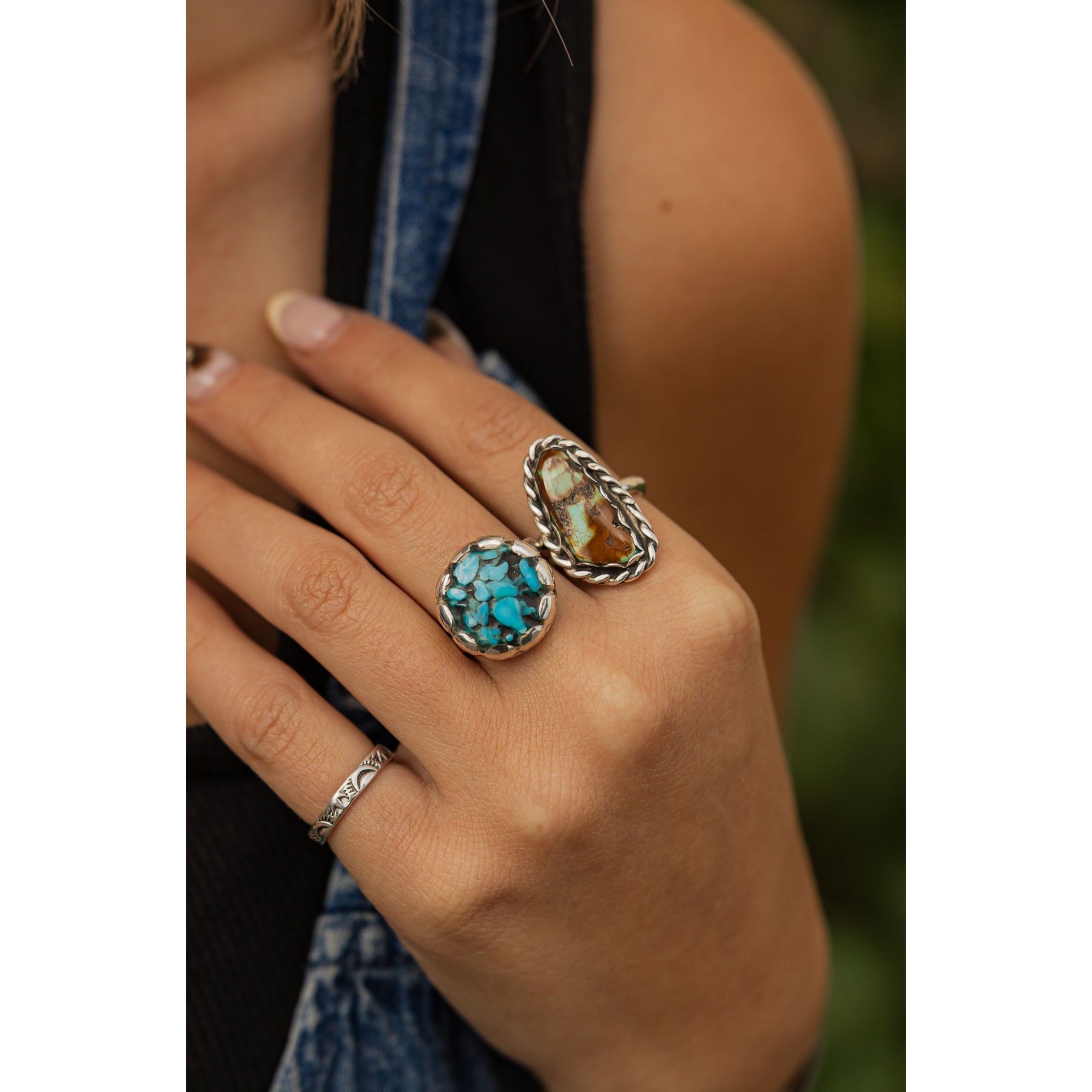 Bold and full of spirit, this Randy Christensen Cow Springs Turquoise ring is a showstopper. The stone’s rich, earthy brown is framed in a scalloped sterling silver bezel, accented with a braided rope design that feels both timeless and powerful. It’s a piece that makes a statement without even trying.