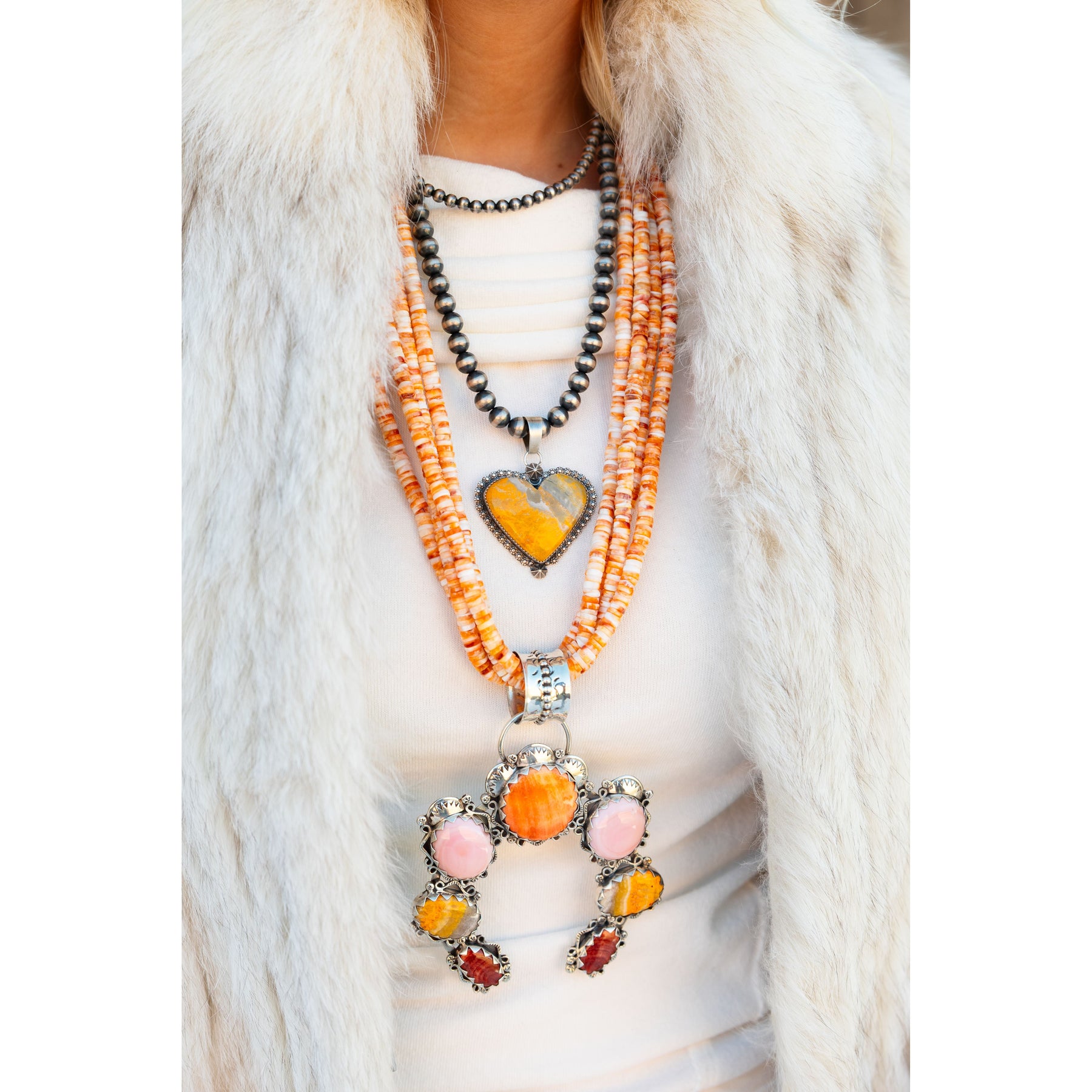 A burst of warm, earthy tones, this 4-strand necklace by Santo Domingo artist Fannie Garcia pairs vibrant spiny oyster with classic heishi shell beads. Each strand drapes effortlessly, creating a layered look that’s both bold and easy to wear.