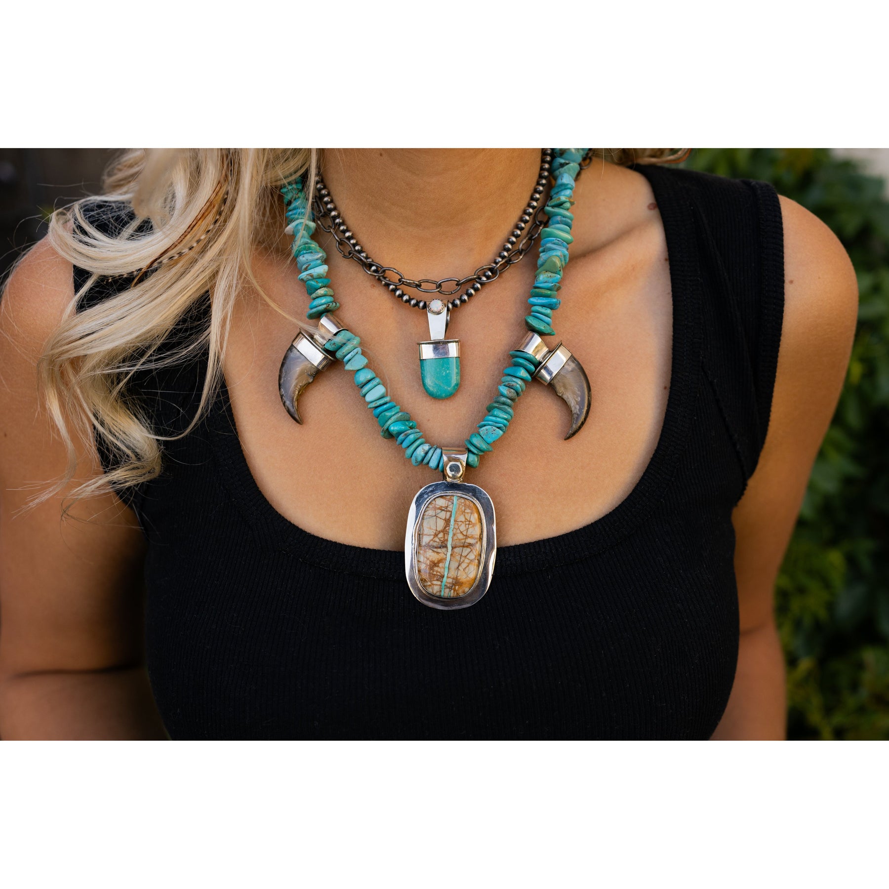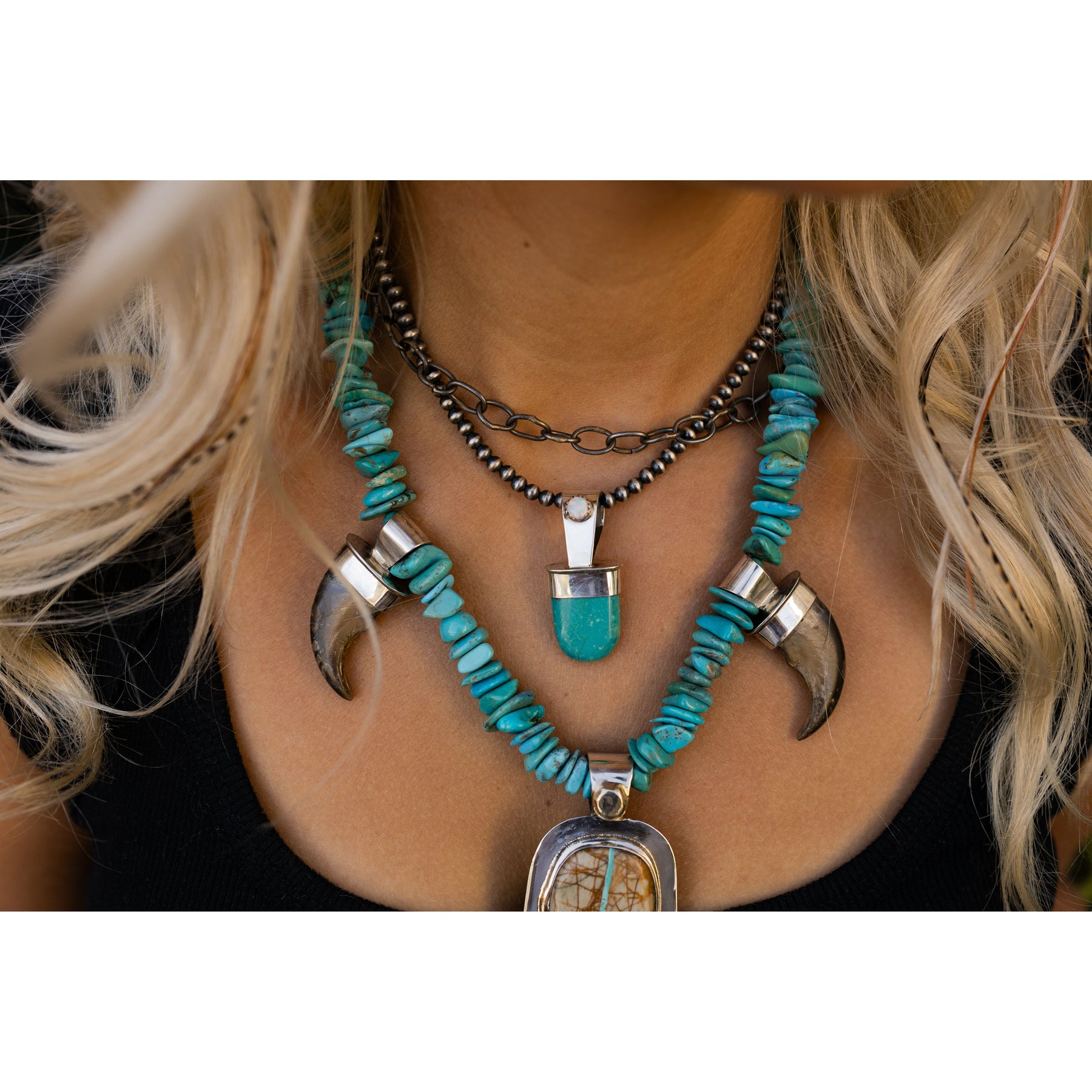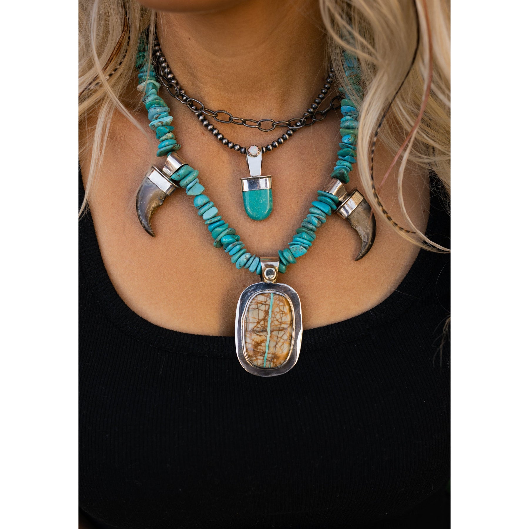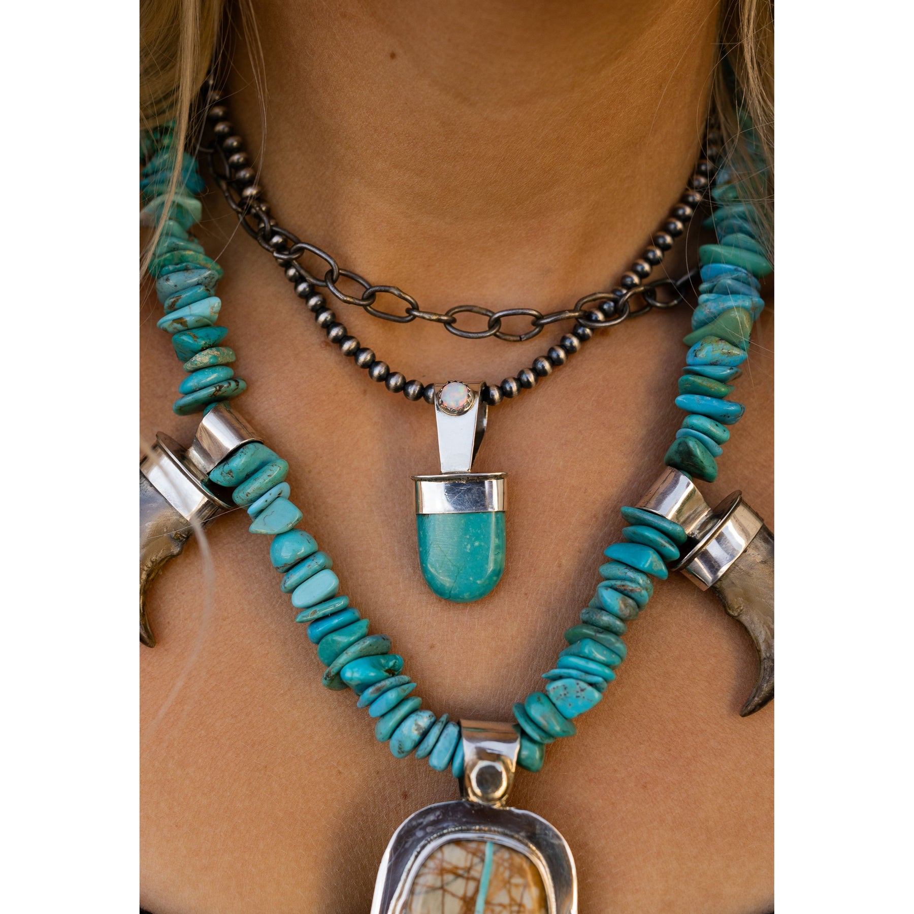A modern nod to classic Southwest style — this turquoise pendant by Jody Sawdo is all about those effortlessly cool details. Set in sterling silver with a shimmering opal accent in a sawtooth bezel, it’s the kind of piece that feels vintage-inspired but totally now.
