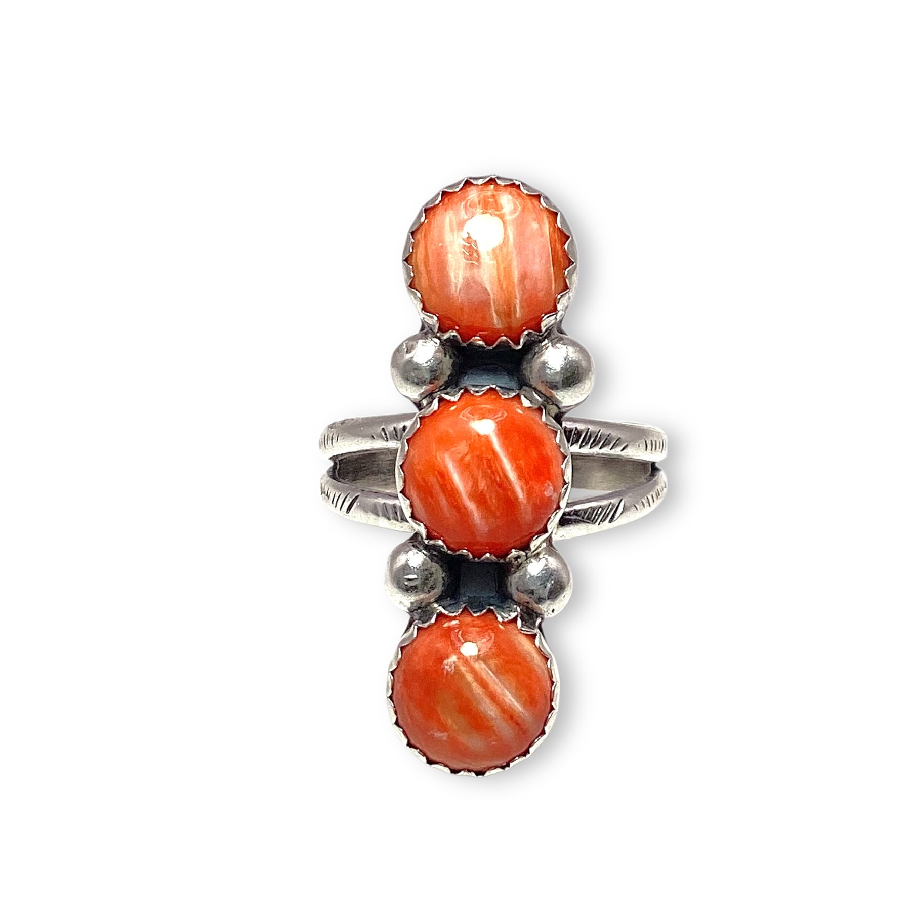 Handcrafted by Navajo artist Lyanne Goodluck, this row ring features three vibrant spiny oyster shell stones set in sterling silver sawtooth bezels. Each stone brings its own warmth and character, creating a look that’s bold yet timeless.