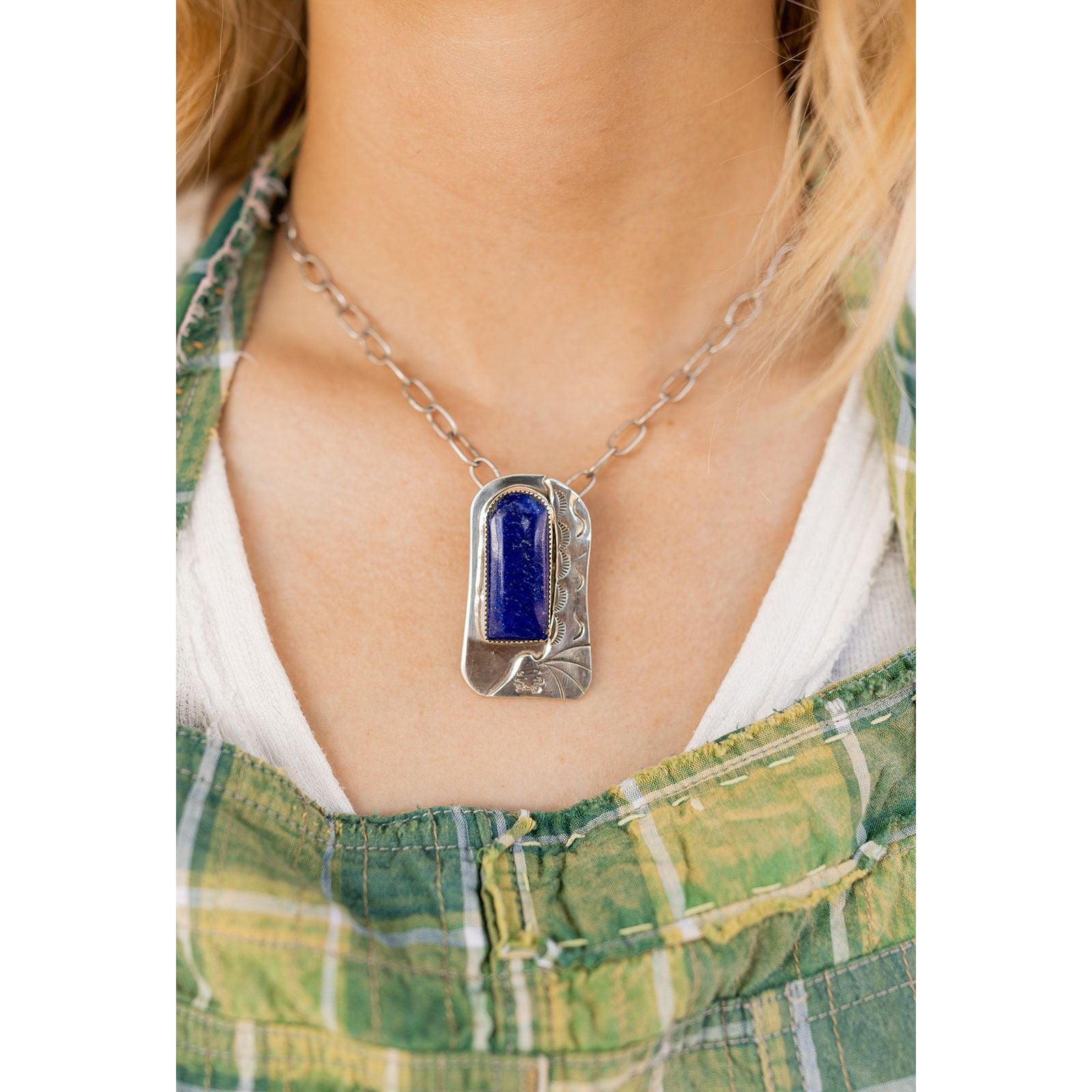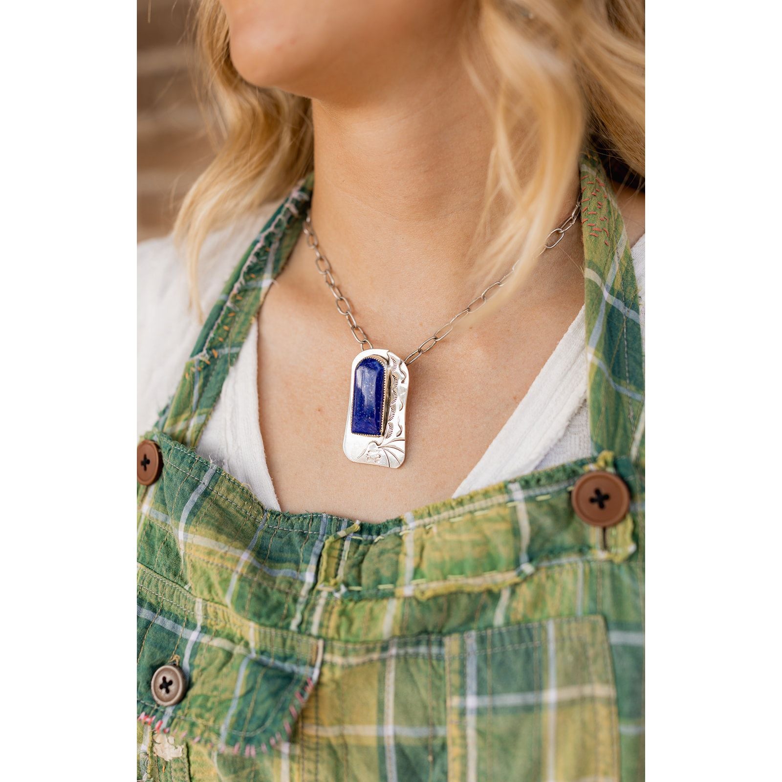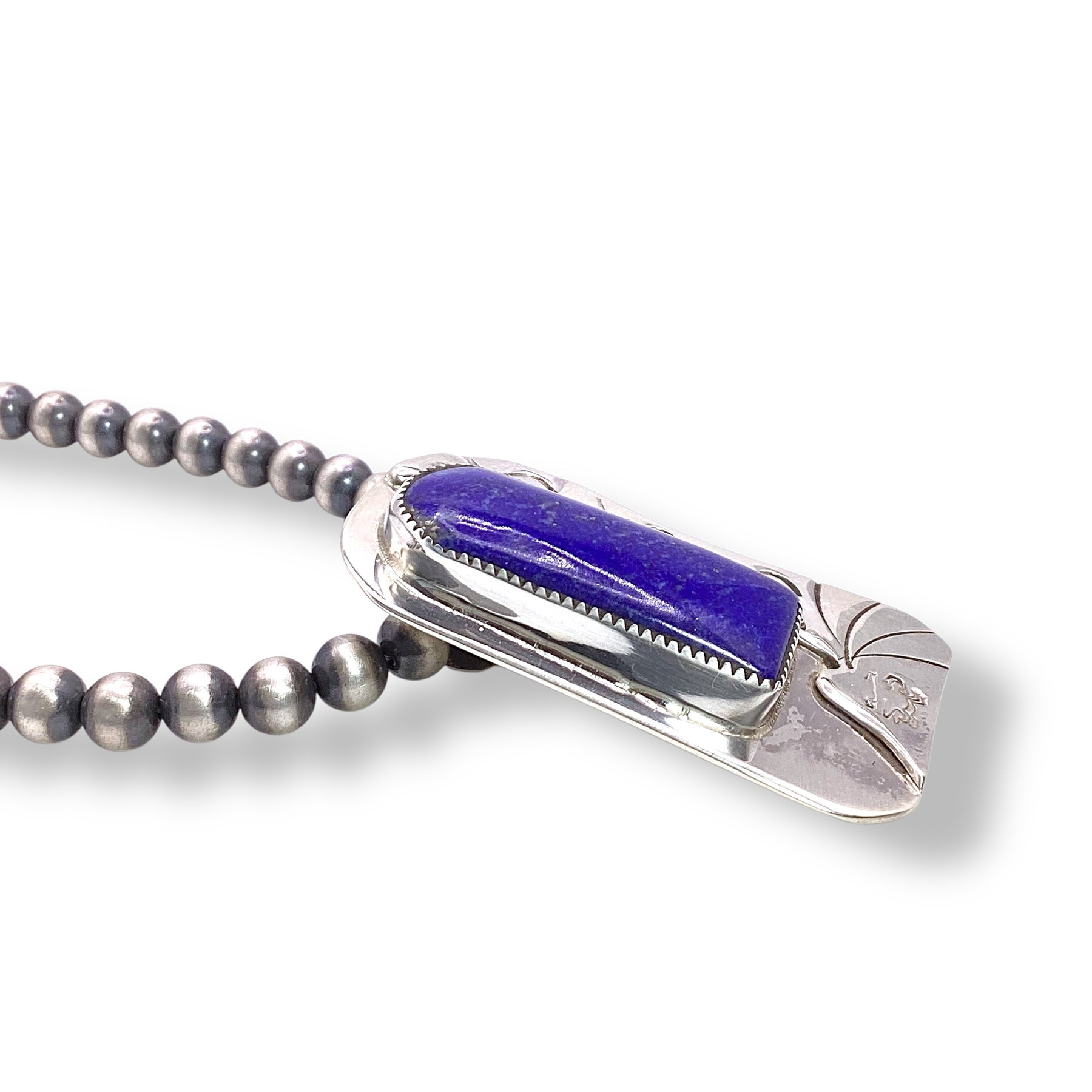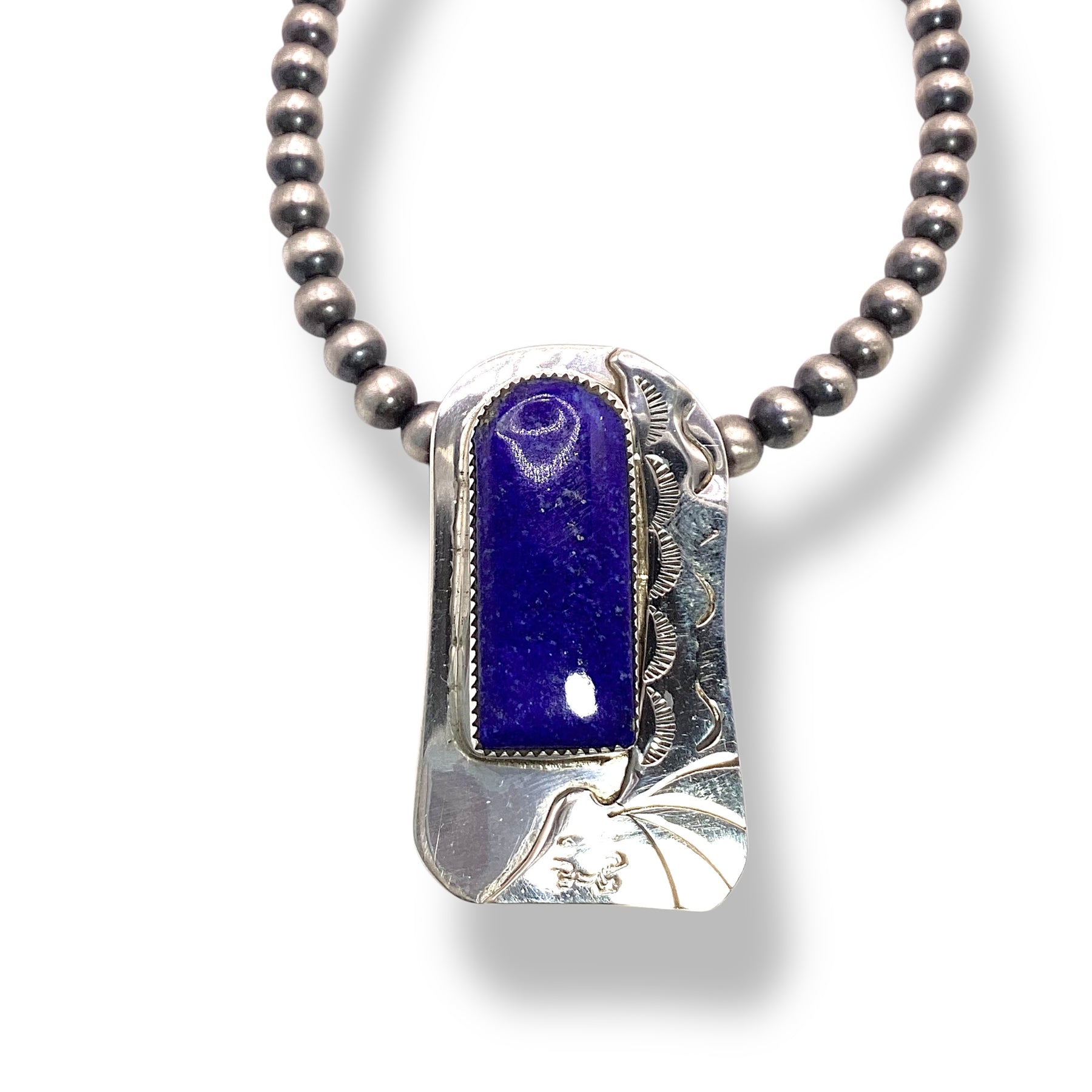 Handrafted by artist Lazaro Gutierrez, this deep blue lapis pendant is set in sterling silver and finished with detailed Southwest stampwork. A bold, earthy piece with timeless appeal.