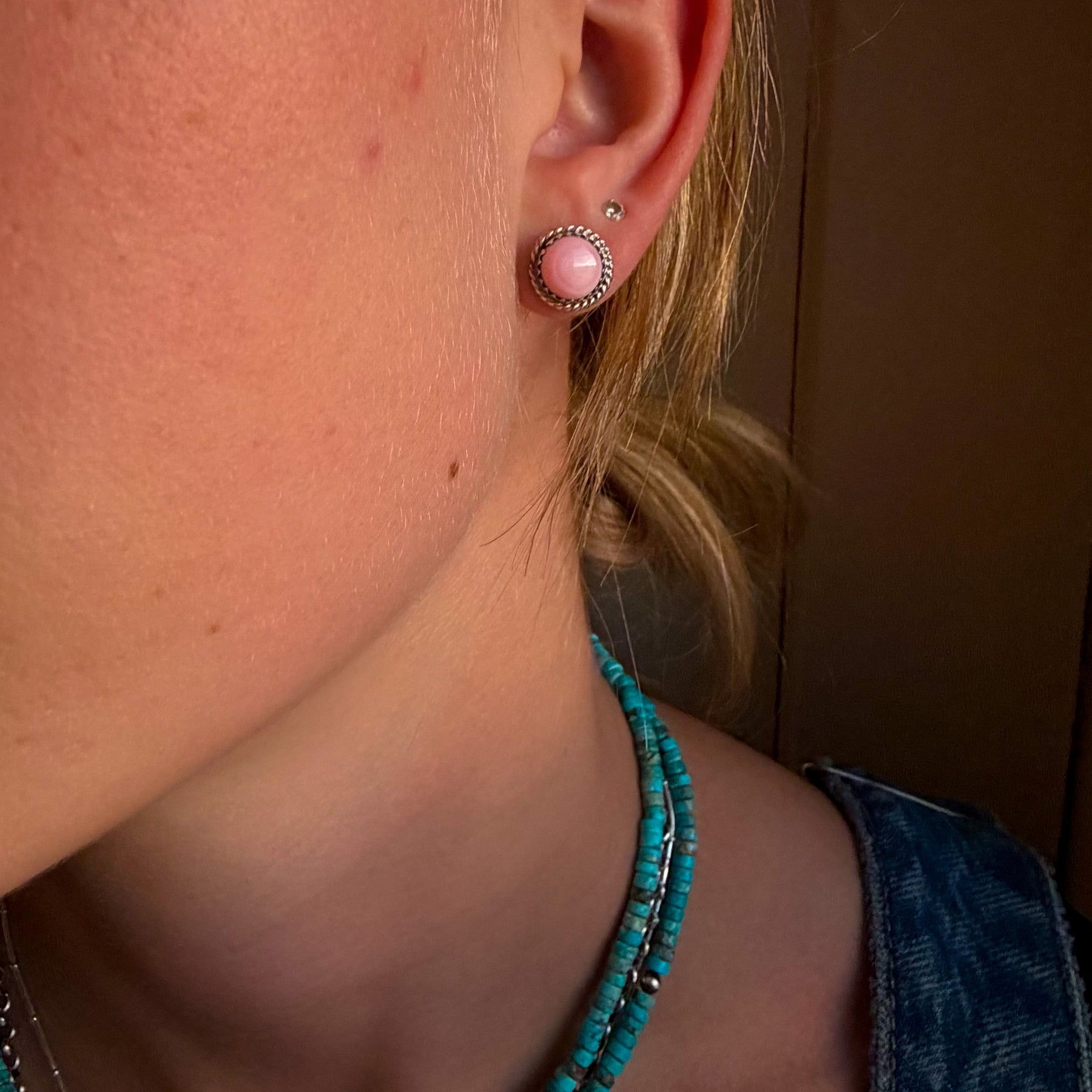 Handcrafted by Navajo artist Ester White, these stud earrings feature soft pink conch shells set in delicate sterling silver sawtooth bezels. Petite and refined, they carry a gentle, feminine charm that feels light and effortlessly elegant.