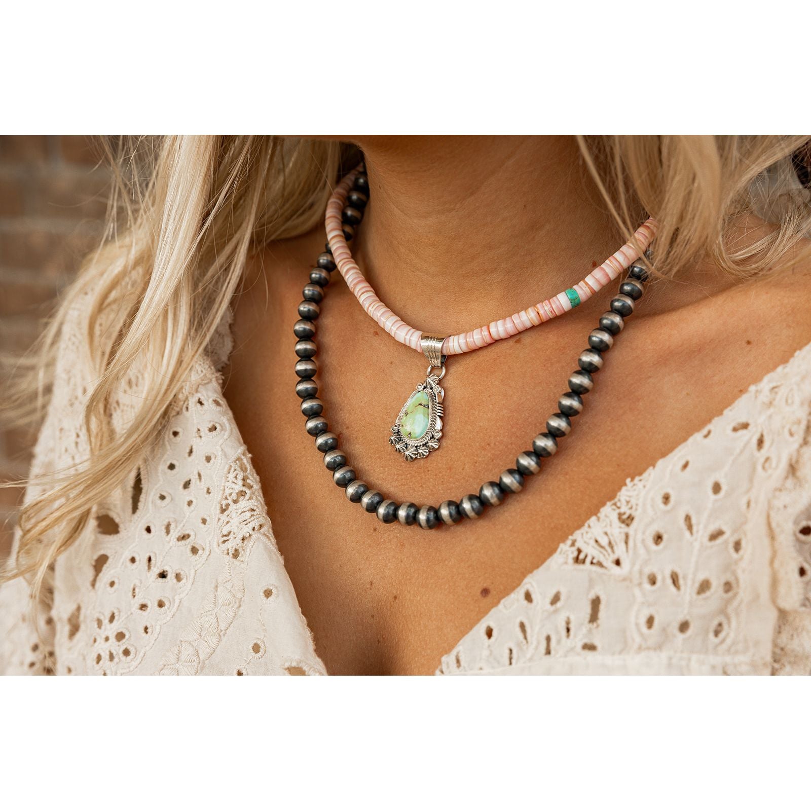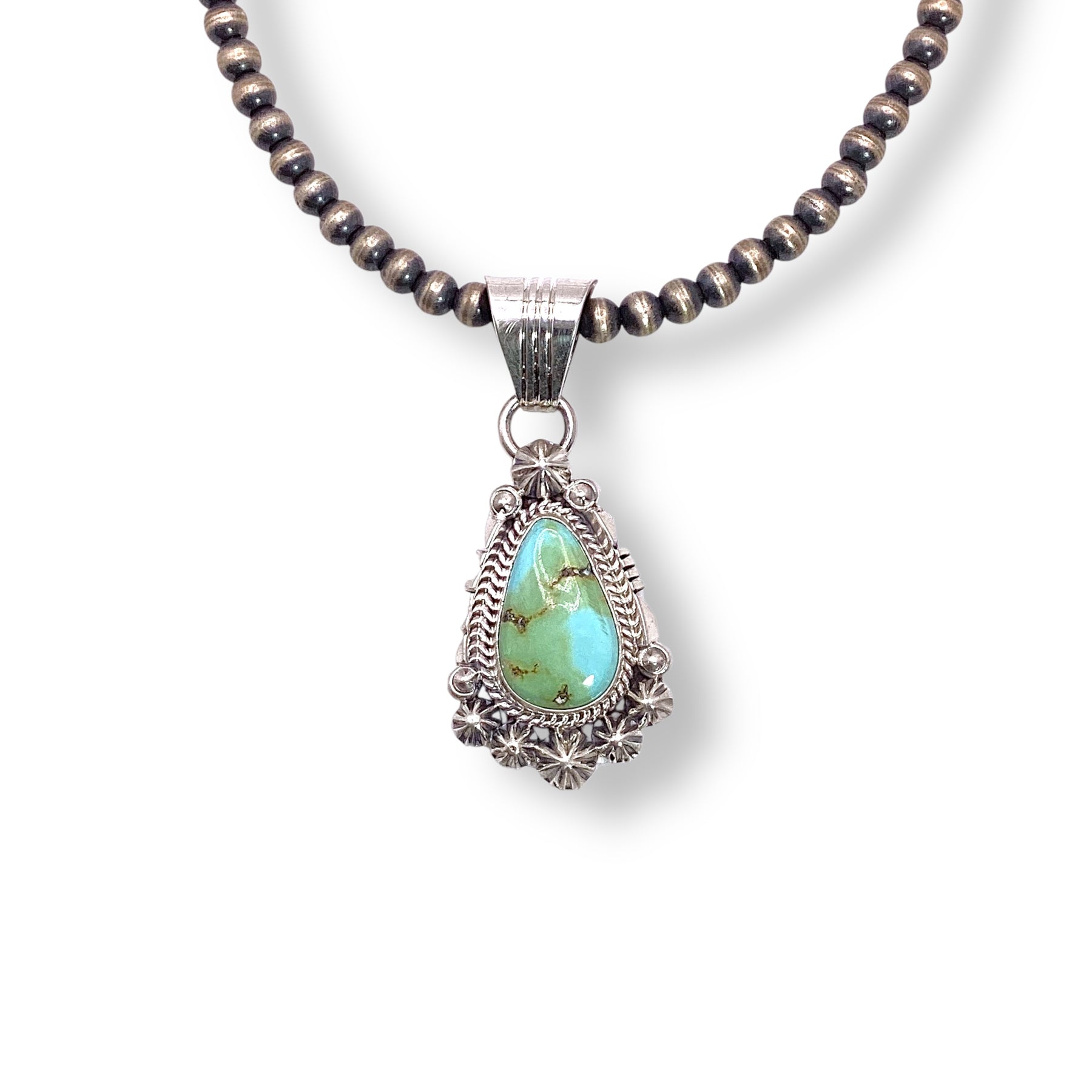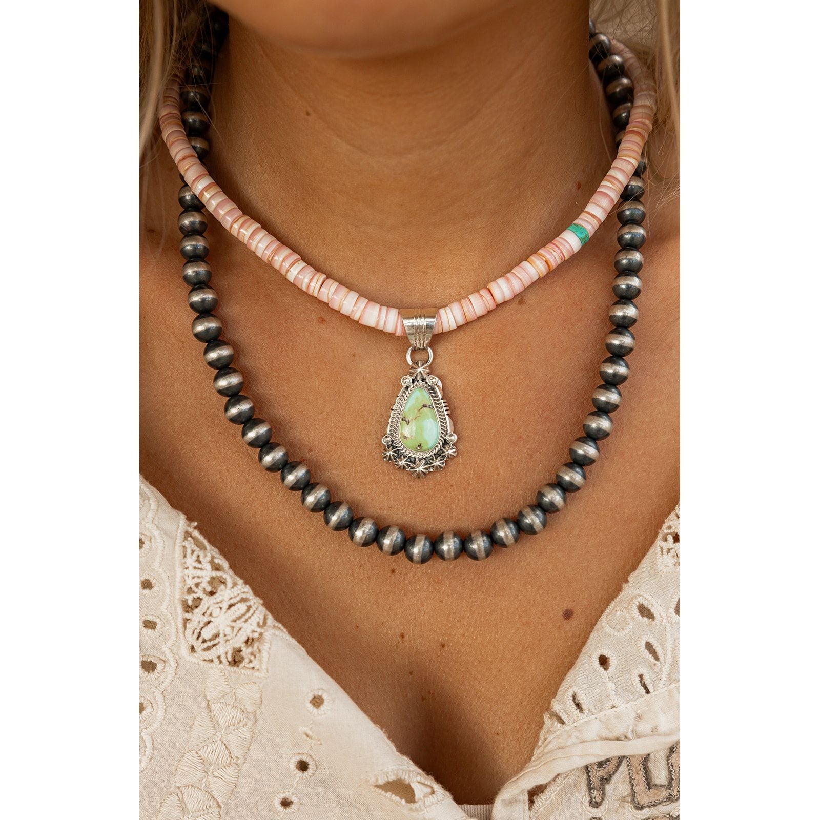 This Sonoran Gold Turquoise pendant by Navajo artist Marita Benally captivates with its rich golden tones set in a smooth sterling silver bezel. The intricate silverwork surrounding the stone adds a mesmerizing, handcrafted elegance.