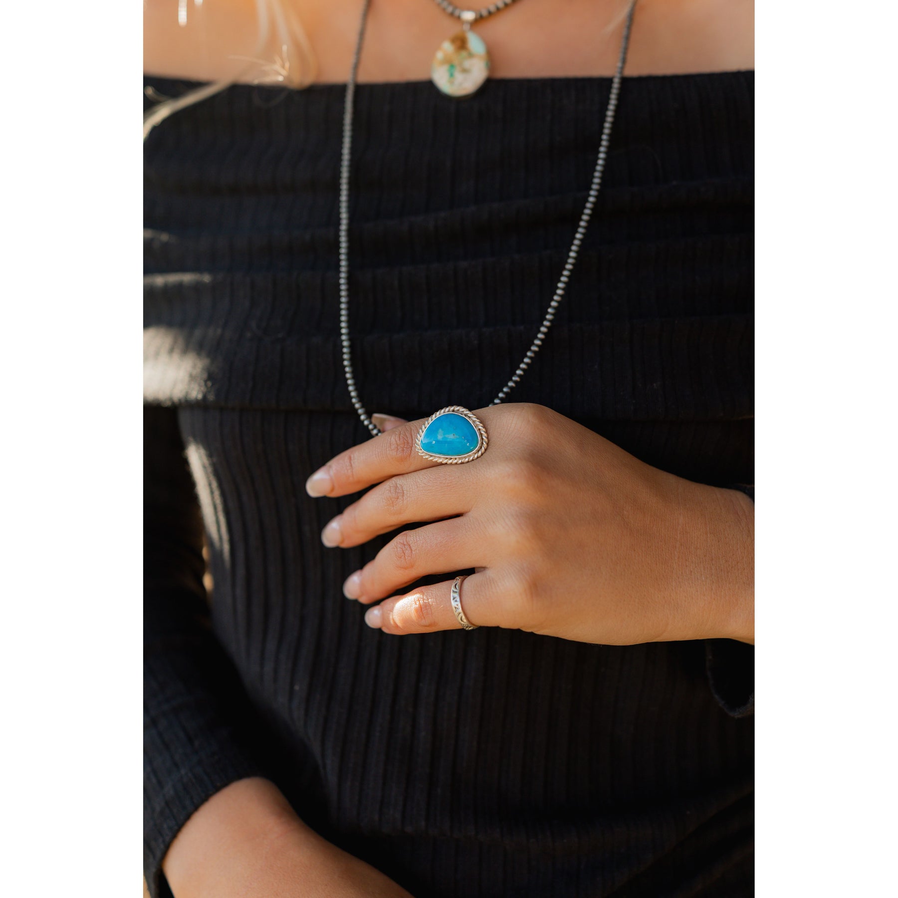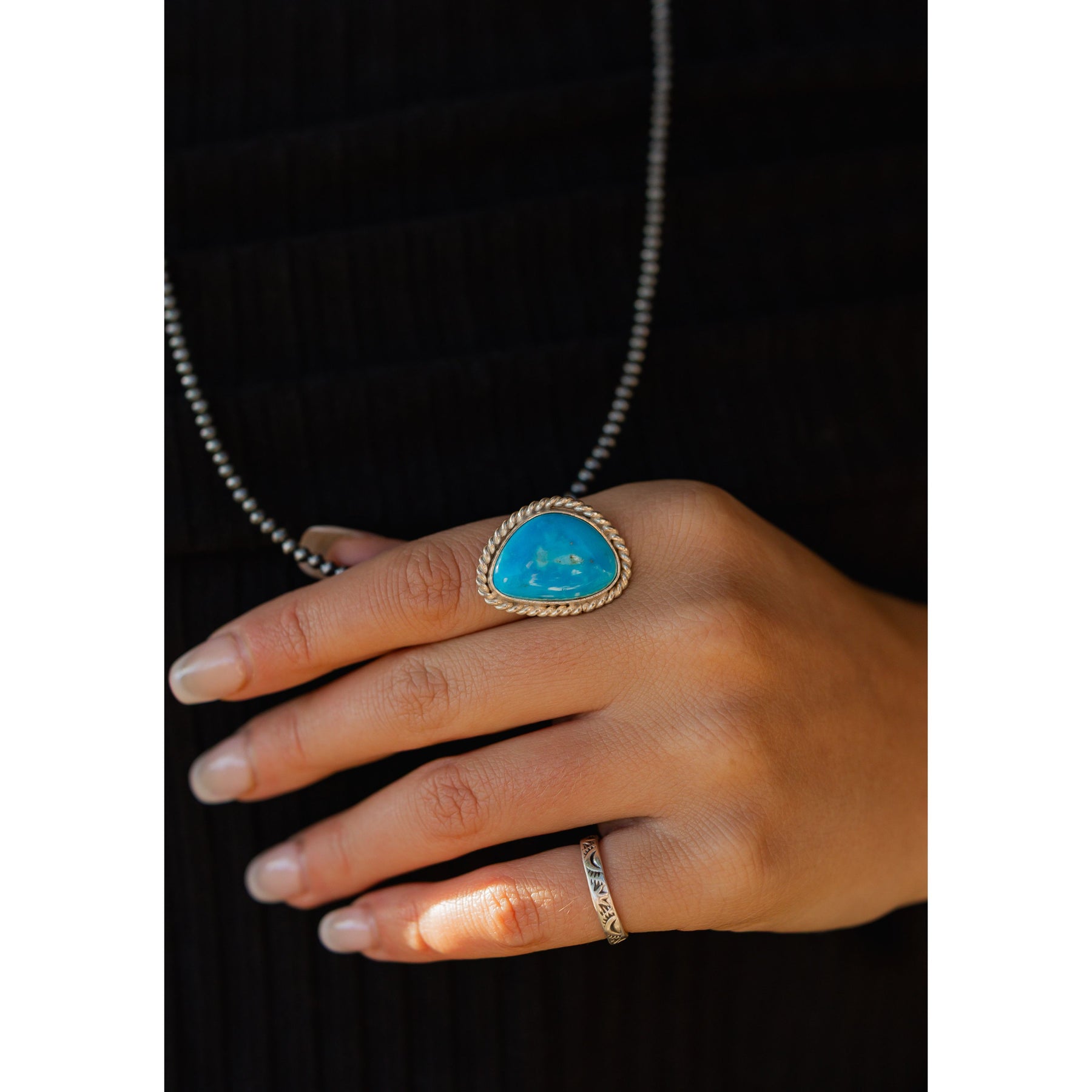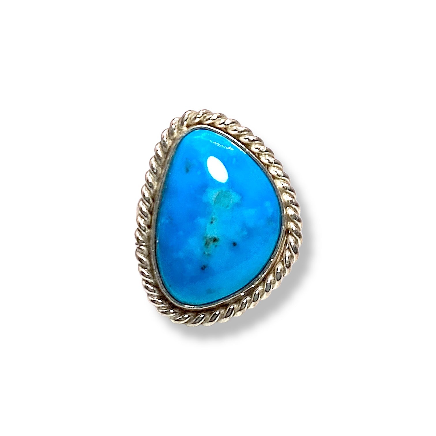 This Number 8 Turquoise ring features a rich, earthy stone set in a smooth sterling silver bezel, surrounded by delicate rope detailing. Handcrafted by Michael Silberhorn, it exudes classic Southwestern charm with a timeless, rugged elegance.