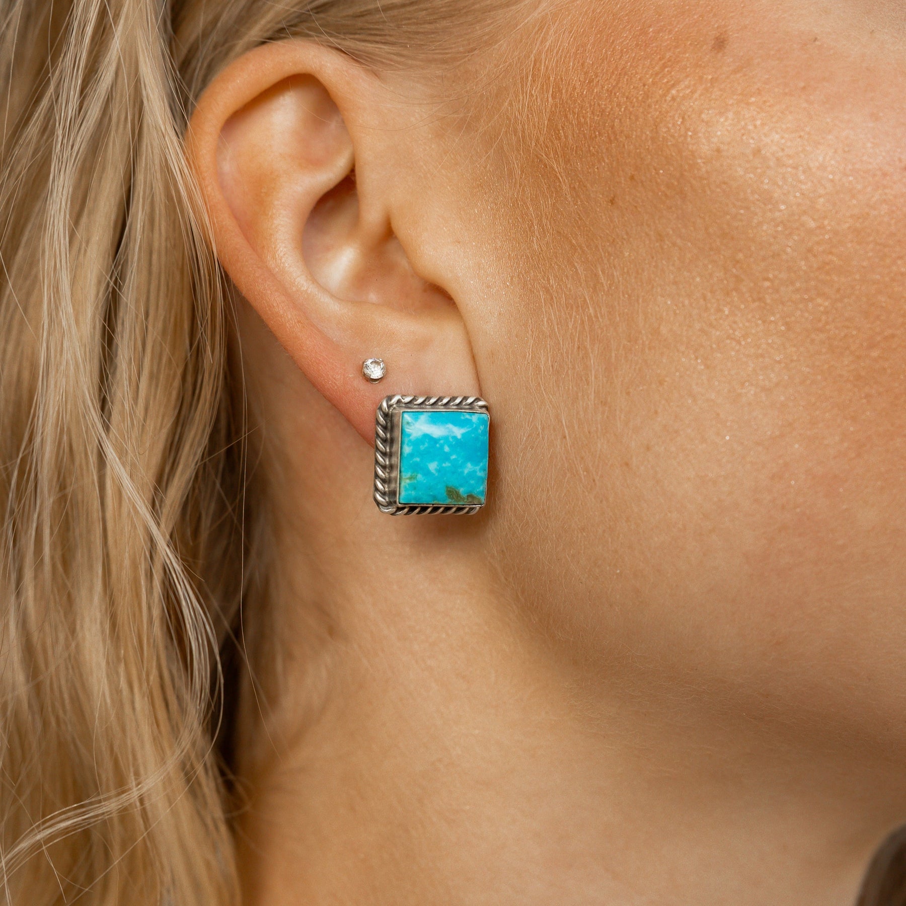 Expertly crafted Native American-made square Kingman turquoise studs in sterling silver. These stunning earrings feature rare, high-quality turquoise that is difficult to find, making them a unique addition to your collection.