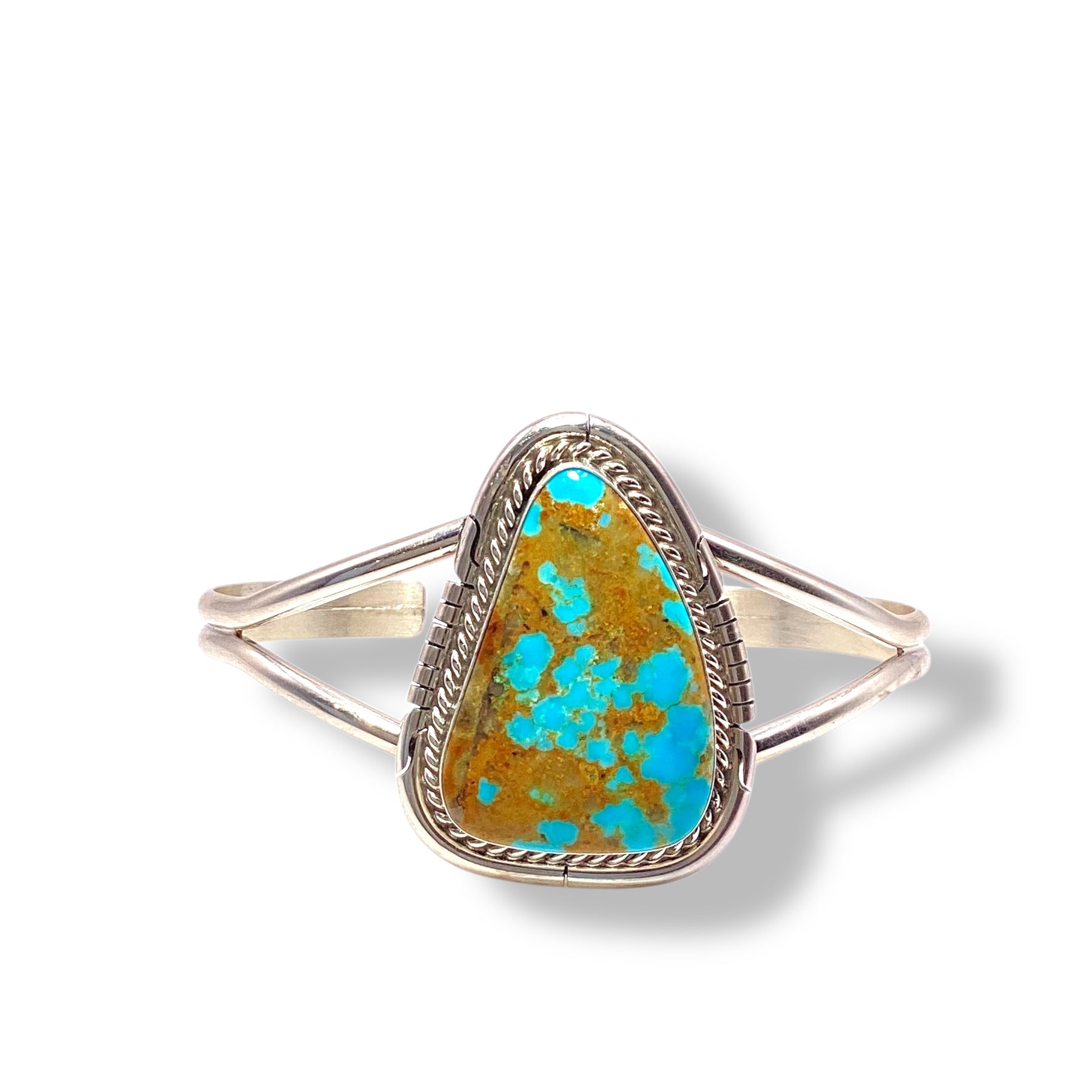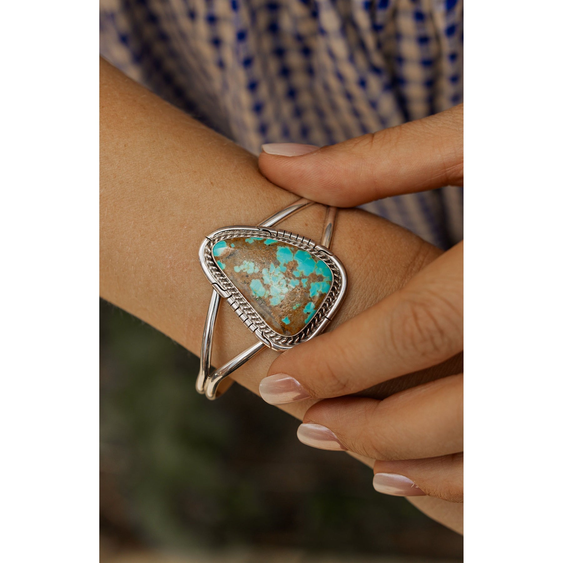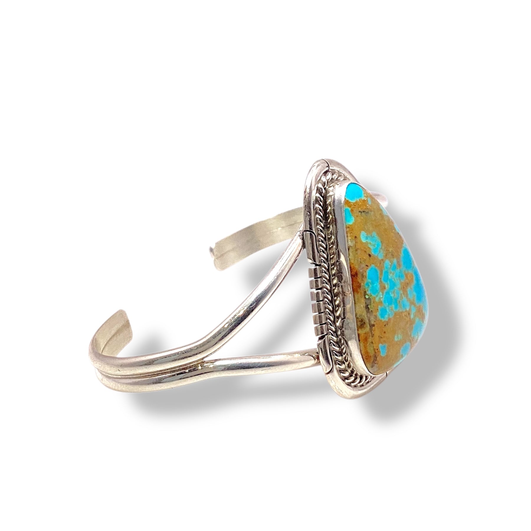 A bold, chunky turquoise stone in earthy teal with rich brown matrix takes center stage in this handcrafted sterling silver cuff by Navajo silversmith Dave Skeets. Set in a smooth bezel and bordered with classic silver braid detailing, it’s a timeless piece and a little rugged.