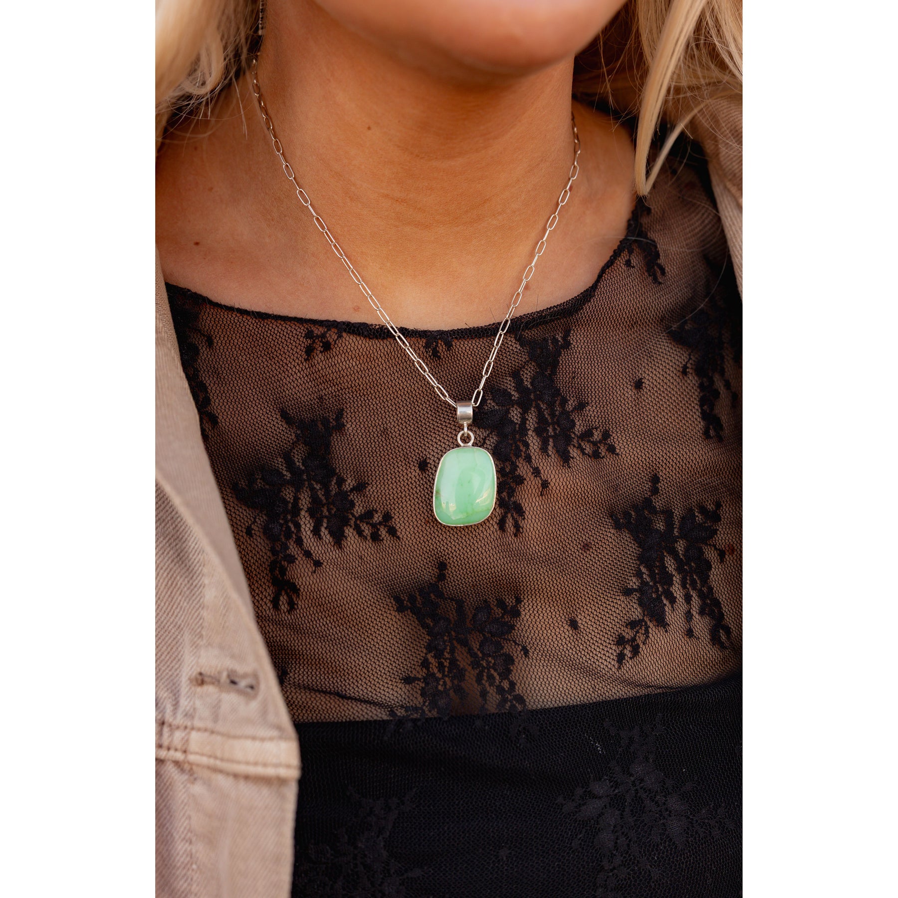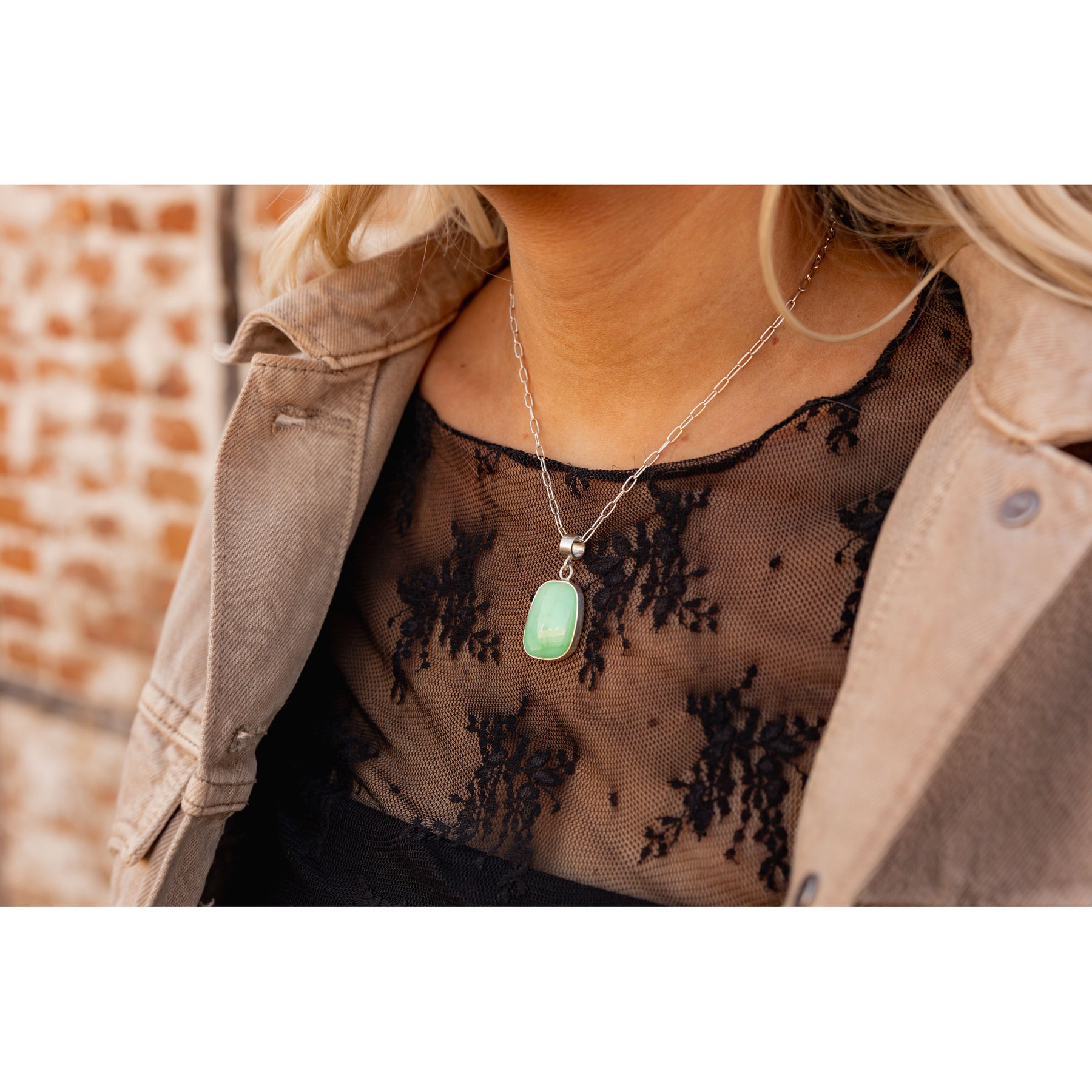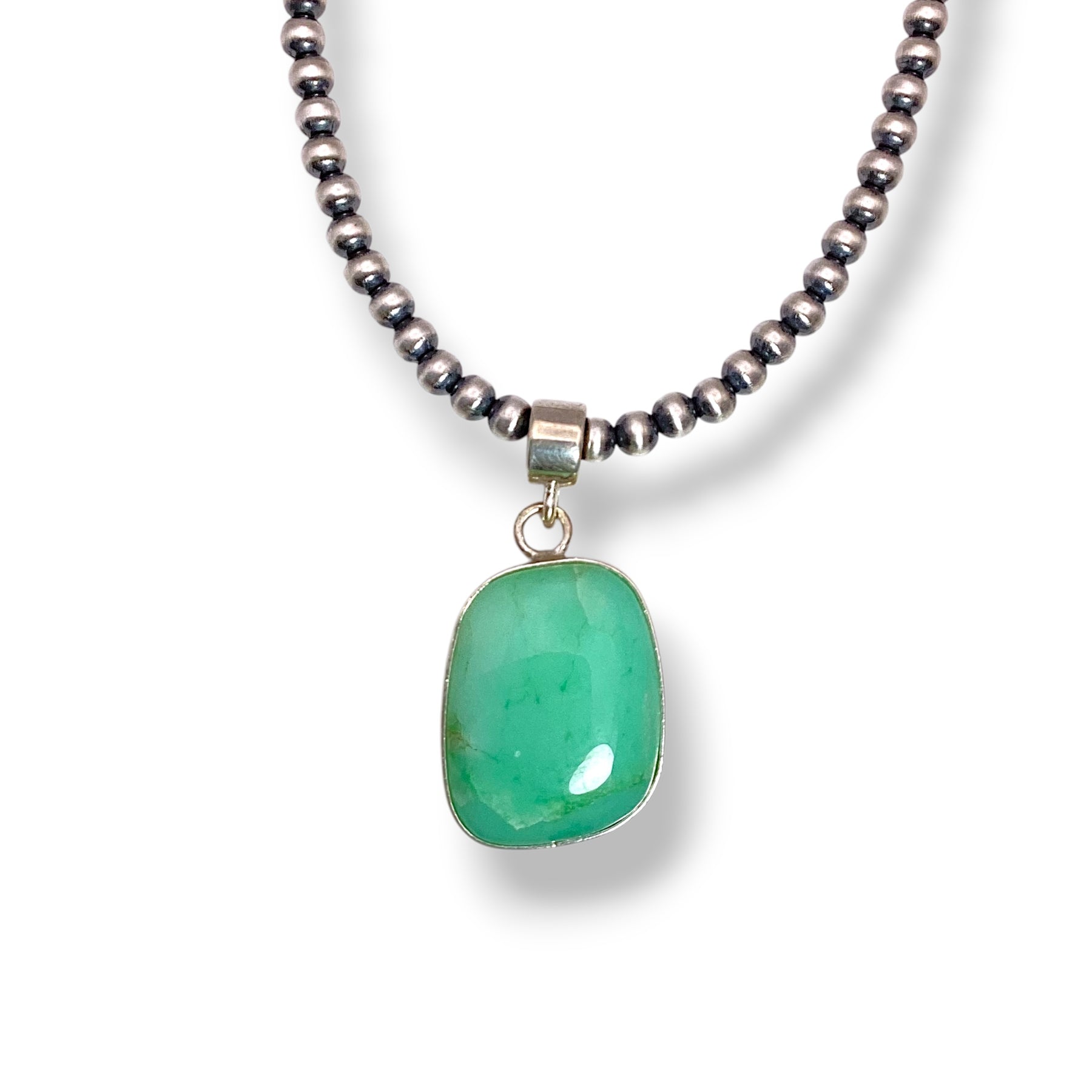 A gorgeous chrysoprase. Chrysoprase actually sells for more per carat than some turquoise varieties, so it is neck-and-neck in value. We absolutely love layering the two stones together. And you will fall in love with this southwestern gem-it gleams.