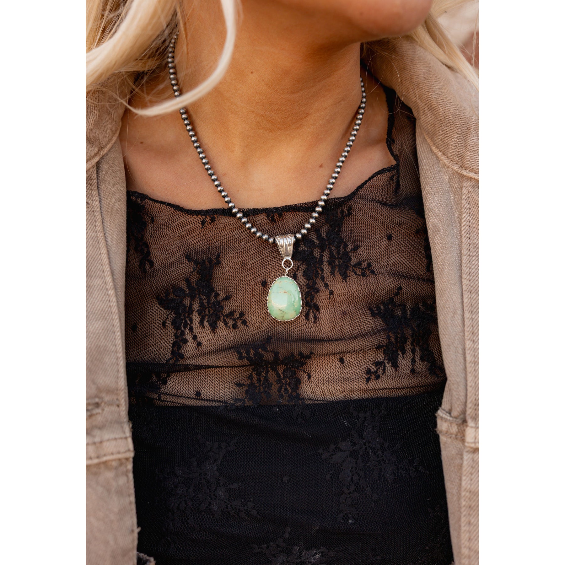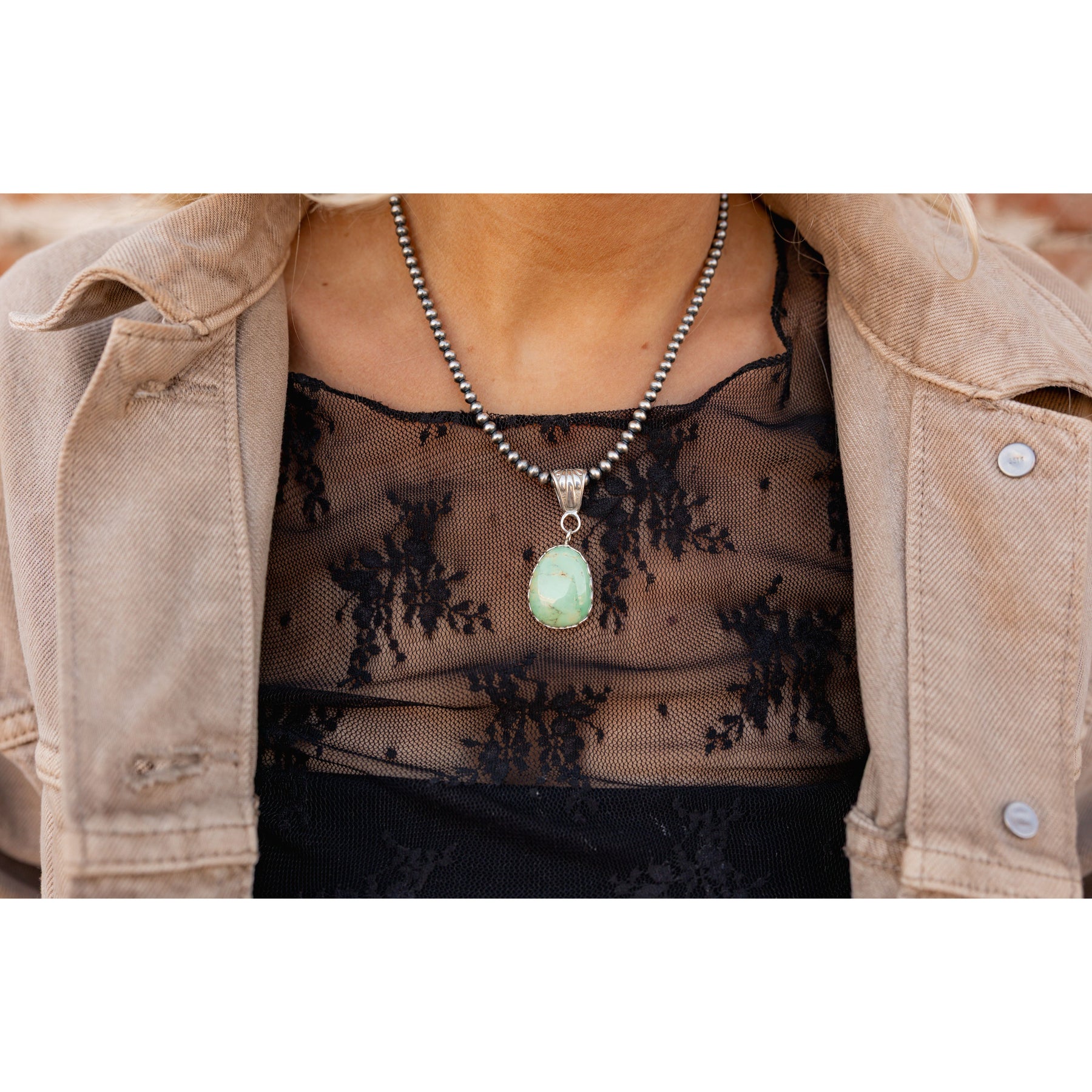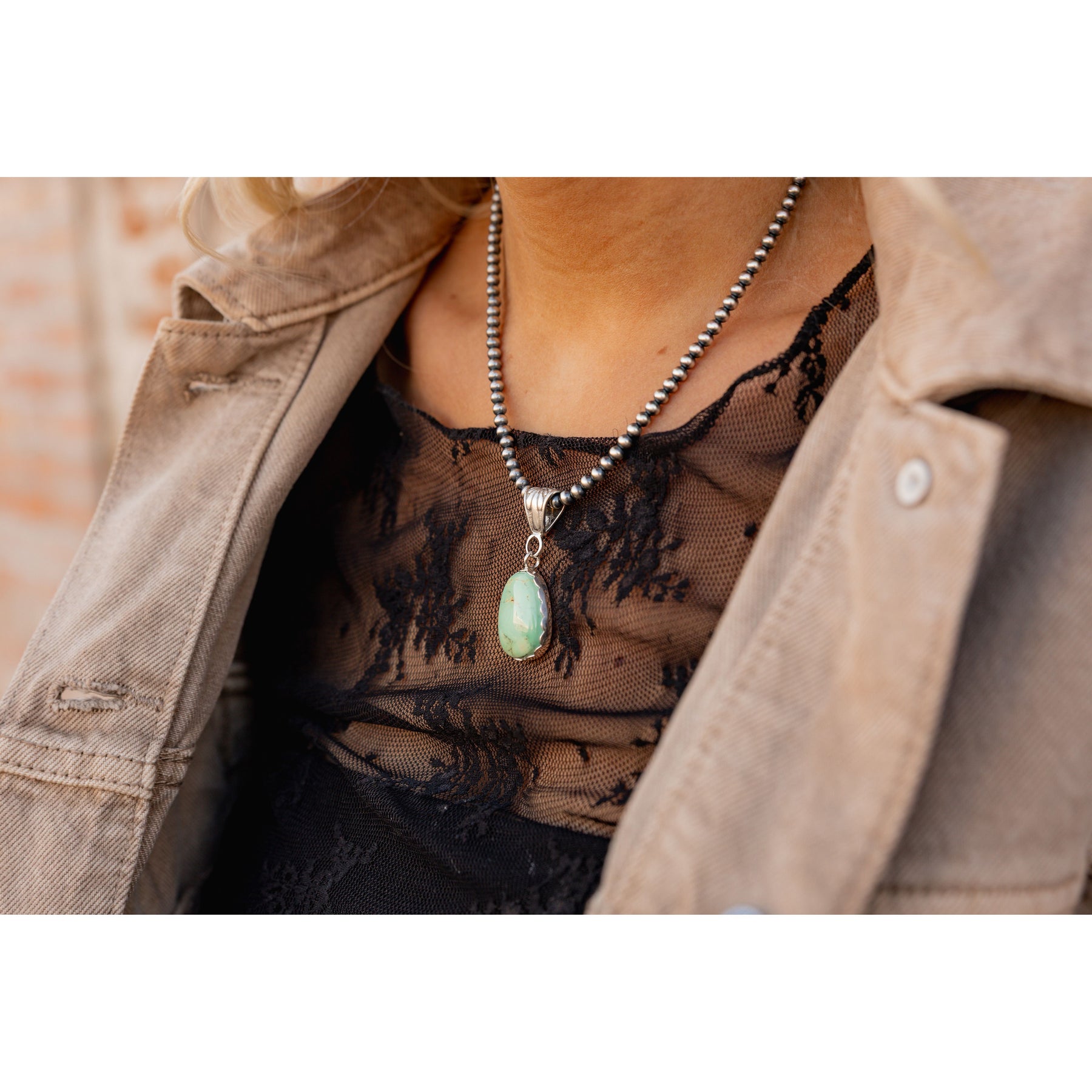 A gorgeous Royston in the creamiest green we have seen lately. A pendant also made by Michael Silberhorn—soft, earthy elegance in a stone everyone reaches for.
