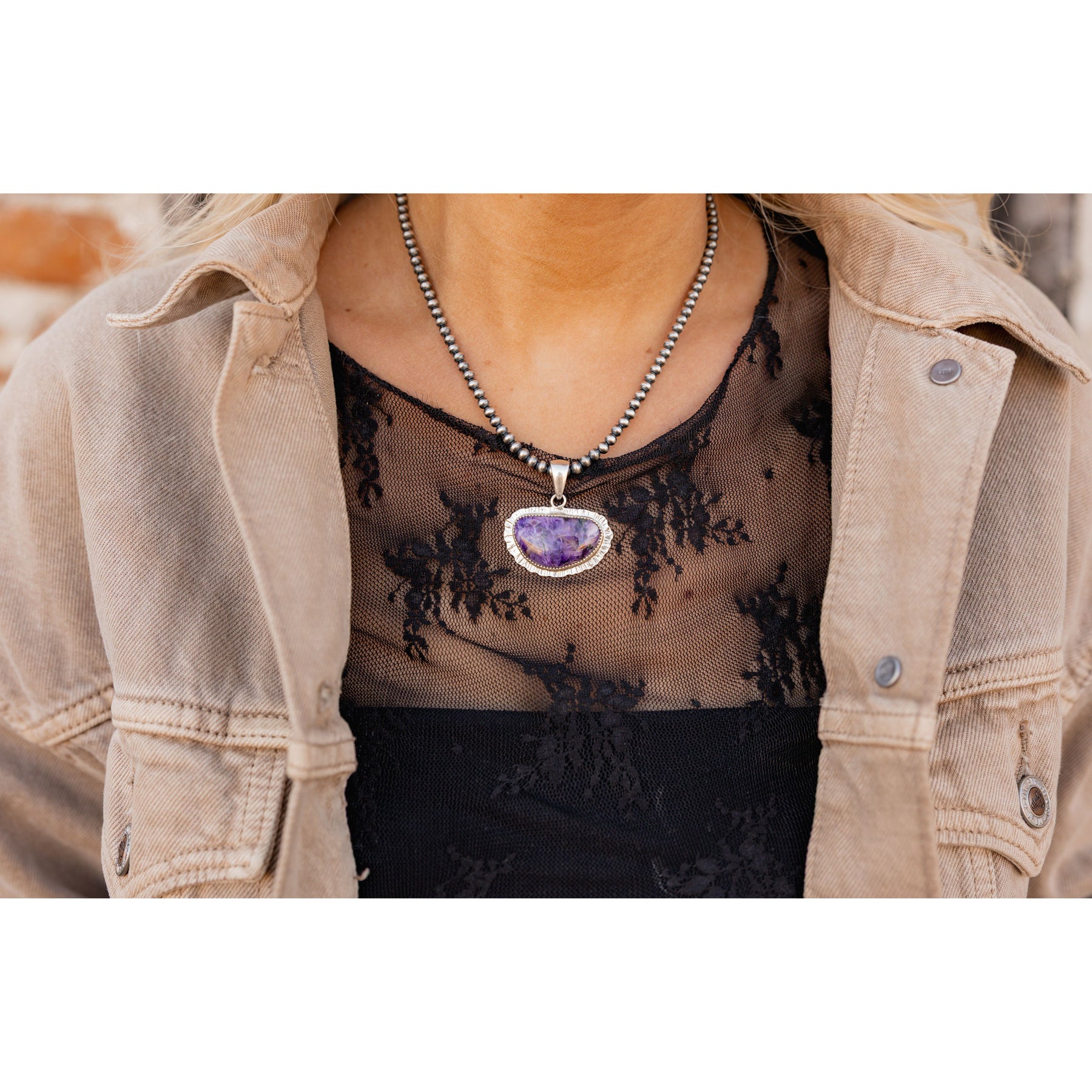 Remember the half moon, and you will remember this beautiful purple charoite. Maybe not a blue moon, but definitely stunning nonetheless. This pendant is everything—set in a smooth silver bezel with a shiny, pleated background.