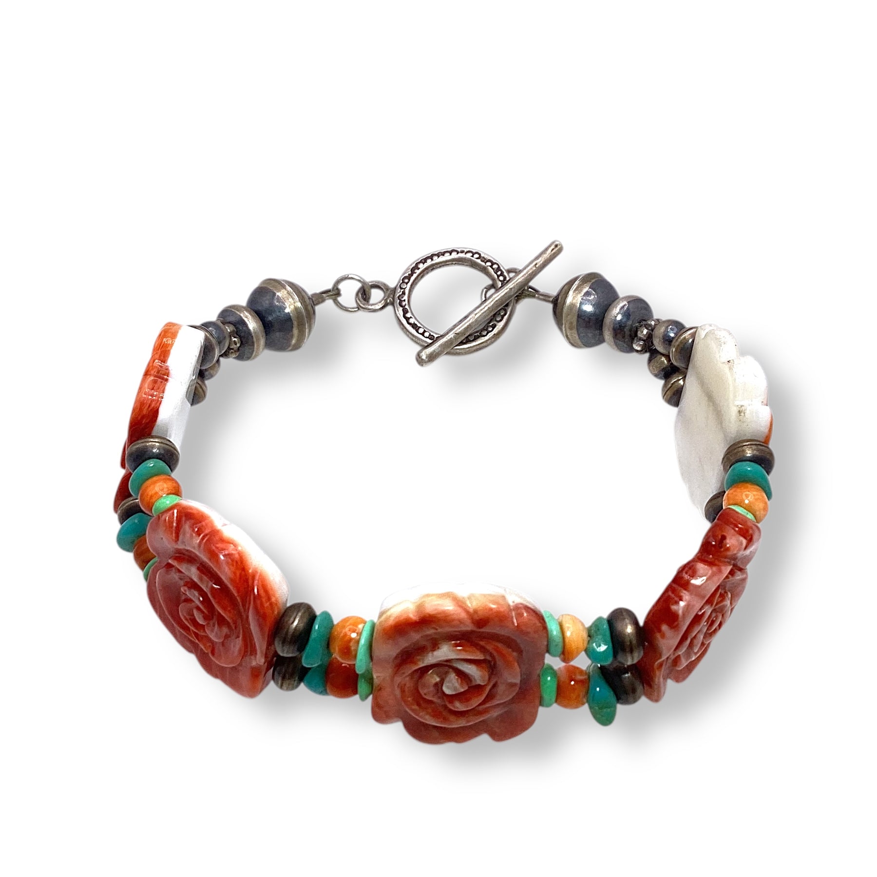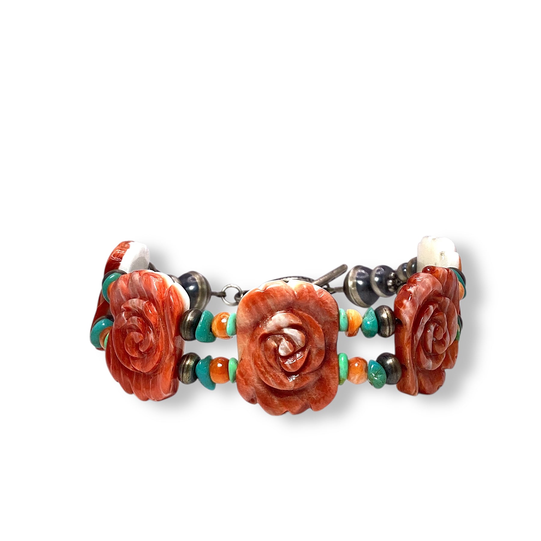 Spiny Oyster Shell Rose Bracelet With Turquoise And Navajo Pearl Sterling Silver