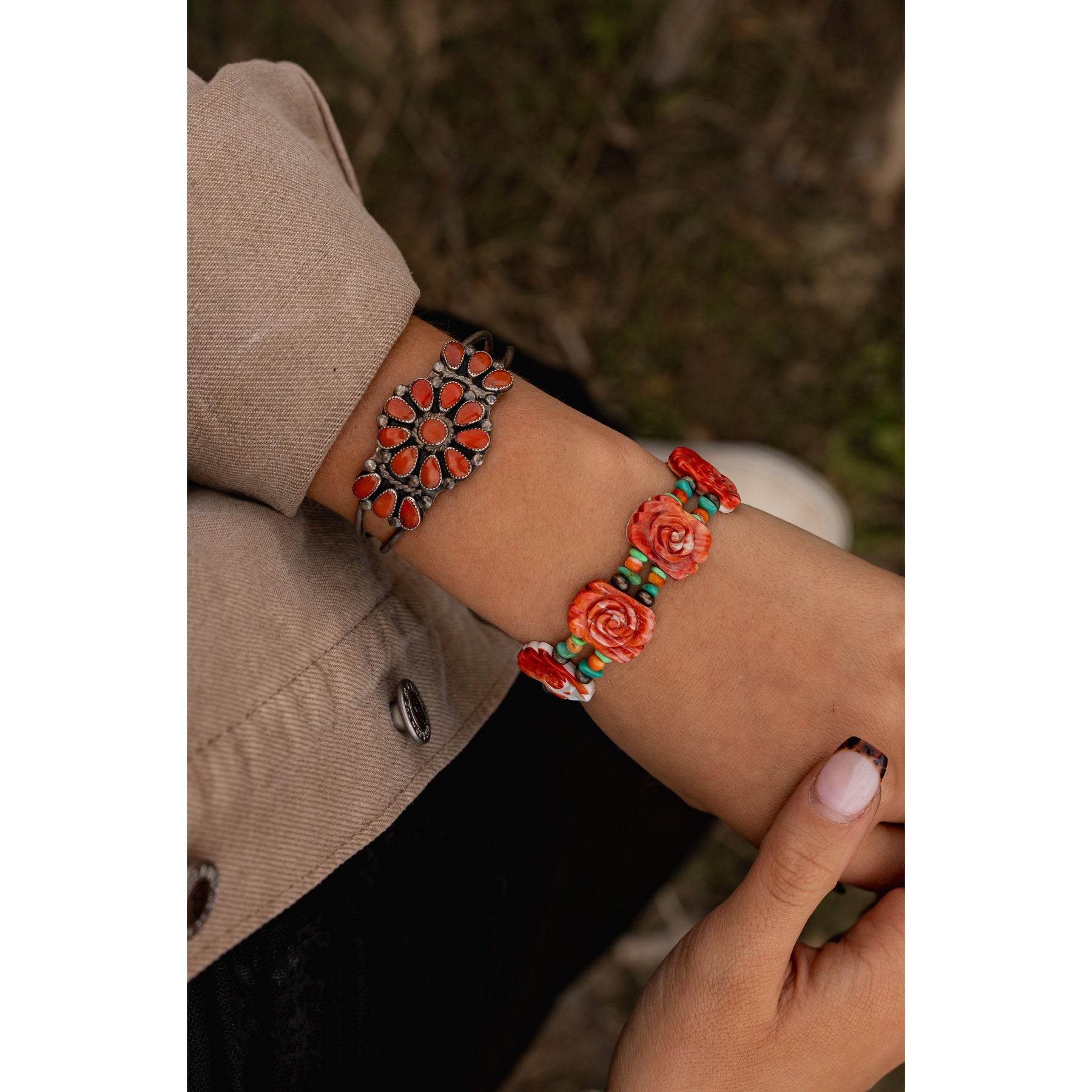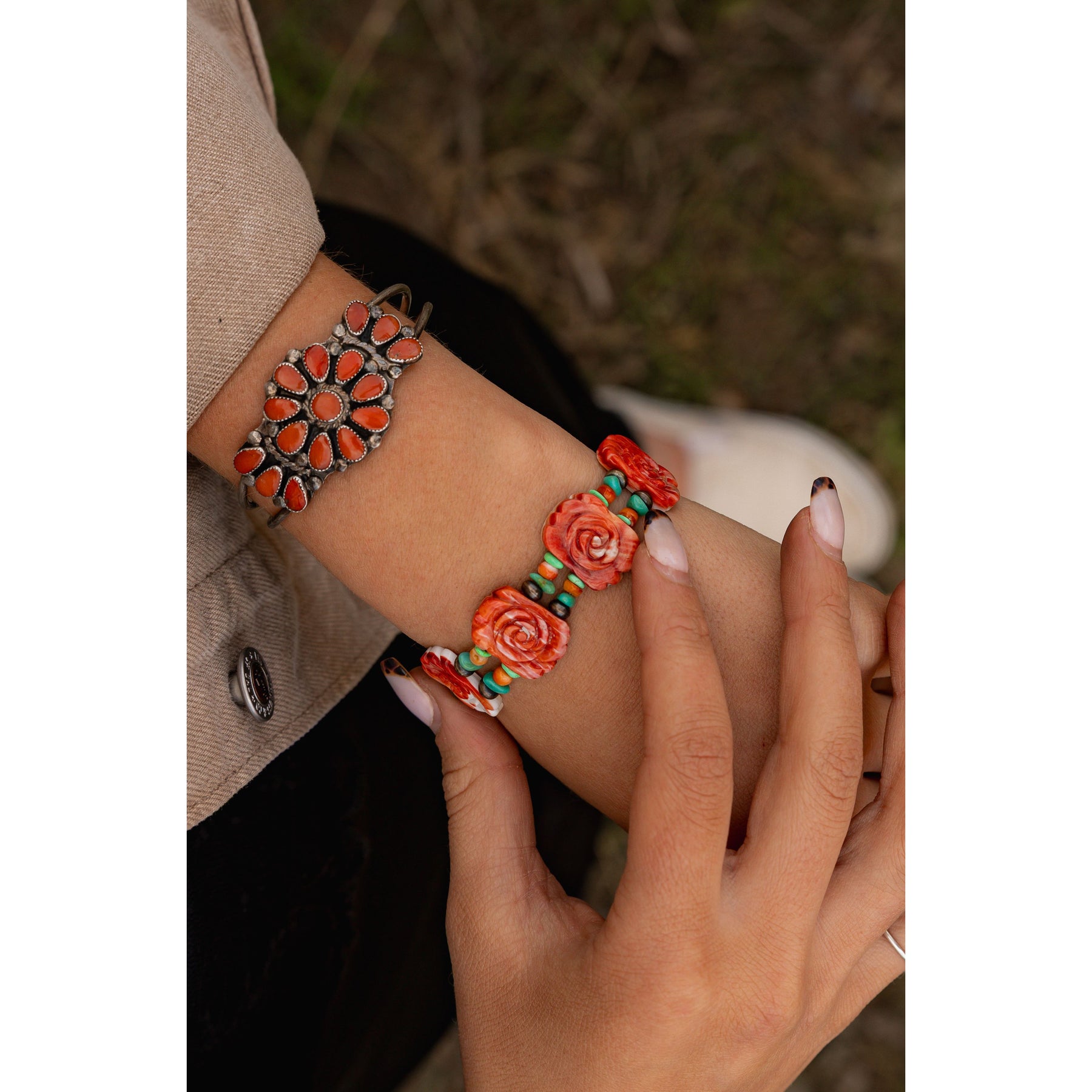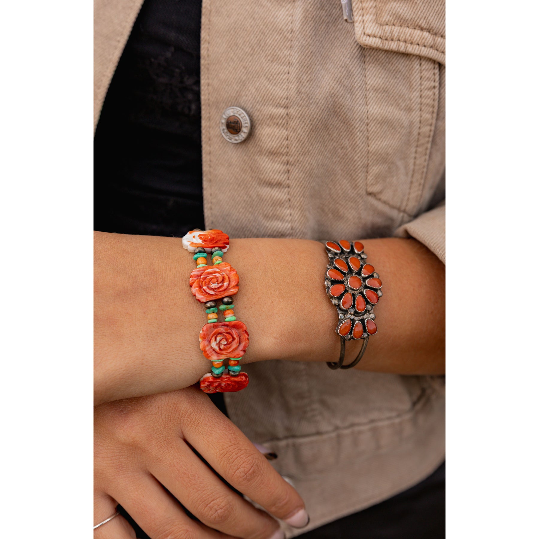 A dreamy blend of desert charm and artisan romance, this handcrafted bracelet features delicate Spiny Oyster Shell rose beads paired with vibrant turquoise and classic Navajo pearls. Each element is strung together in sterling silver, creating a soft yet striking piece that feels like a little piece of the Southwest wrapped around your wrist. Sweet, soulful, and full of color—it's the perfect balance of earthy and feminine.